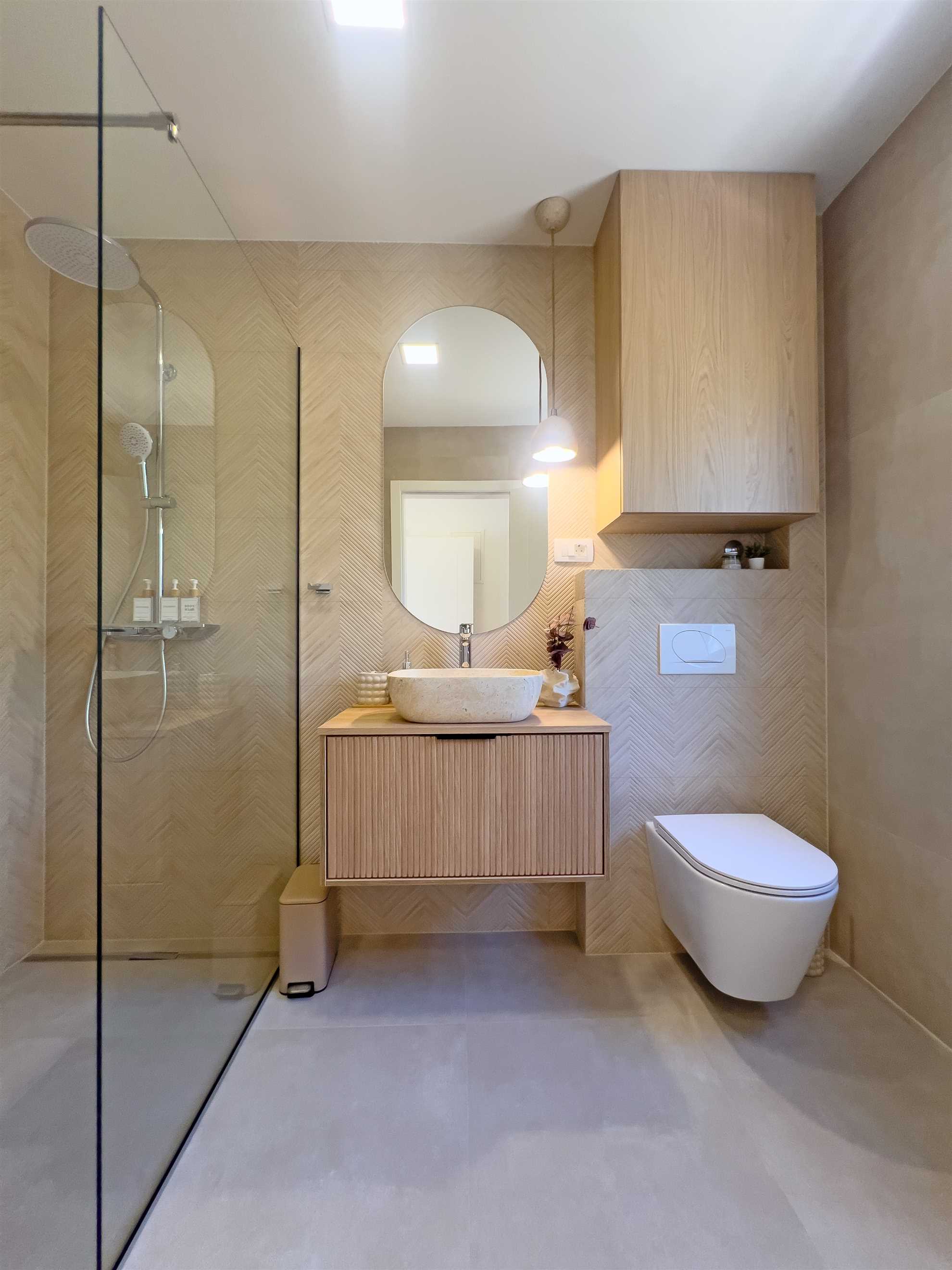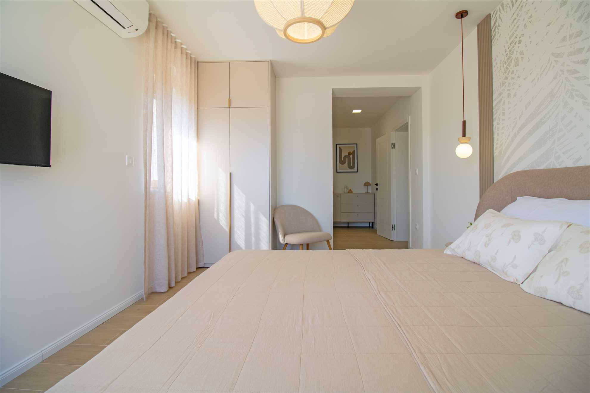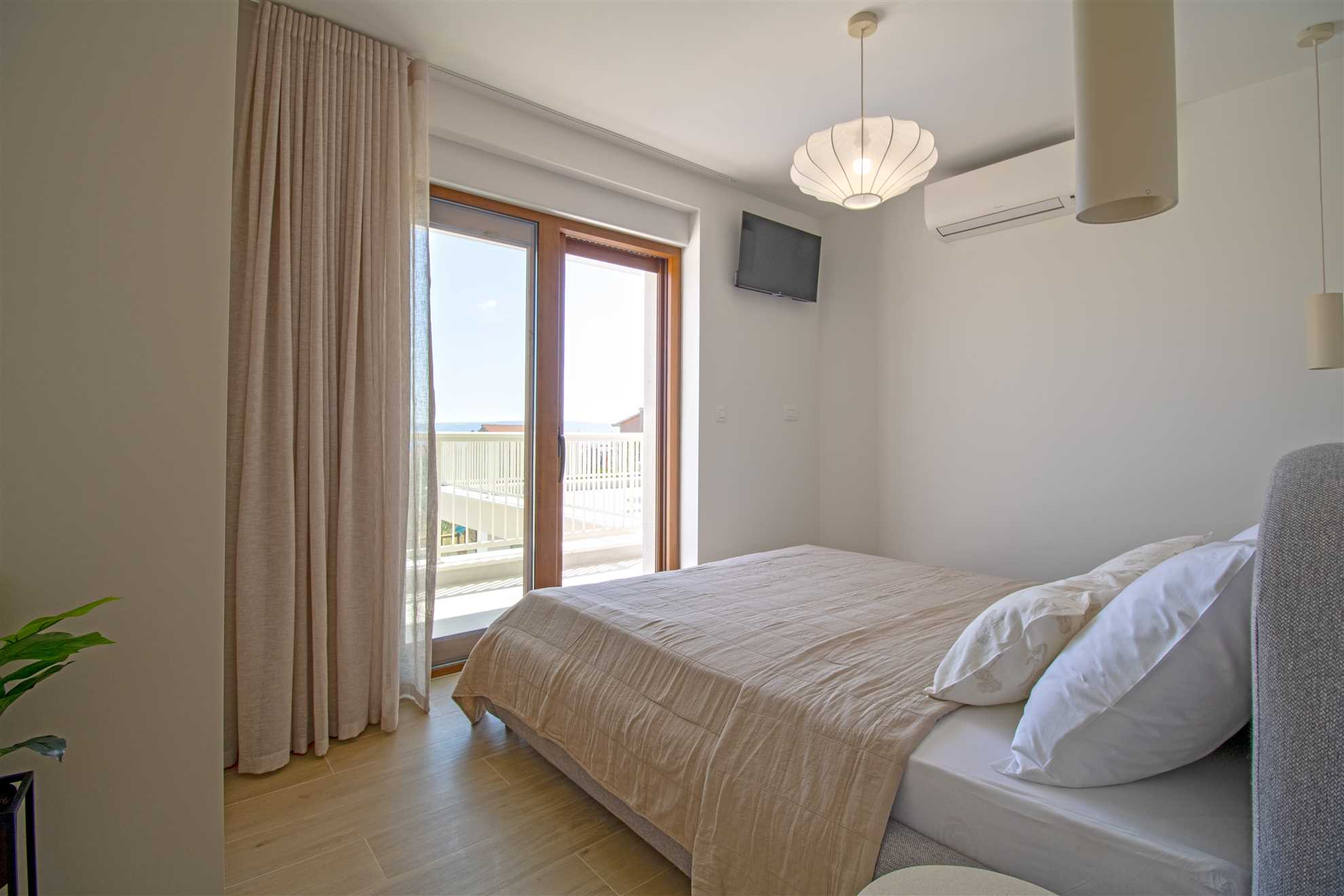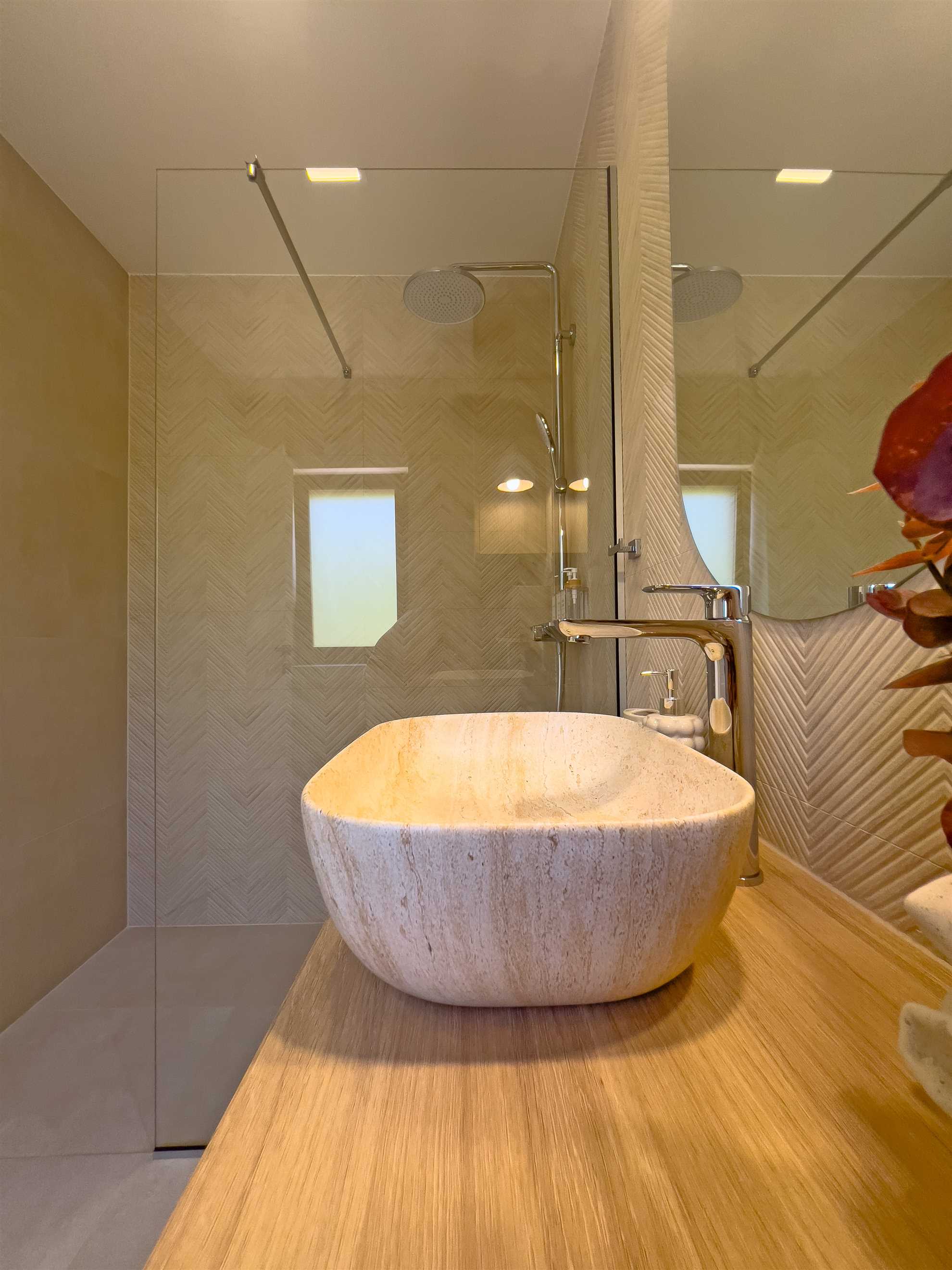 Upstairs, there are three comfortable bedrooms, each with a 160×200 cm bed and a private en-suite bathroom with walk-in shower. The upper floor also offers access to a shared balcony with sea views.