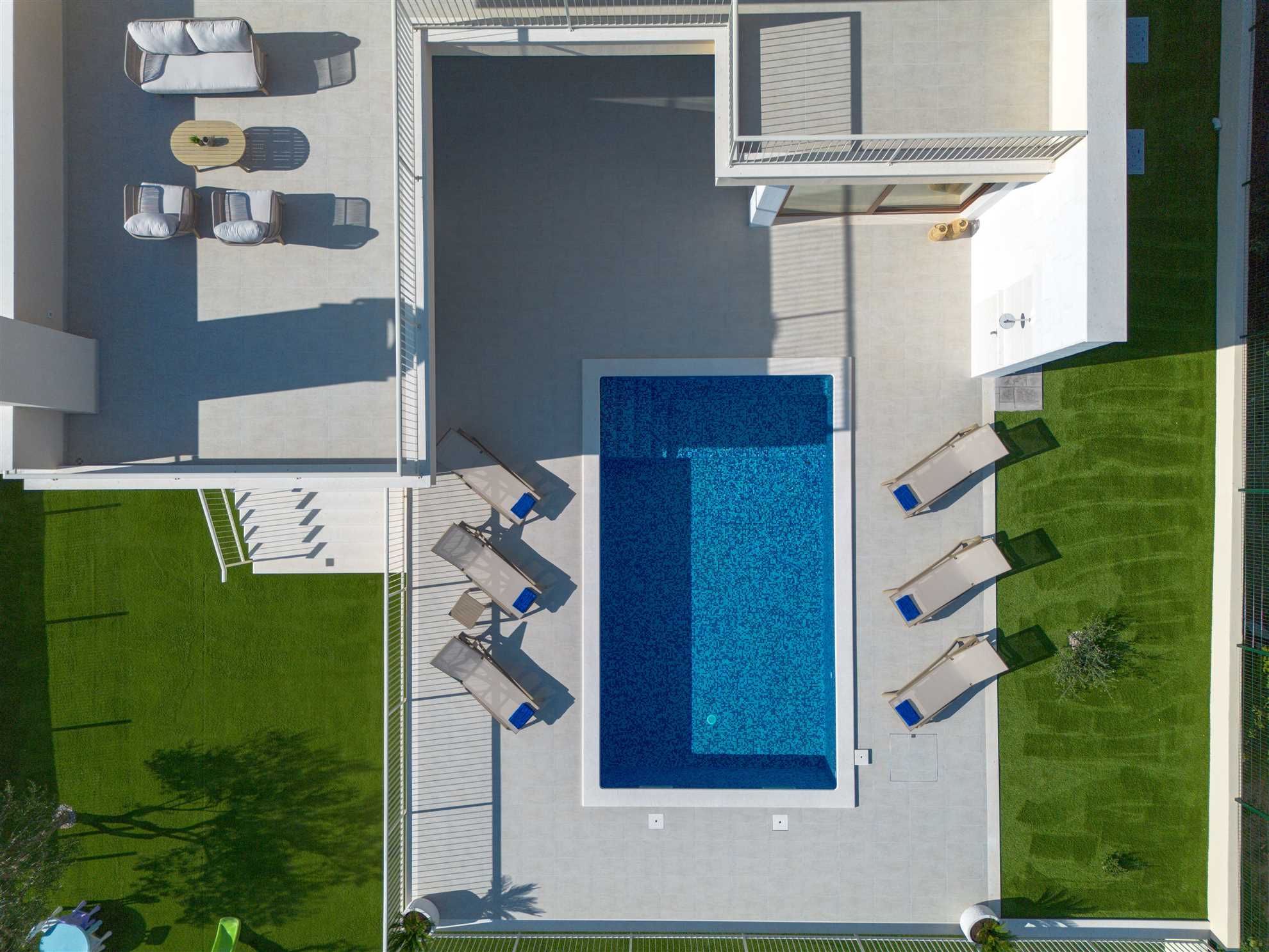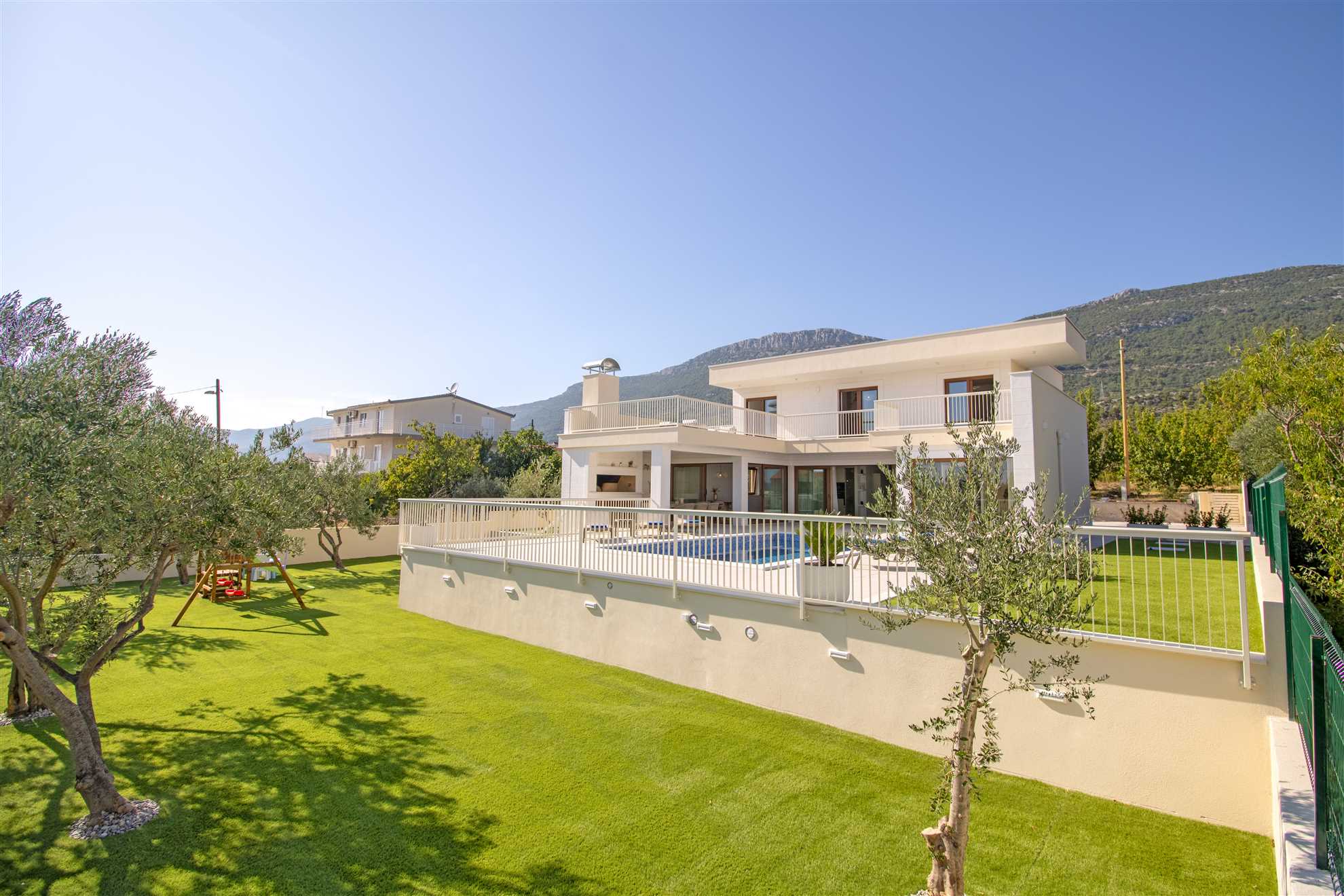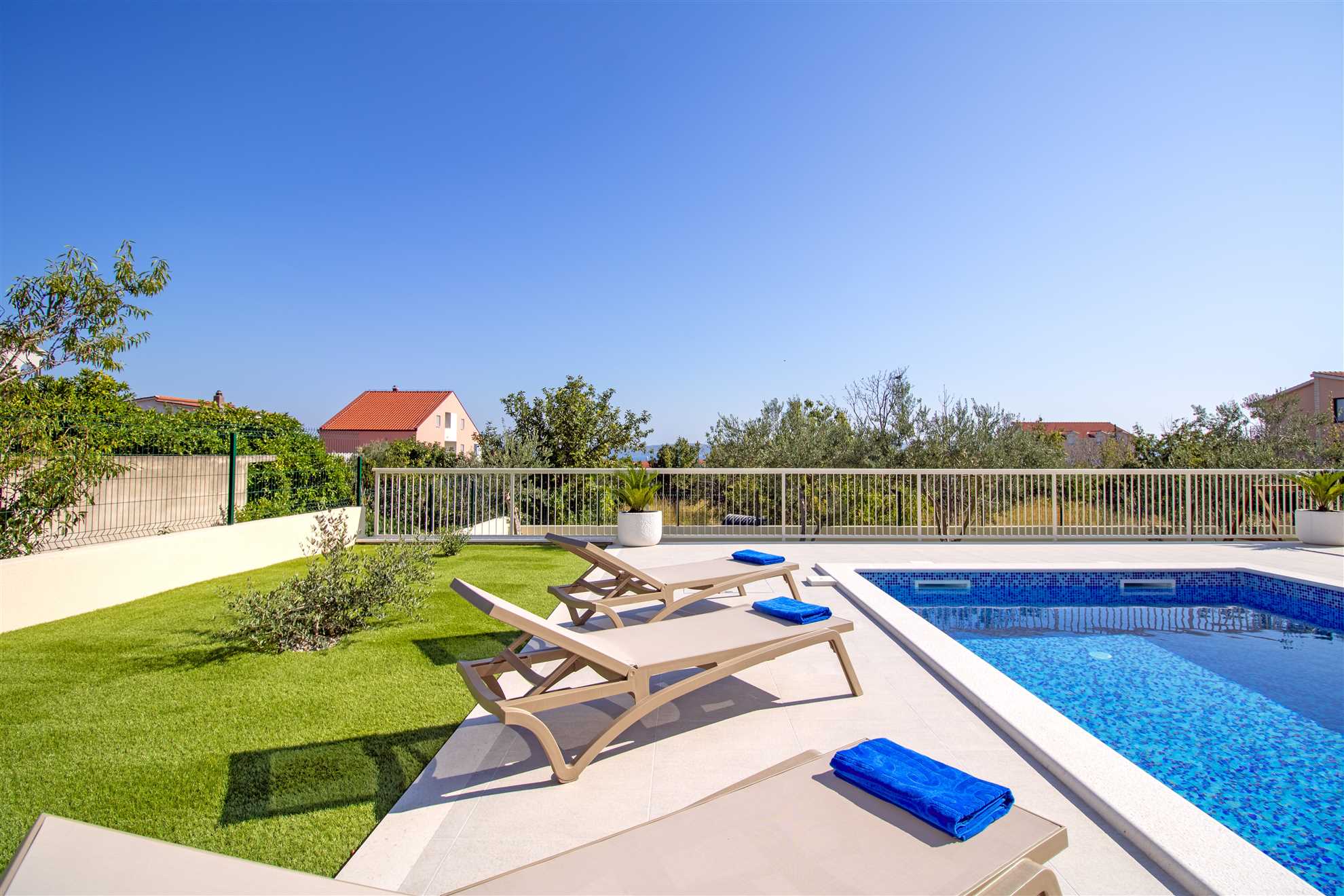 Set on an 800 m² private property with 170 m² of interior space, the villa accommodates up to 8 guests and is ideal for families or groups of friends looking for a villa near Split with pool and wellness facilities.
