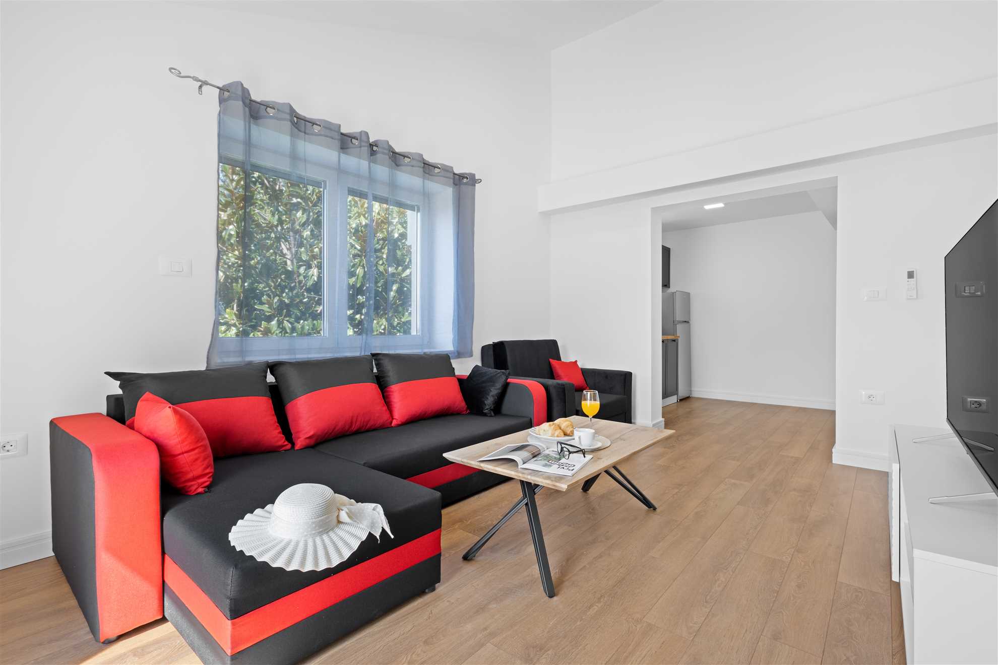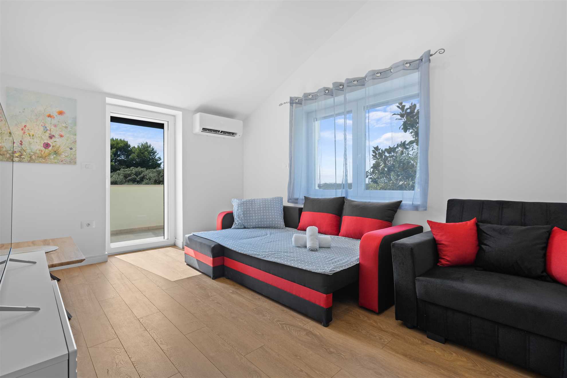 Each apartment features a fully equipped kitchen with a dishwasher, stove, oven, fridge, coffee maker, and all necessary utensils. Bedrooms are comfortable and airy, living rooms include a sofa bed, and bathrooms are fitted with modern showers.