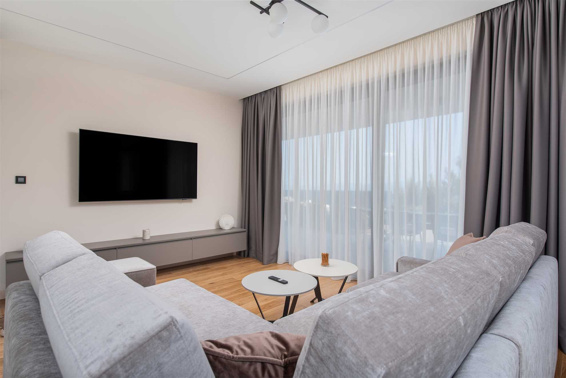 The spacious living room is bright and elegantly furnished, perfect for gathering, relaxing, or enjoying time together. Large windows bring in plenty of natural light and create a pleasant, open atmosphere.