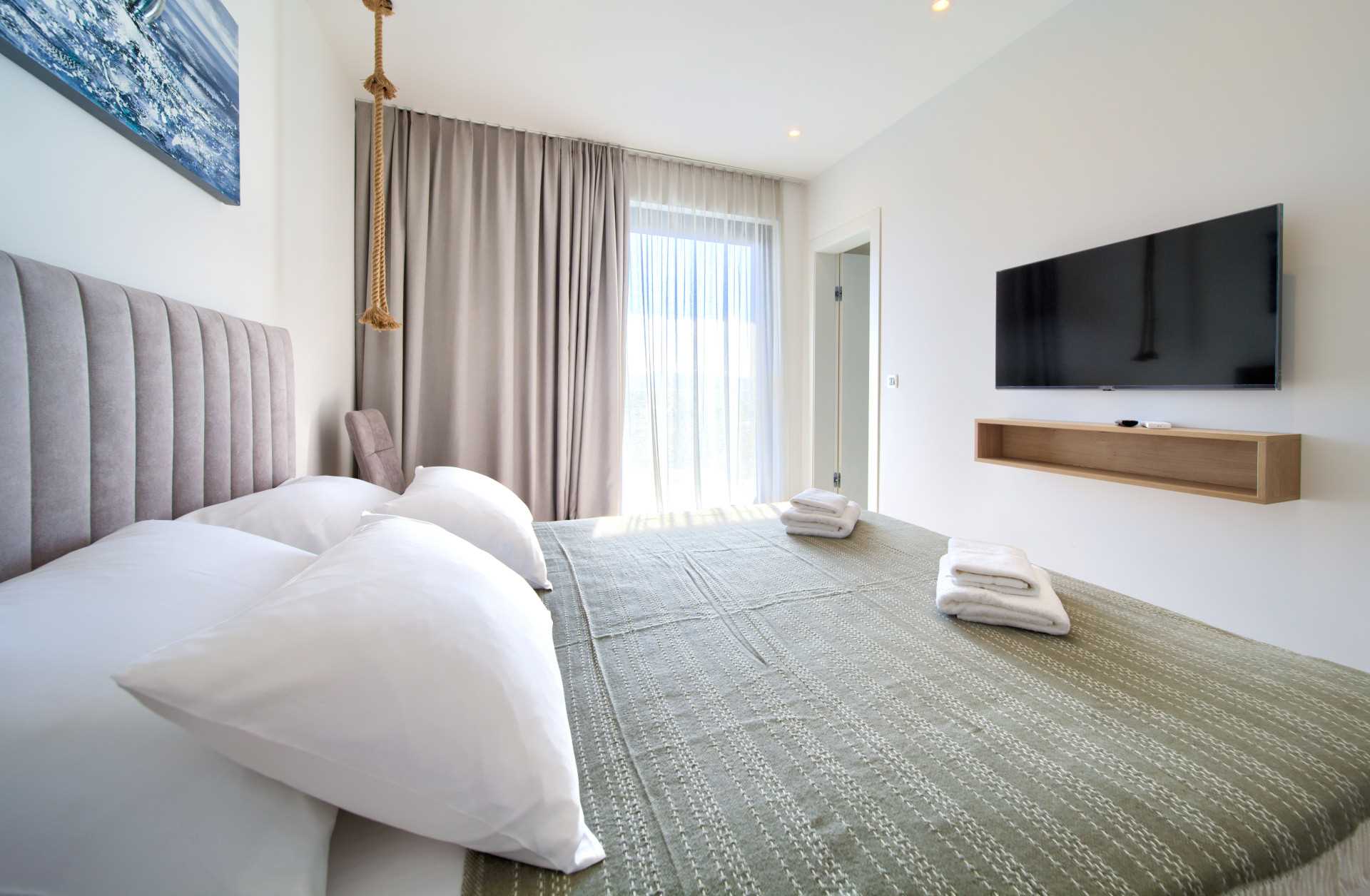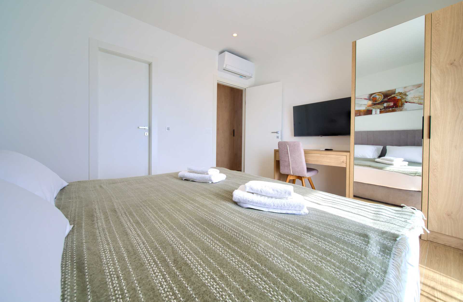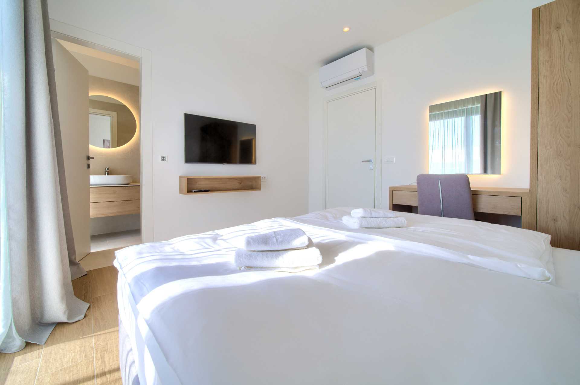 The villa has four spacious and luxuriously furnished bedrooms, each with its own modern bathroom, ensuring complete privacy and comfort for all guests. Three bedrooms are equipped with comfortable double beds, while one offers the option of two single beds, providing flexible sleeping arrangements. The villa is always prepared with fresh bed linen and soft towels, adding a sense of home and comfort.