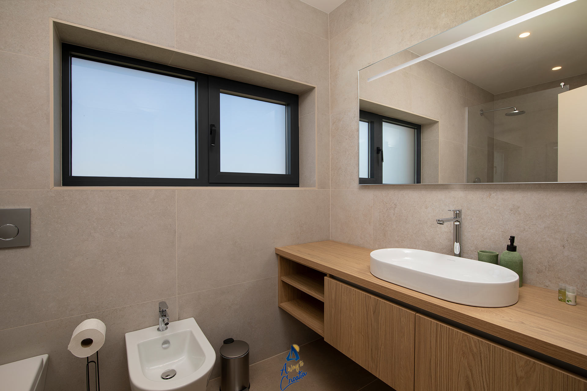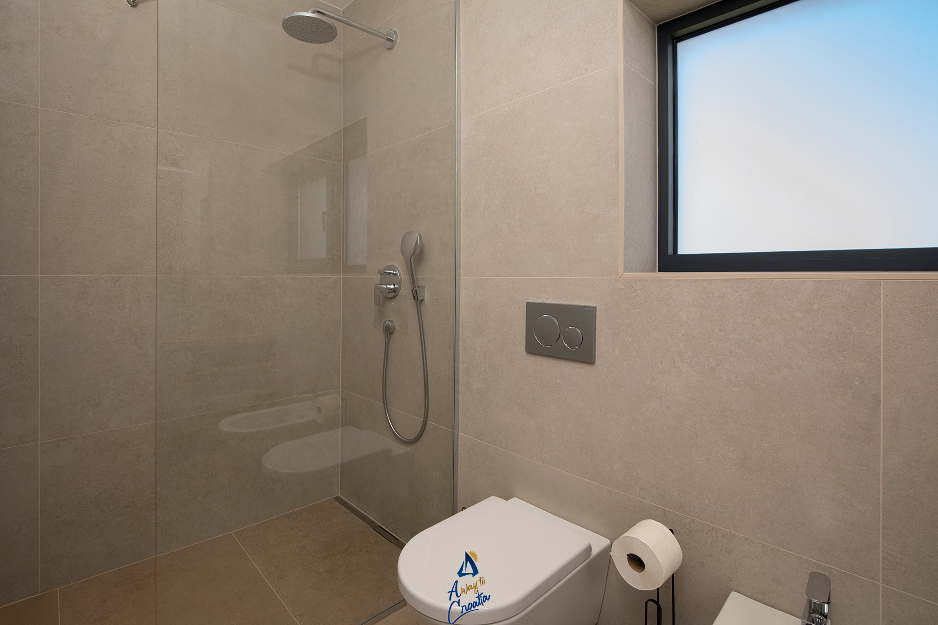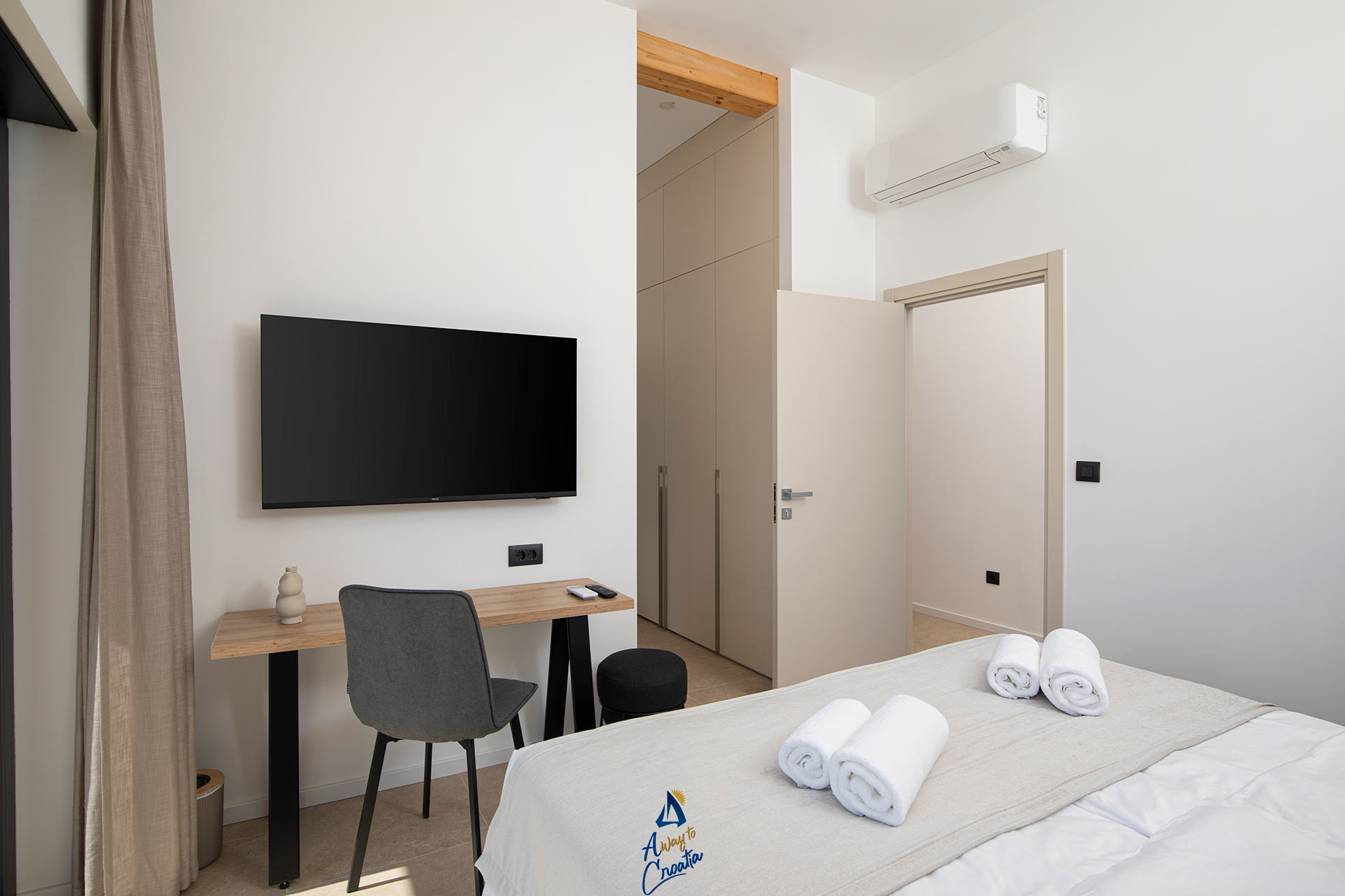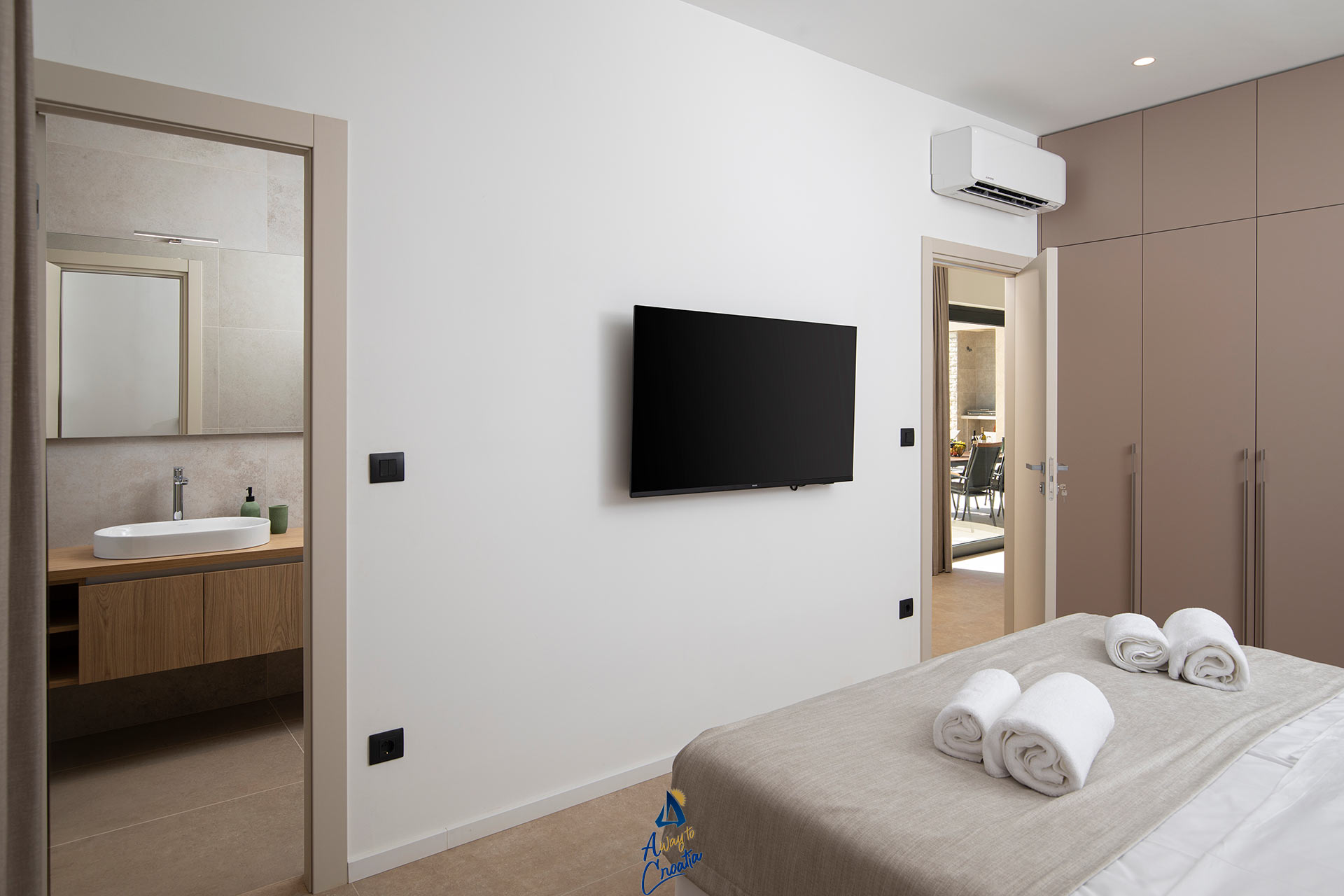 Inside, the villa features a bright living area with a fireplace, seamlessly connecting to the dining space and fully equipped kitchen, all overlooking the terrace, private 11 × 3.5 m swimming pool, and charming views of the surrounding olive groves. Entertainment is effortless with satellite TV and three Bluetooth speakers throughout the villa.
