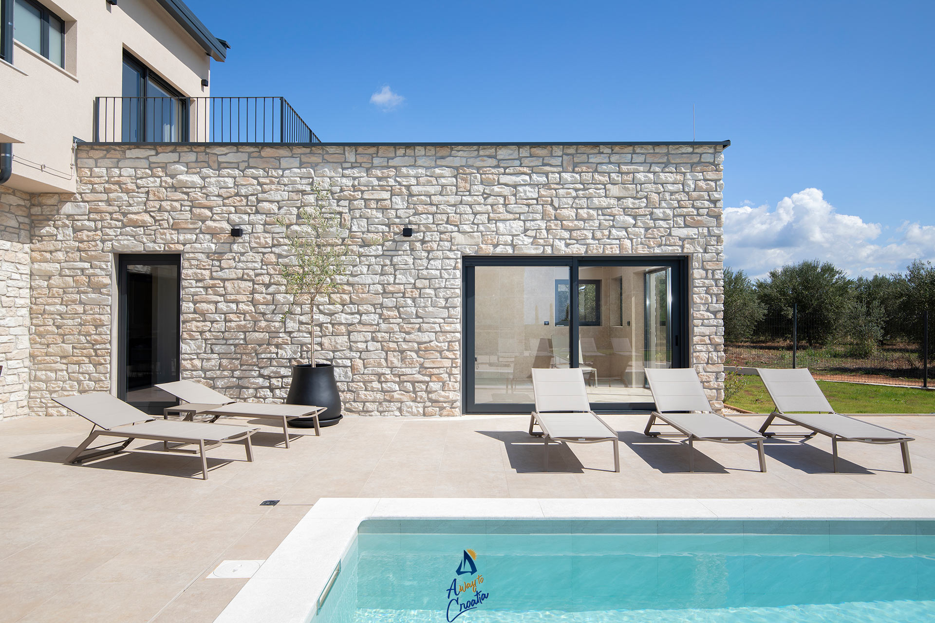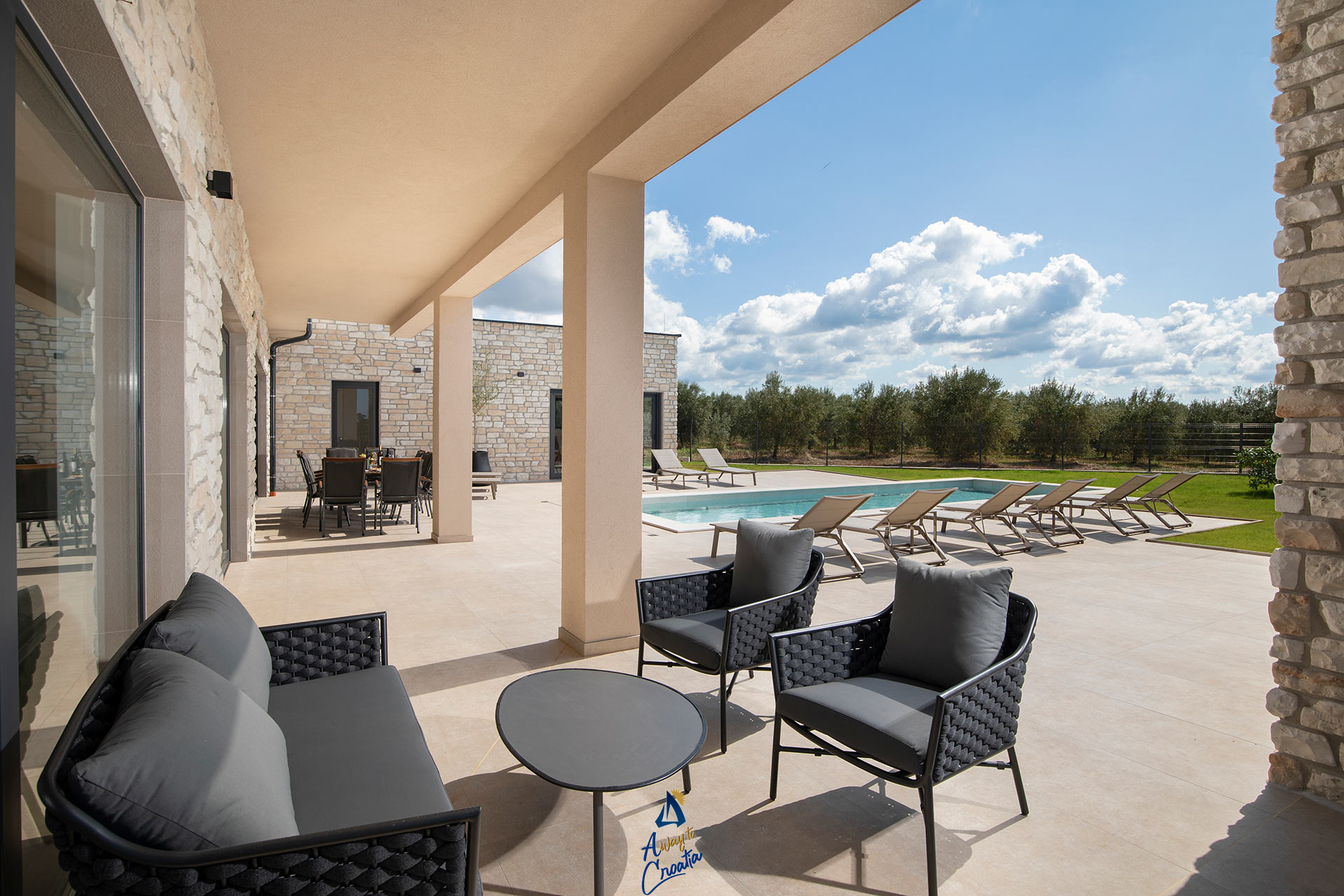 A stunning modern villa for up to 10 guests, offering a private pool, sauna, and gym, a spacious terrace with beautiful olive grove views, just 3 km from the beach — perfect for a relaxing escape in Istria.