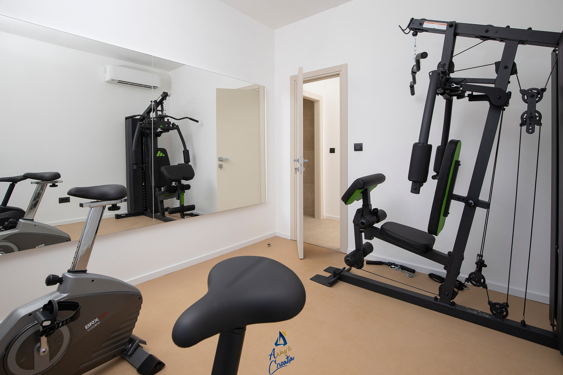 Step outside and enjoy the ultimate outdoor lifestyle. The villa offers a private pool with a relaxing lounge area, an outdoor kitchen with barbecue and dining space, and a sauna with shower that opens directly onto the pool terrace. There is also a fully equipped fitness area with bikes and multifunctional gym equipment, as well as a poolside shower and outdoor toilet for added convenience.