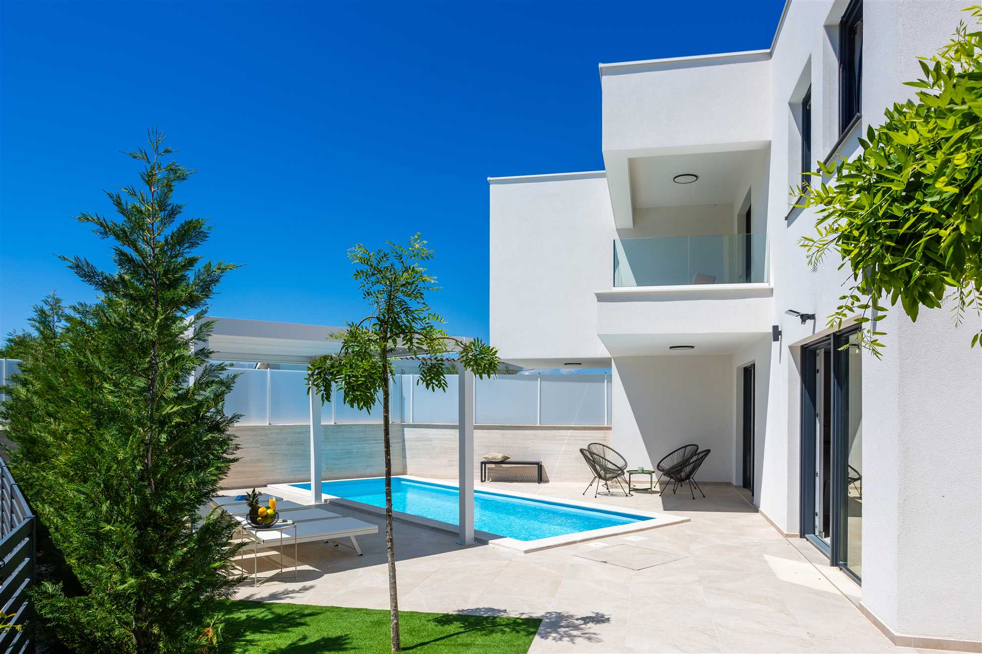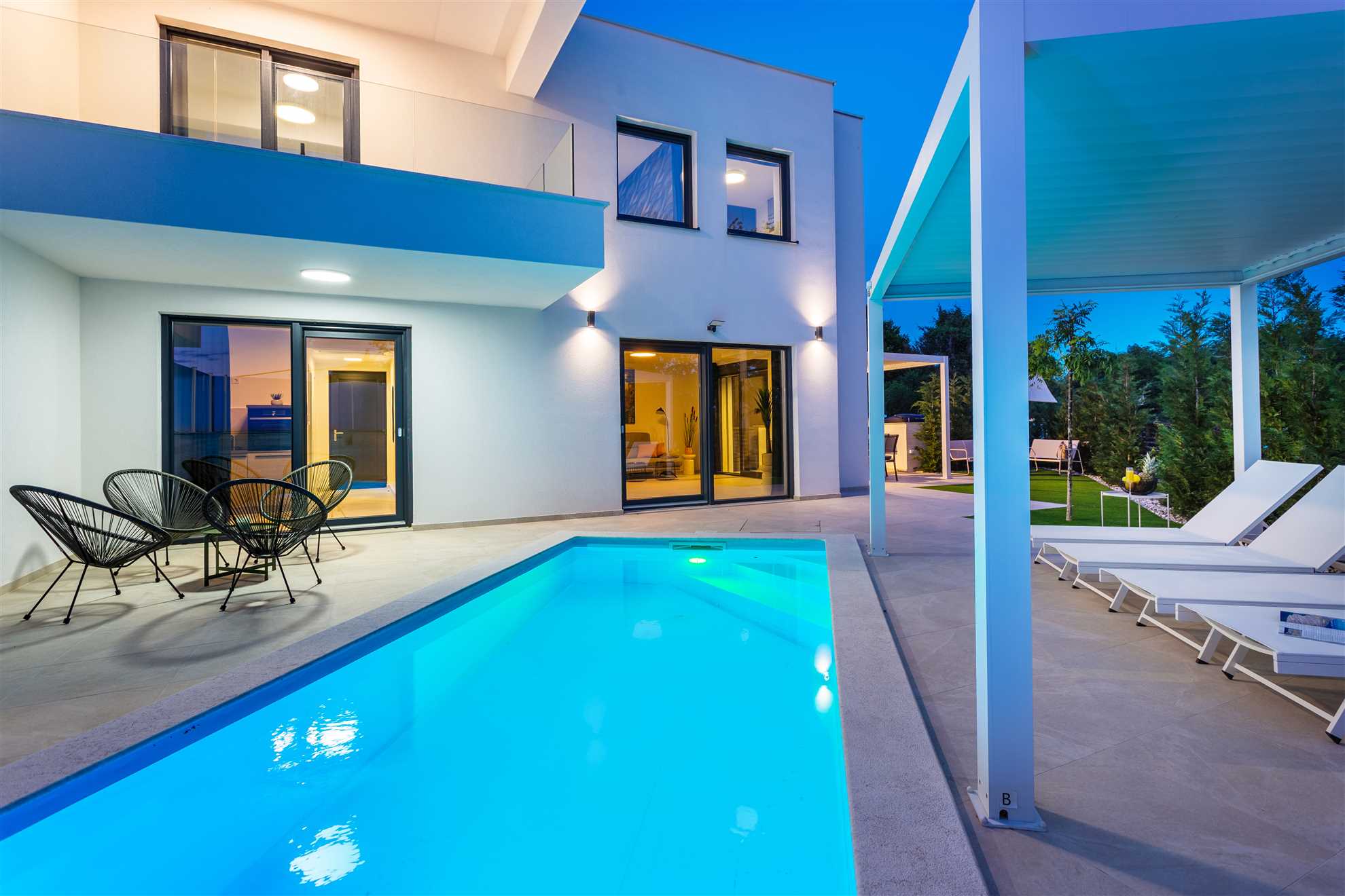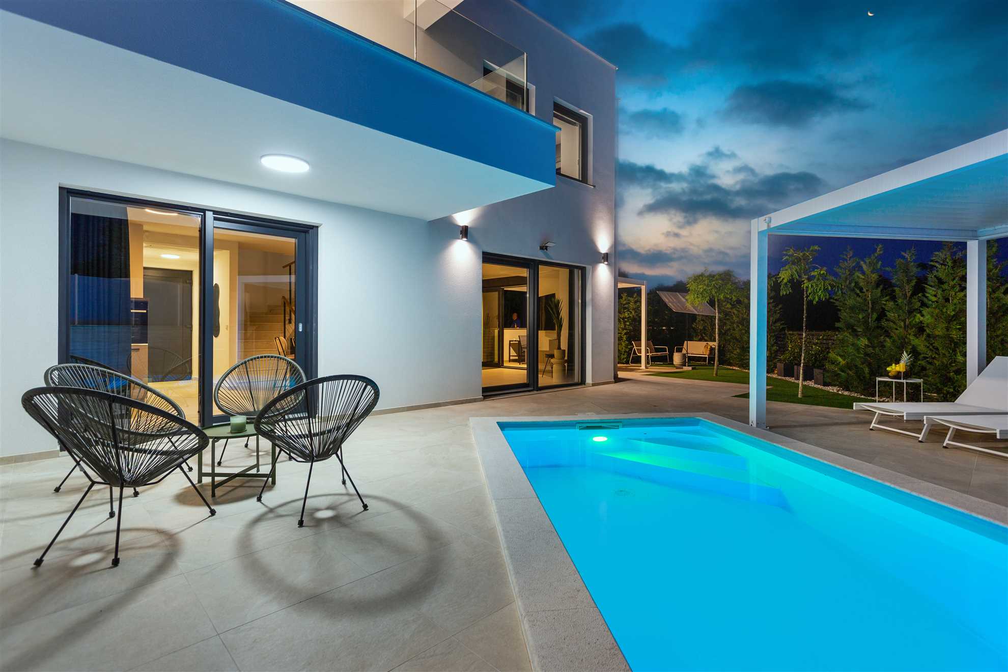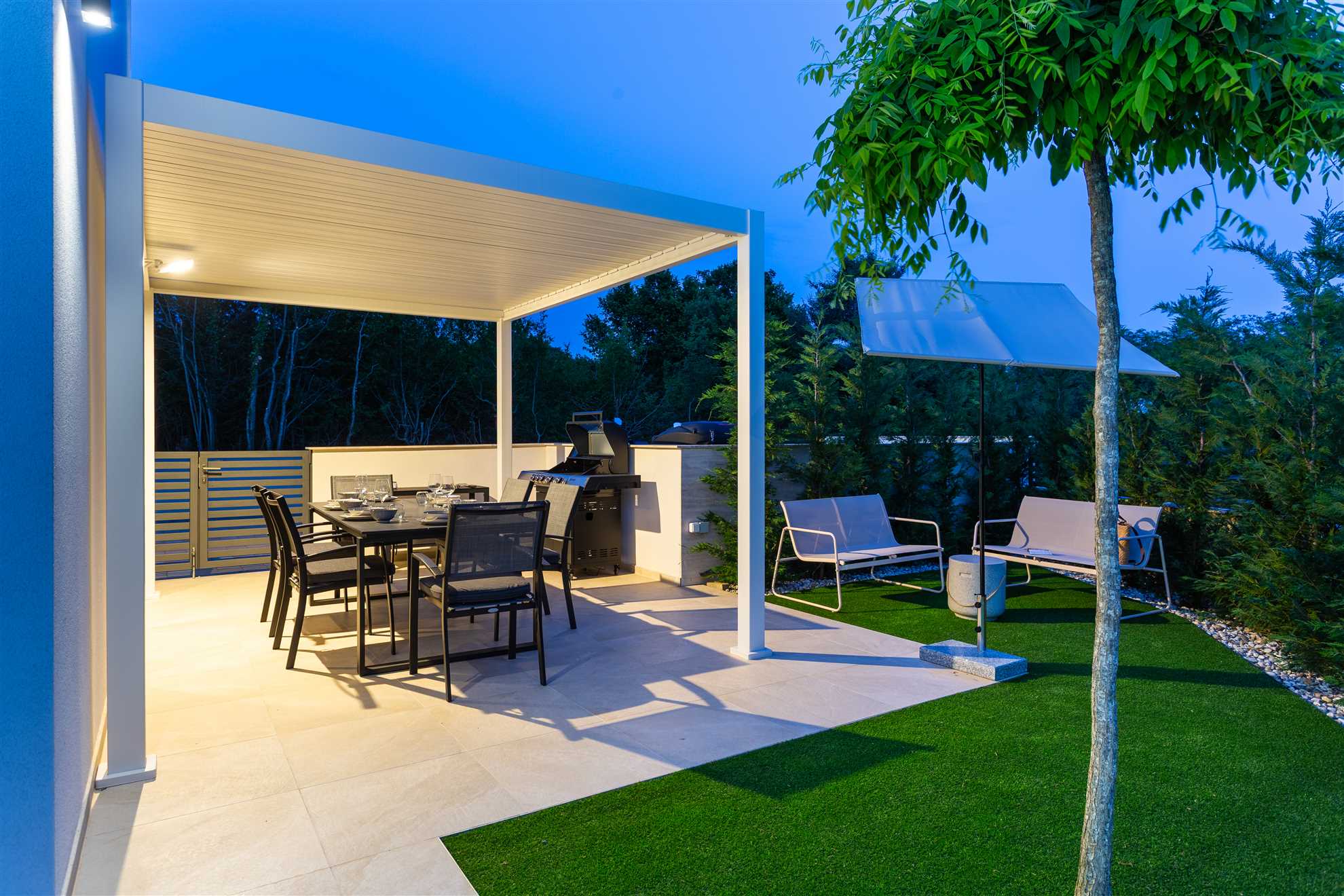 Unwind in style at Bella Vista Quarto, a modern villa on the Island of Krk created for easy, relaxed living. Its elegant interior blends comfort and contemporary design, while the outdoor areas invite you to make the most of sunny days — from the private pool and sun loungers to the shaded terrace with barbecue, a covered lounge corner, and an upper-floor balcony offering glimpses of the sea.