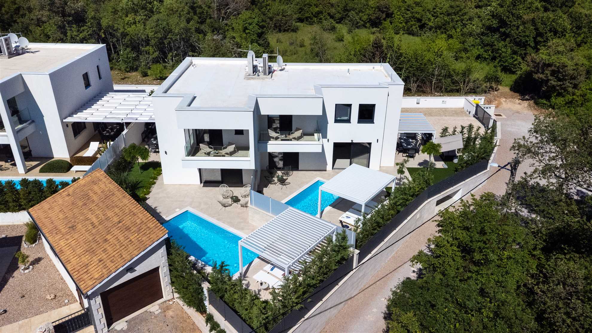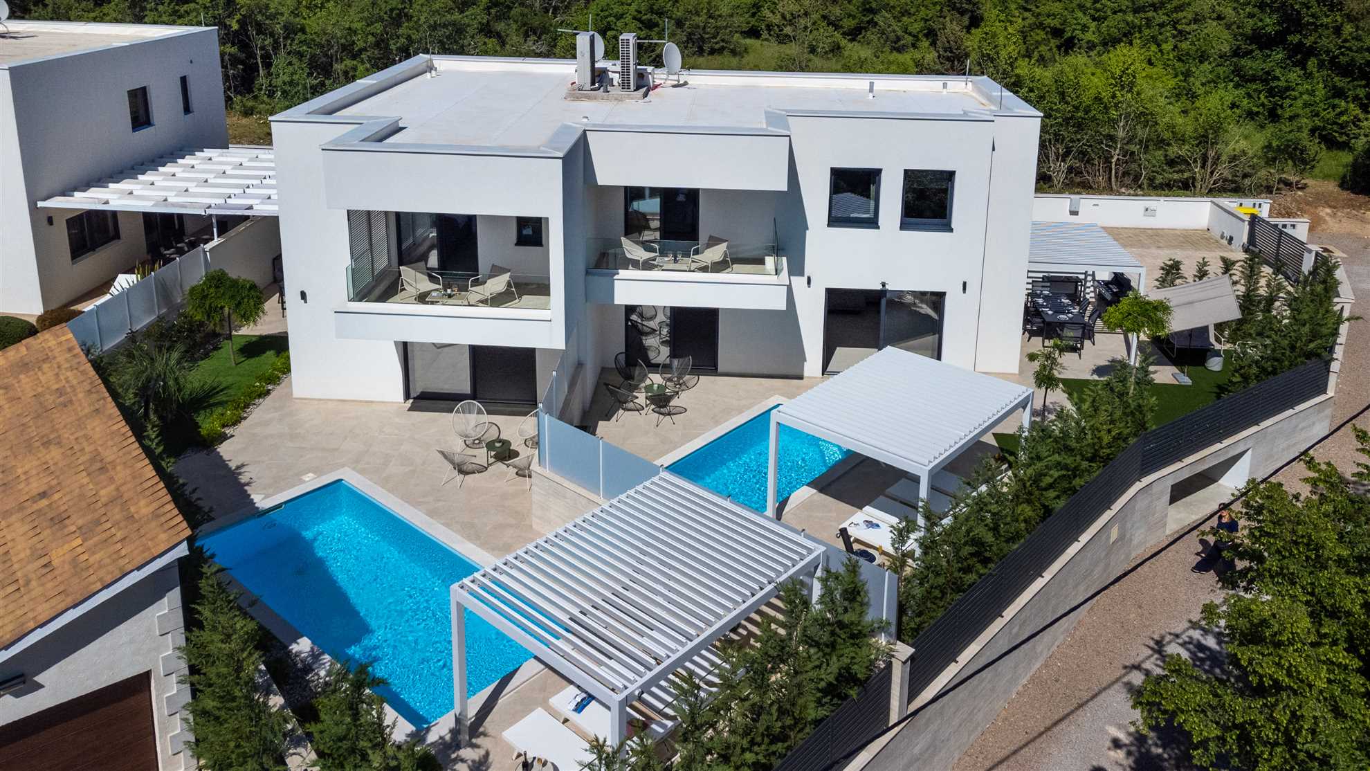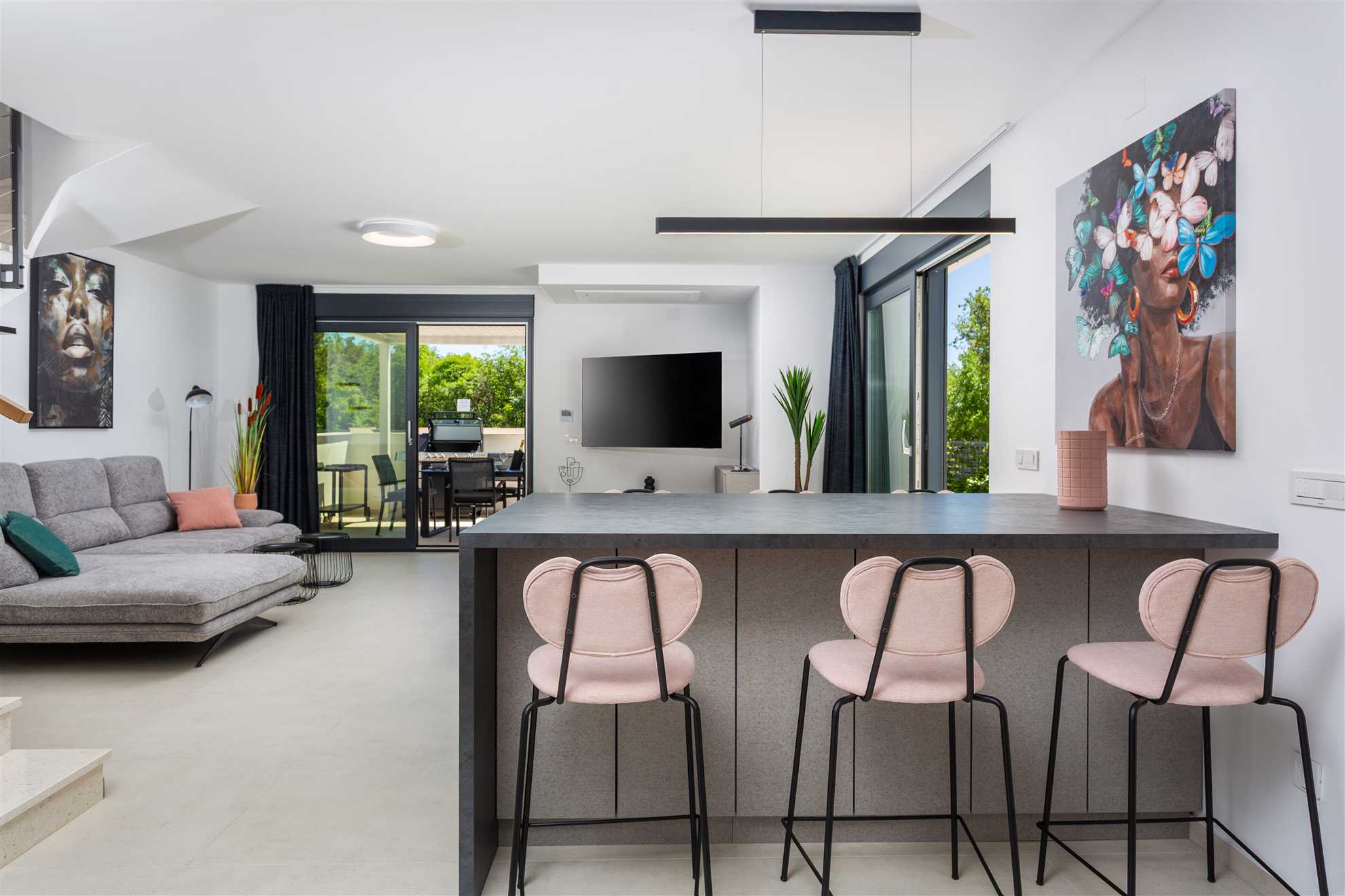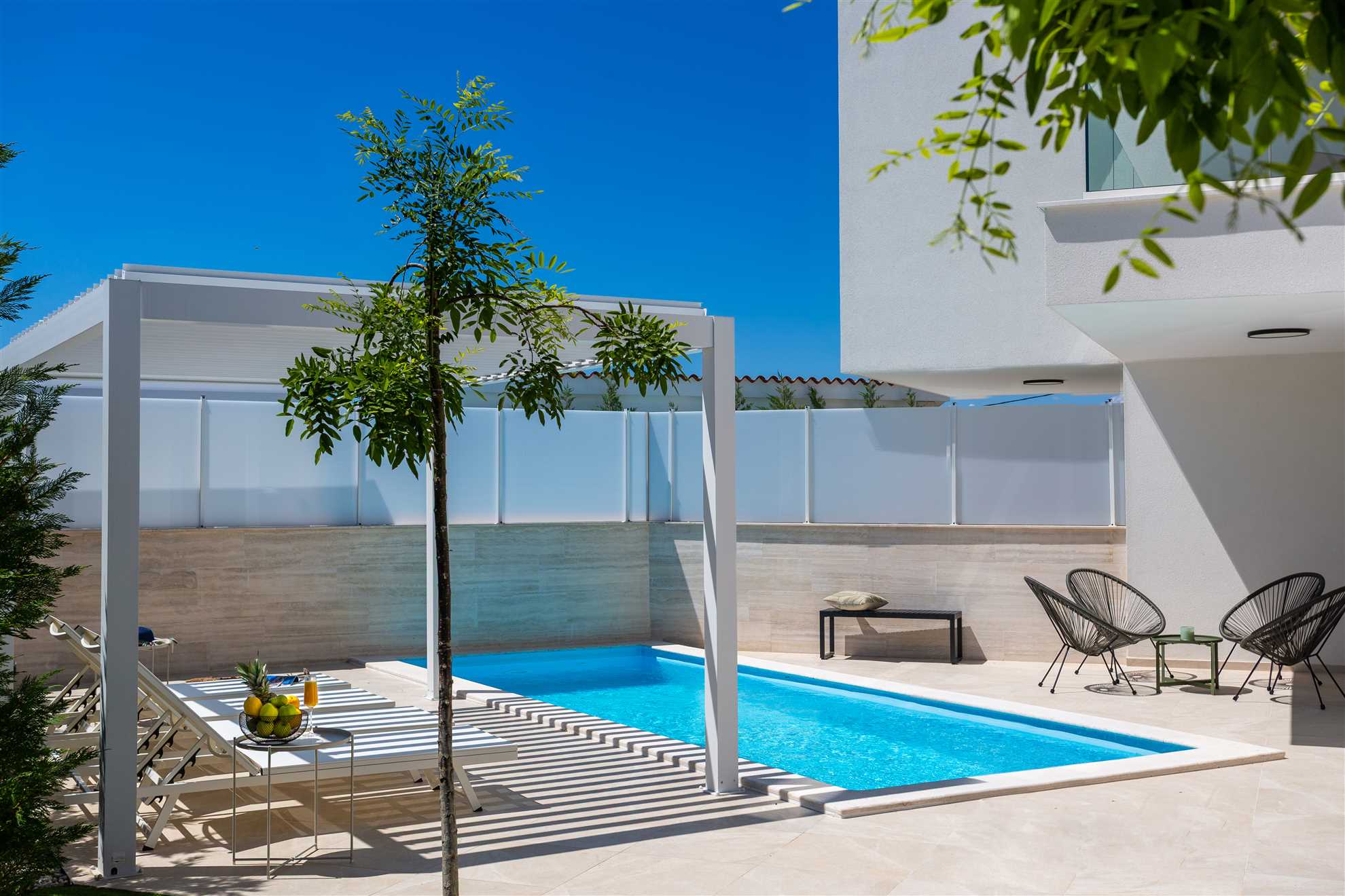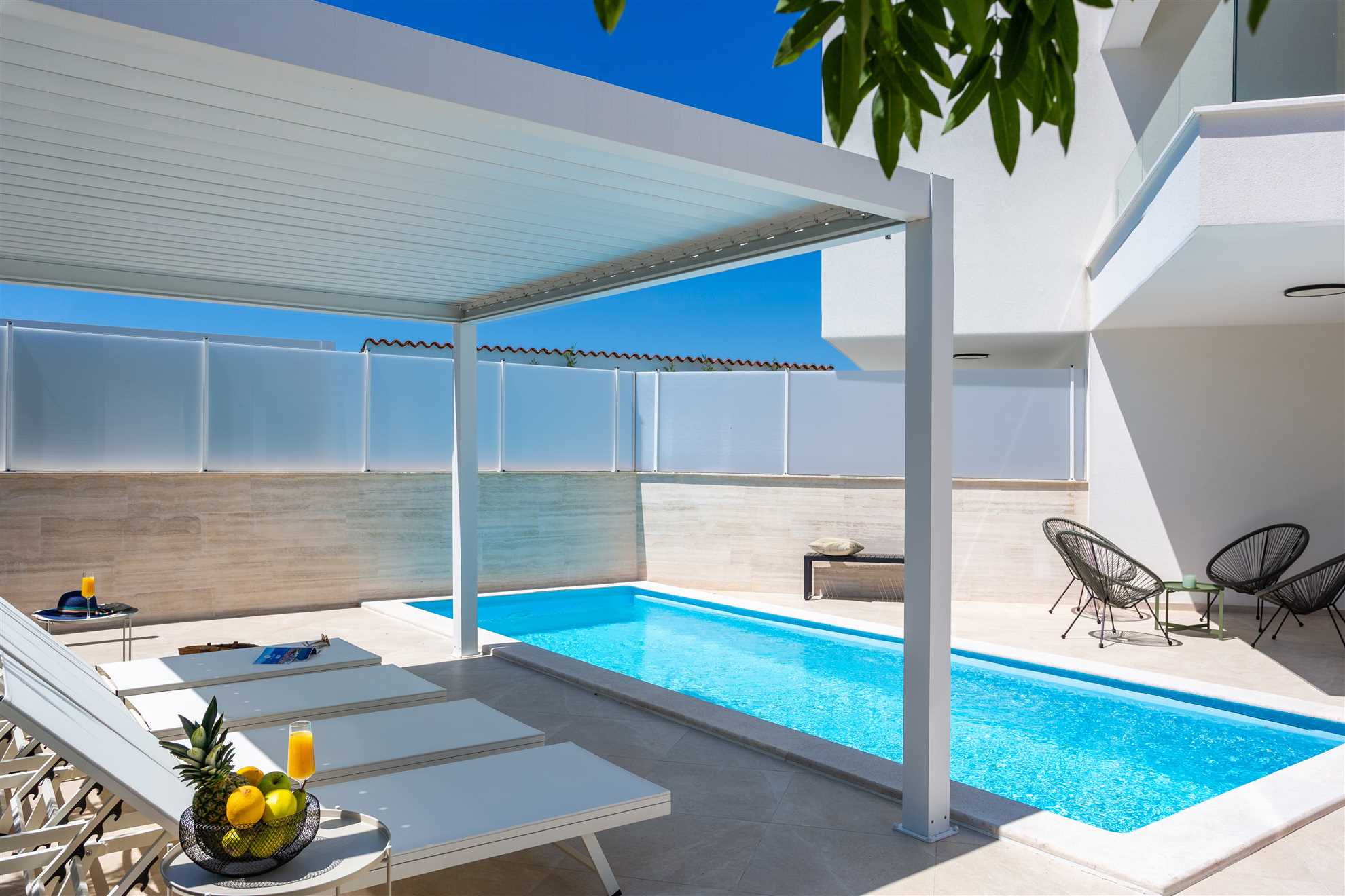 Unwind in style at Bella Vista Quarto, a modern villa on the Island of Krk created for easy, relaxed living. Its elegant interior blends comfort and contemporary design, while the outdoor areas invite you to make the most of sunny days — from the private pool and sun loungers to the shaded terrace with barbecue, a covered lounge corner, and an upper-floor balcony offering glimpses of the sea.