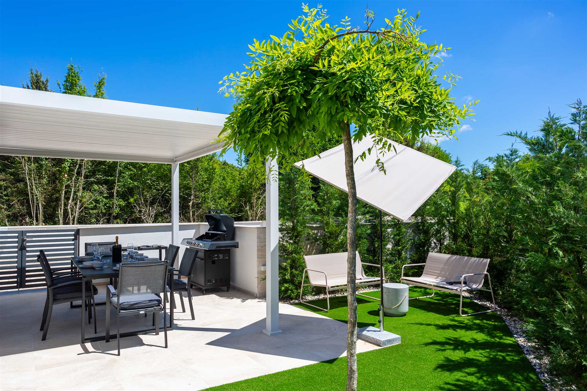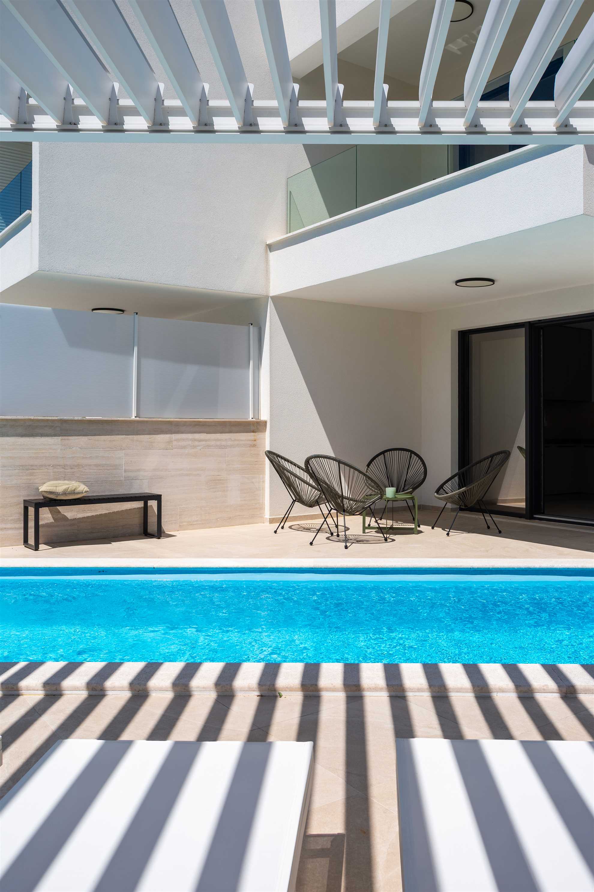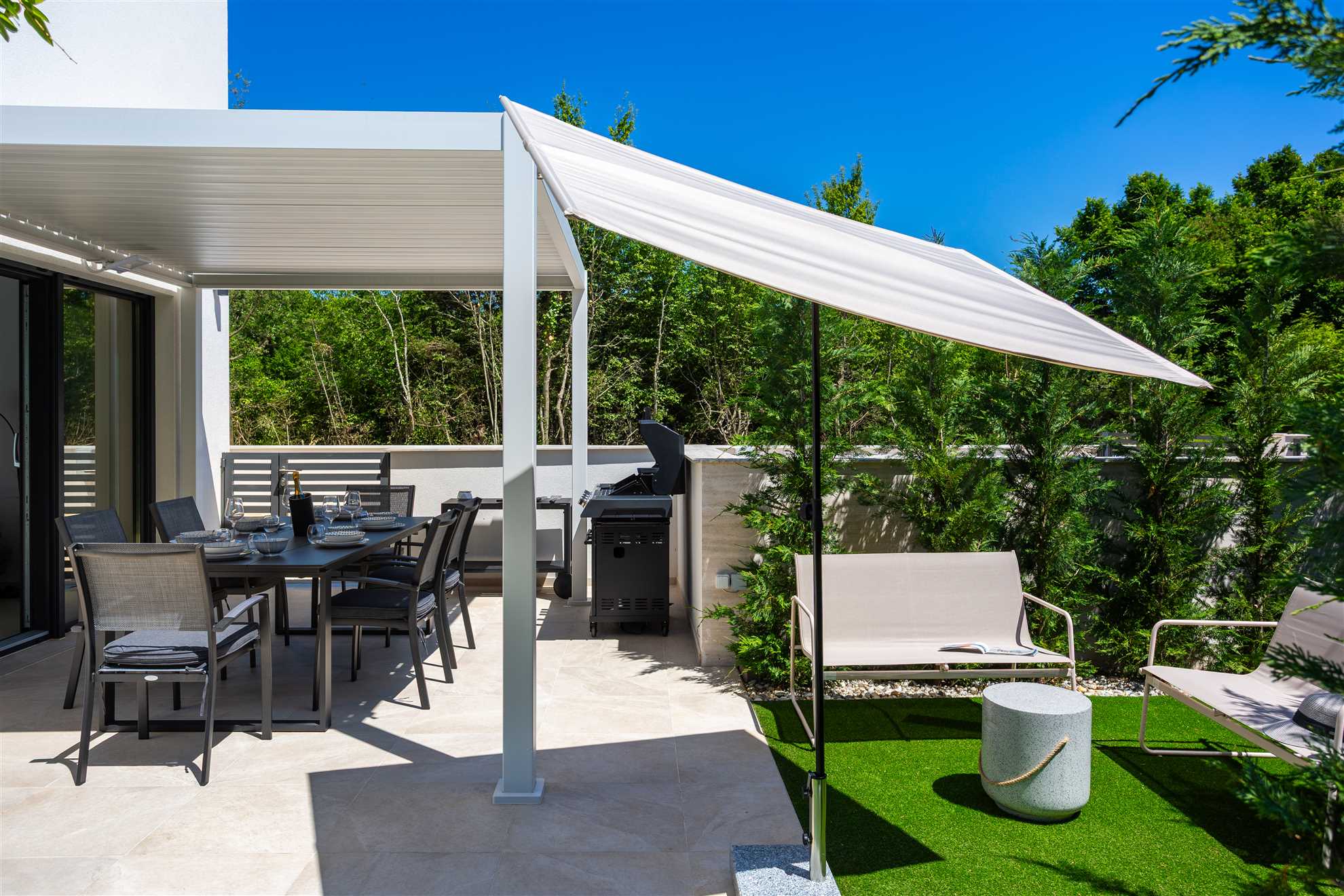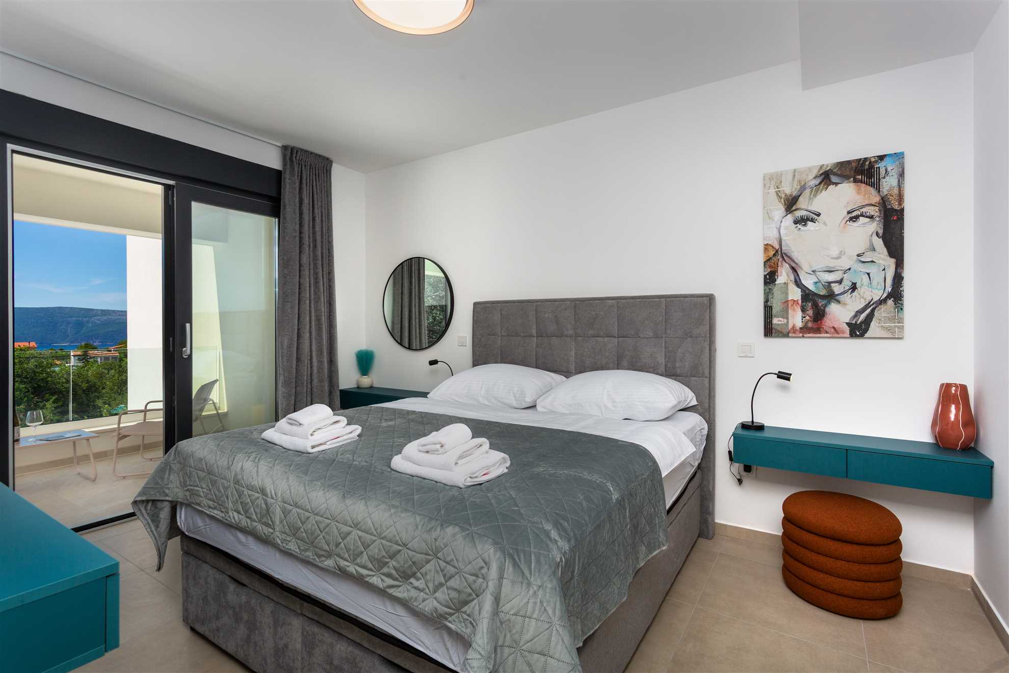 Unwind in style at Bella Vista Quarto, a modern villa on the Island of Krk created for easy, relaxed living. Its elegant interior blends comfort and contemporary design, while the outdoor areas invite you to make the most of sunny days — from the private pool and sun loungers to the shaded terrace with barbecue, a covered lounge corner, and an upper-floor balcony offering glimpses of the sea.