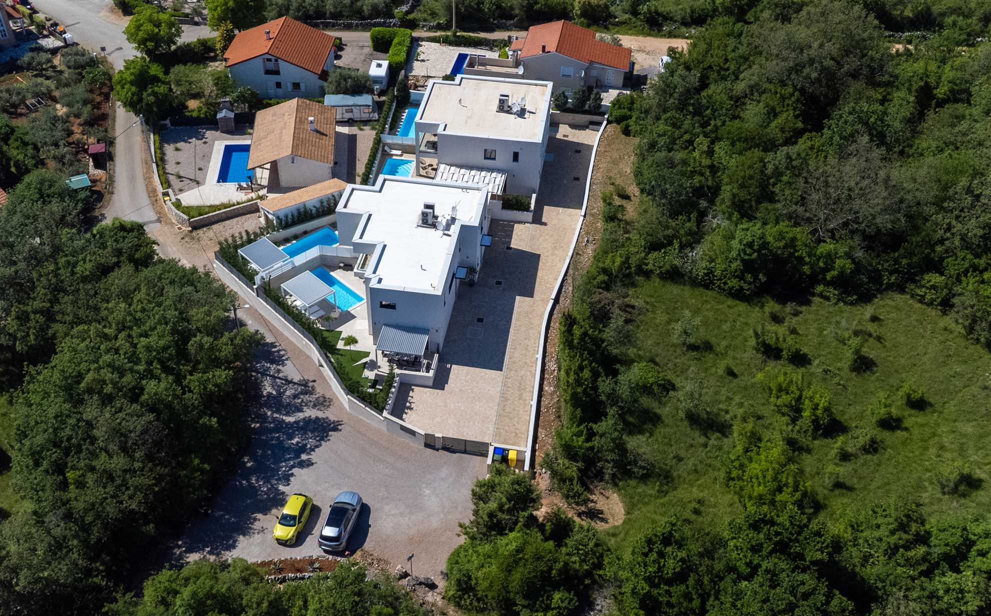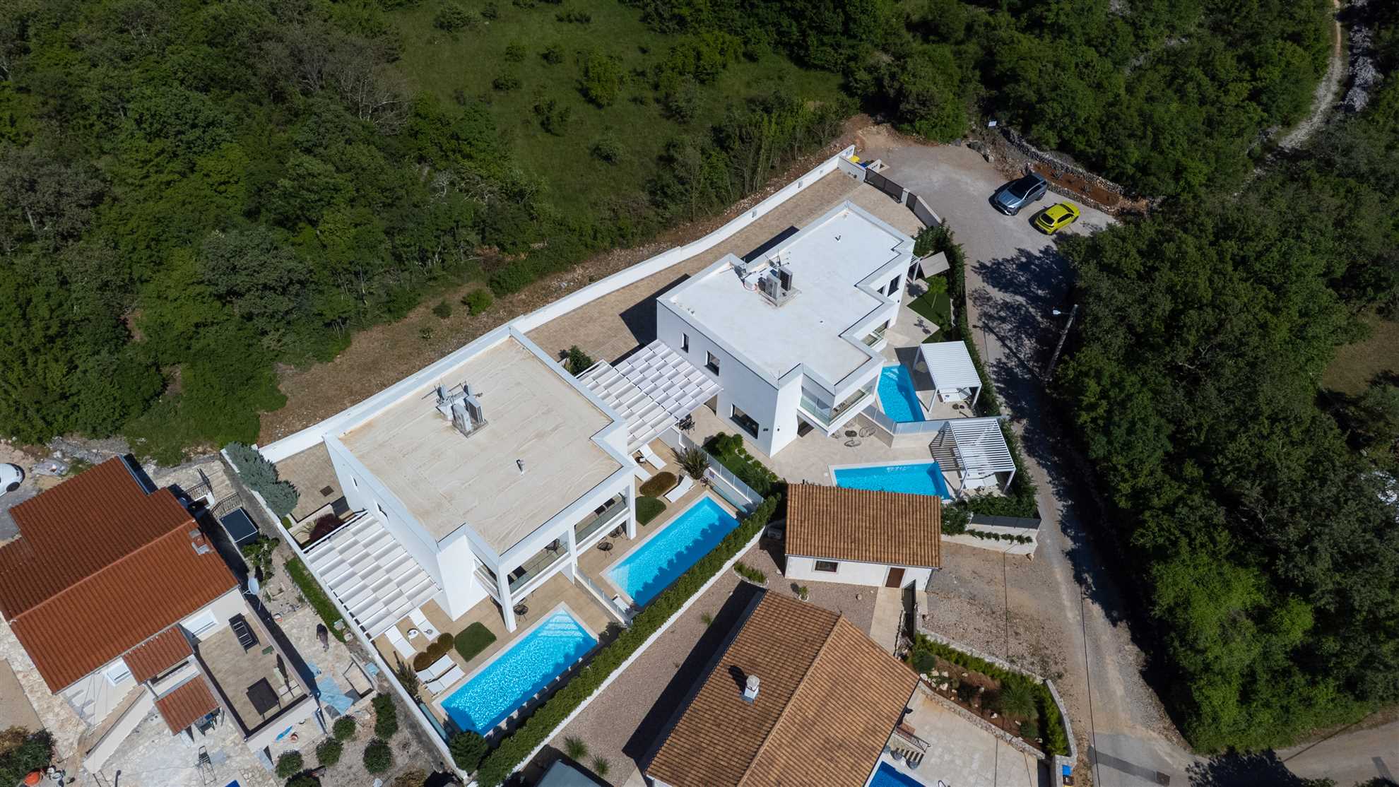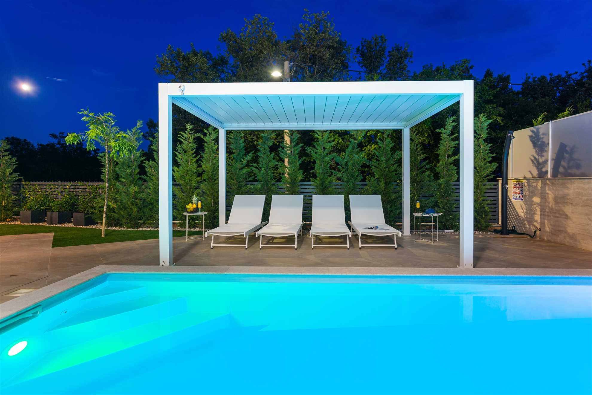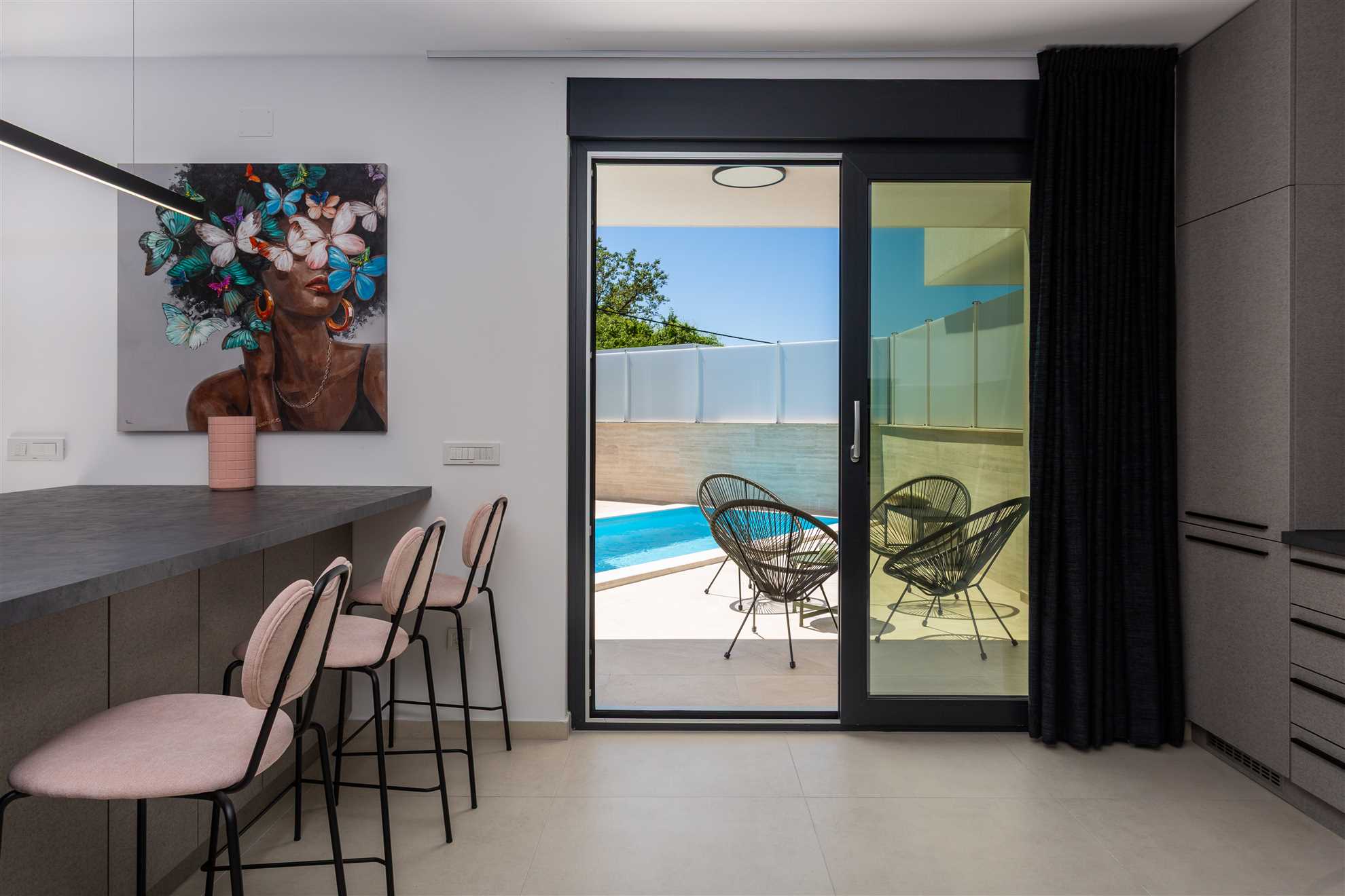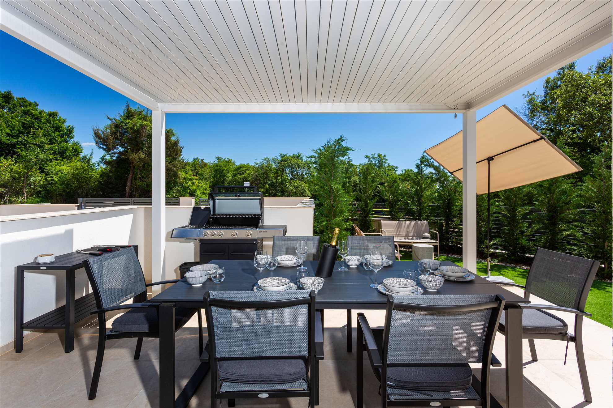 Unwind in style at Bella Vista Quarto, a modern villa on the Island of Krk created for easy, relaxed living. Its elegant interior blends comfort and contemporary design, while the outdoor areas invite you to make the most of sunny days — from the private pool and sun loungers to the shaded terrace with barbecue, a covered lounge corner, and an upper-floor balcony offering glimpses of the sea.