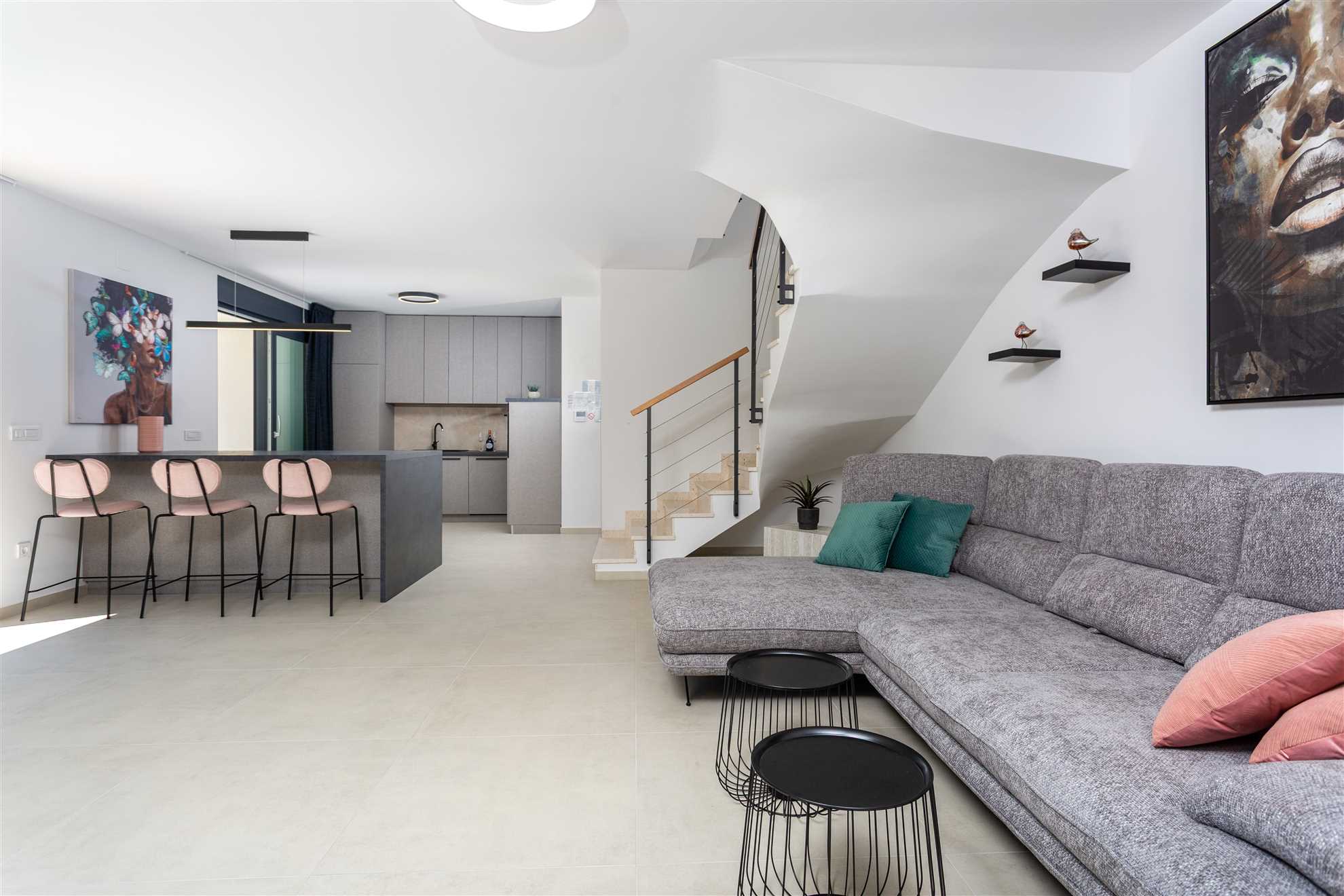 The airy ground floor is designed for togetherness, featuring a fully equipped kitchen, a light-filled living space with a spacious corner sofa and smart TV, and a dining area for seven, ideal for long dinners or laid-back evenings indoors. Upstairs, welcoming bedrooms ensure restful nights and quiet moments throughout your stay.
