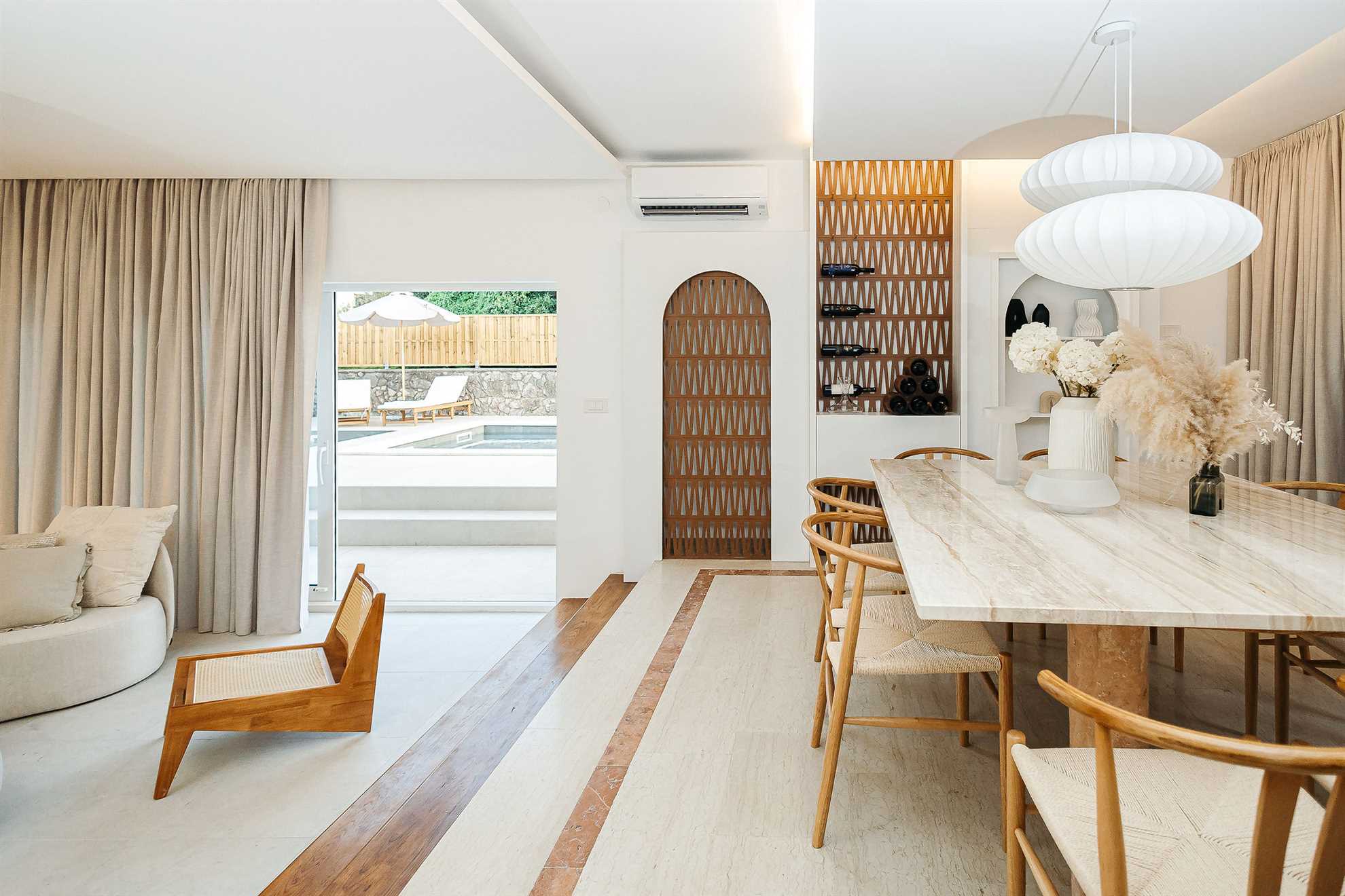 The house has 240 m² of living space spread over two levels and can accommodate up to 8 guests in four bedrooms. Several living areas allow guests to spend time together while still having enough private space.