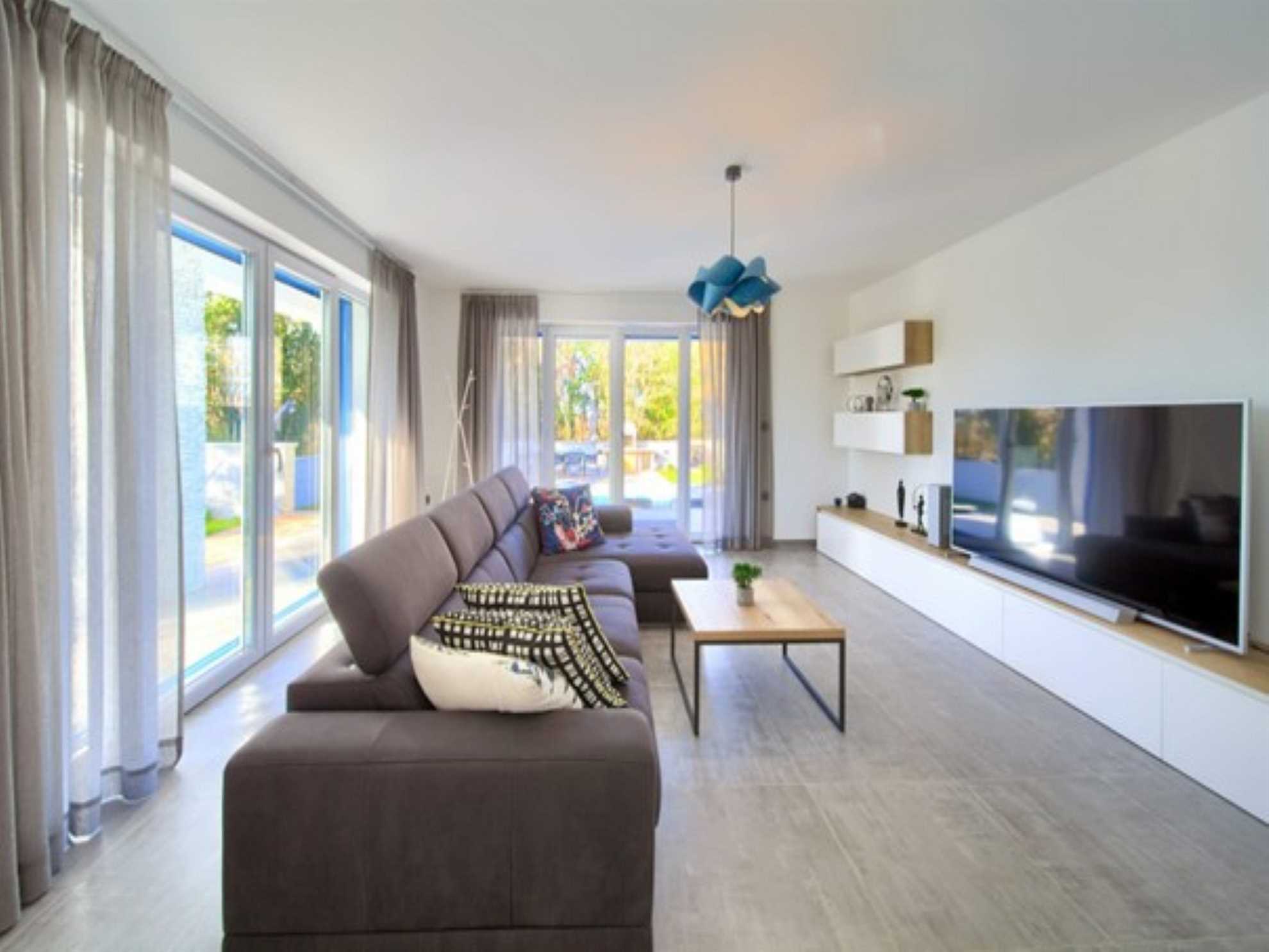 When you step inside the villa, you are greeted by a modern and tastefully furnished ground floor that combines functionality and elegance. The spacious living room is bright and airy, equipped with comfortable furniture that invites you to relax while watching TV or socializing with loved ones. If necessary, the sofa in the living room can be converted into an additional bed for two people. Large glass surfaces allow plenty of natural light and a beautiful view of the garden and pool. The living area harmoniously connects with a modern, fully equipped kitchen, where you will find all the necessary appliances and utensils for preparing delicious meals. Next to the kitchen is an elegant dining area, offering enough space for shared meals and pleasant conversations.