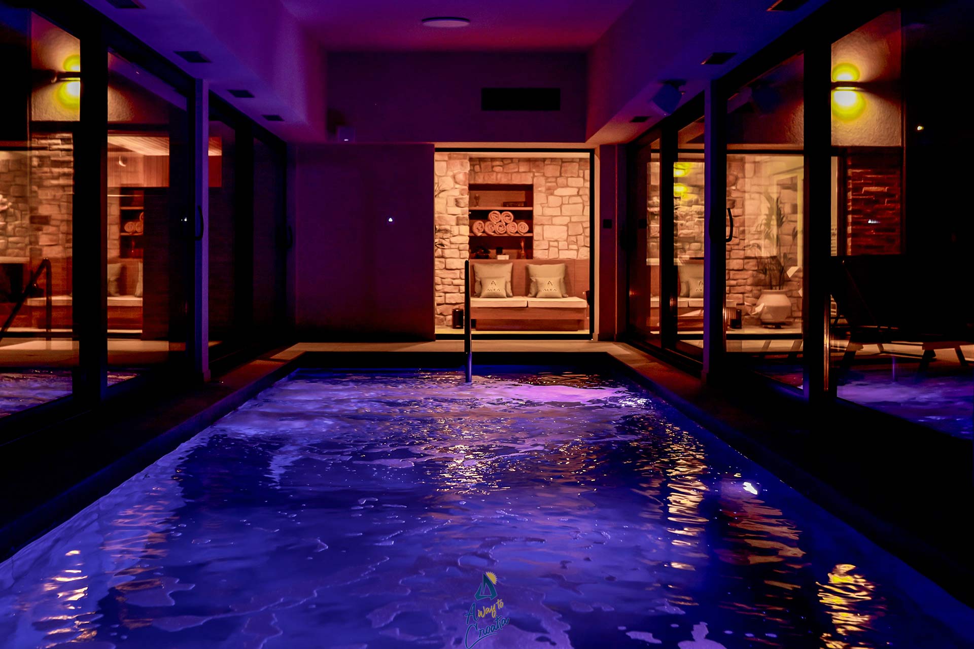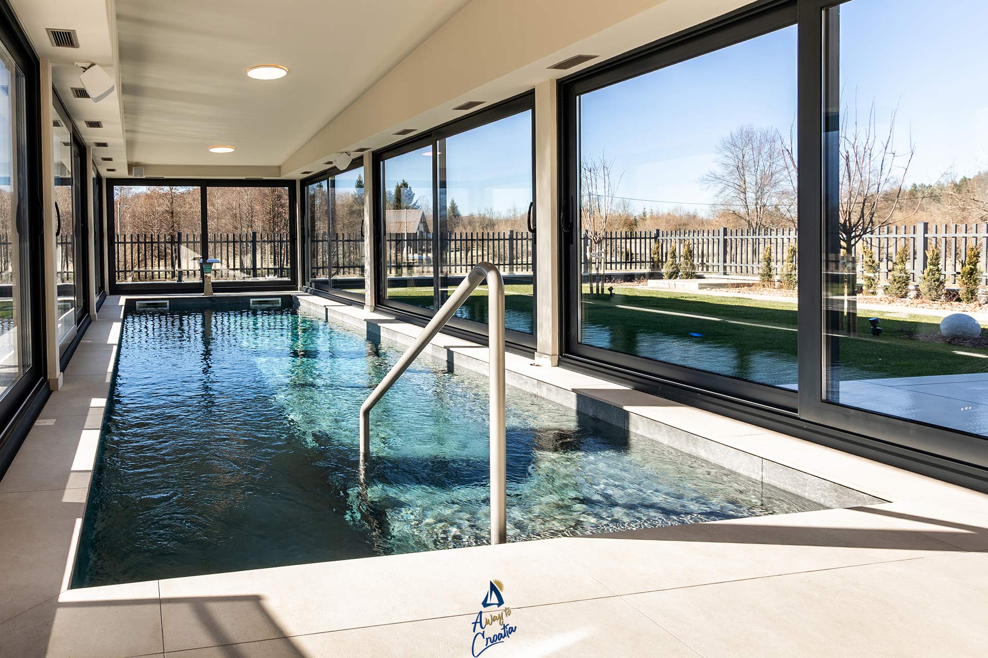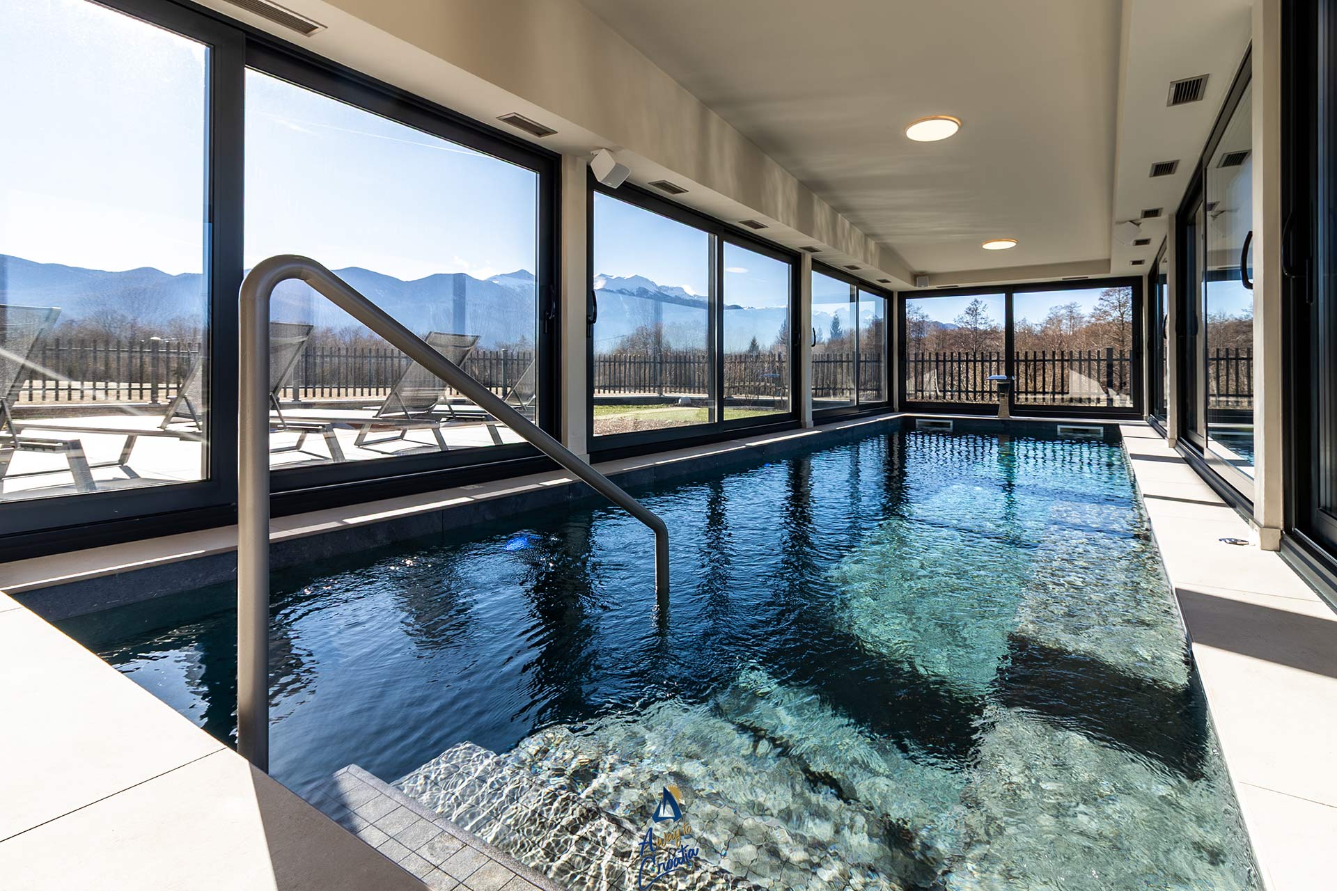 The SPA Relax Zone is a warm, glass-enclosed retreat designed for complete renewal. Its centerpiece is the 11×3 m indoor heated saltwater pool maintained at a constant 30°C, which opens toward nature to create a seamless indoor-outdoor feeling in every season. A 4-person jacuzzi and 4-person sauna complete the experience, offering deep relaxation after active days.