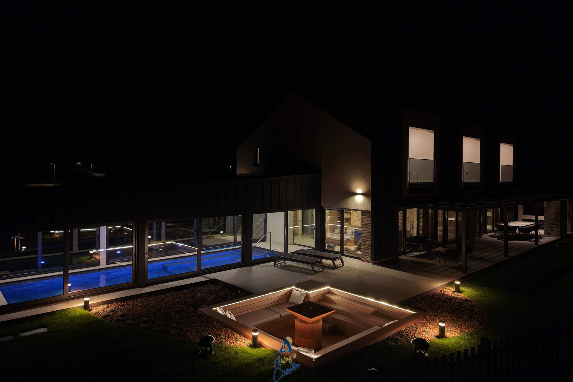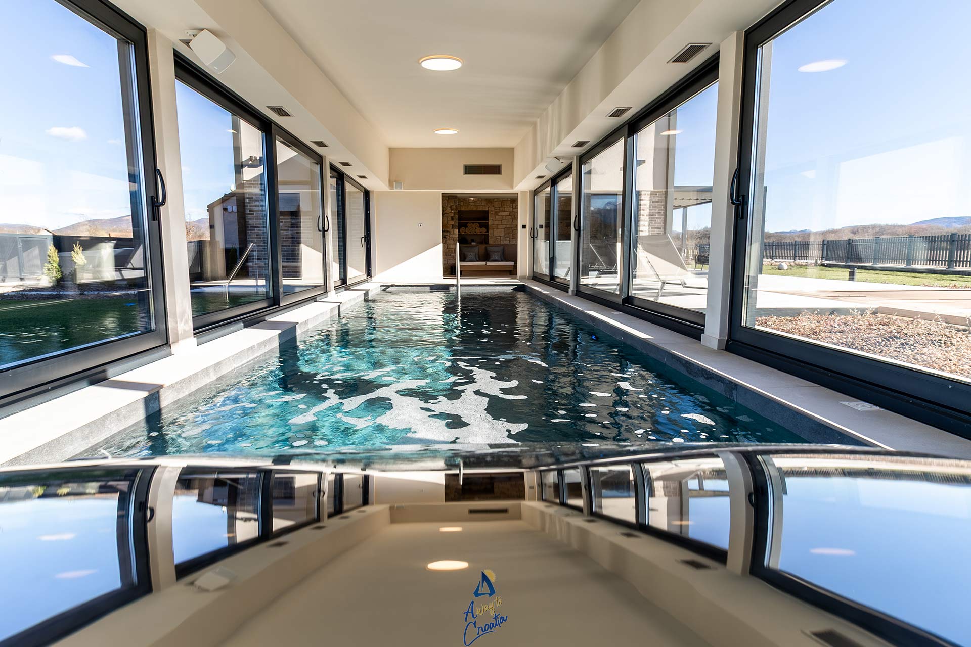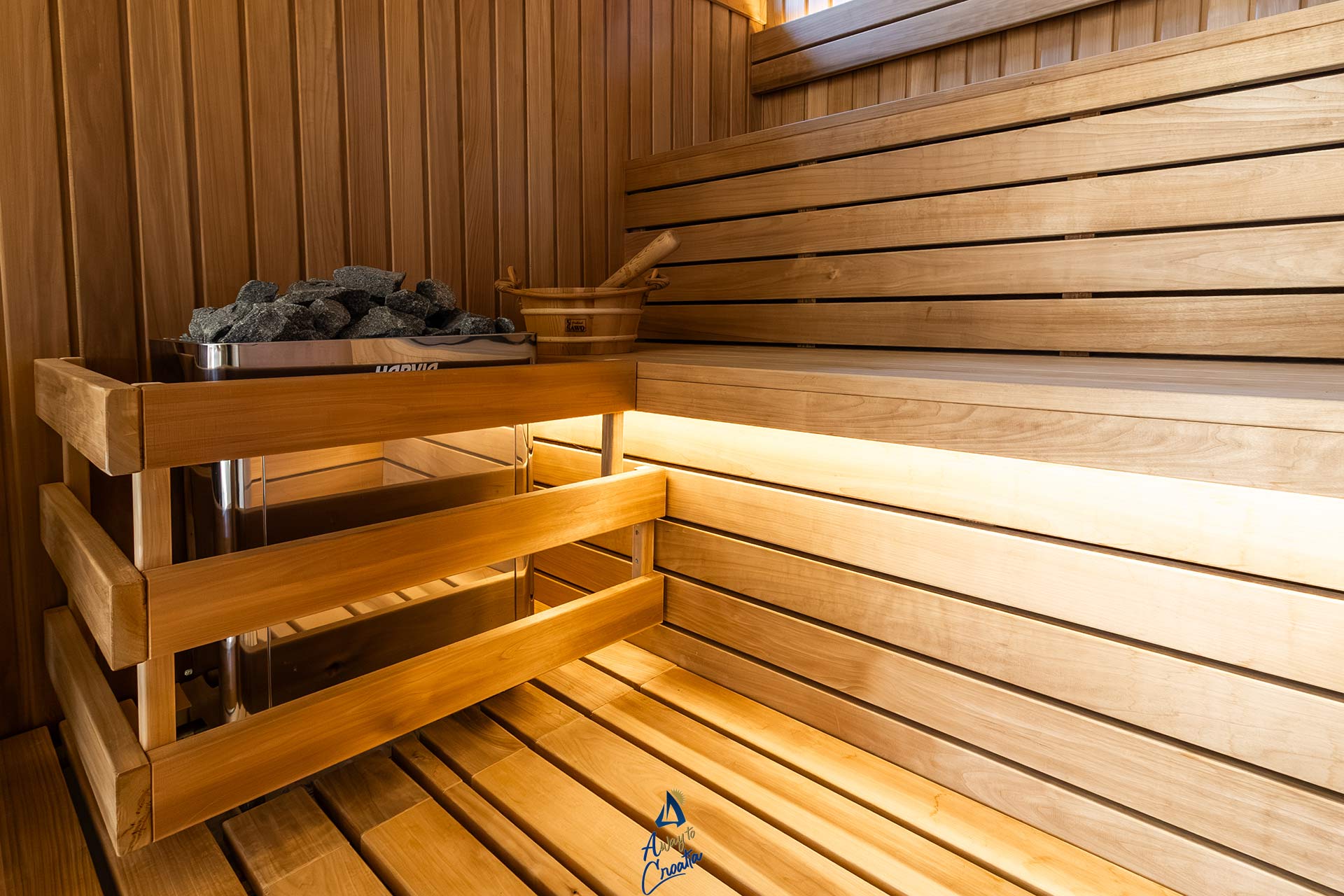 The SPA Relax Zone is a warm, glass-enclosed retreat designed for complete renewal. Its centerpiece is the 11×3 m indoor heated saltwater pool maintained at a constant 30°C, which opens toward nature to create a seamless indoor-outdoor feeling in every season. A 4-person jacuzzi and 4-person sauna complete the experience, offering deep relaxation after active days.