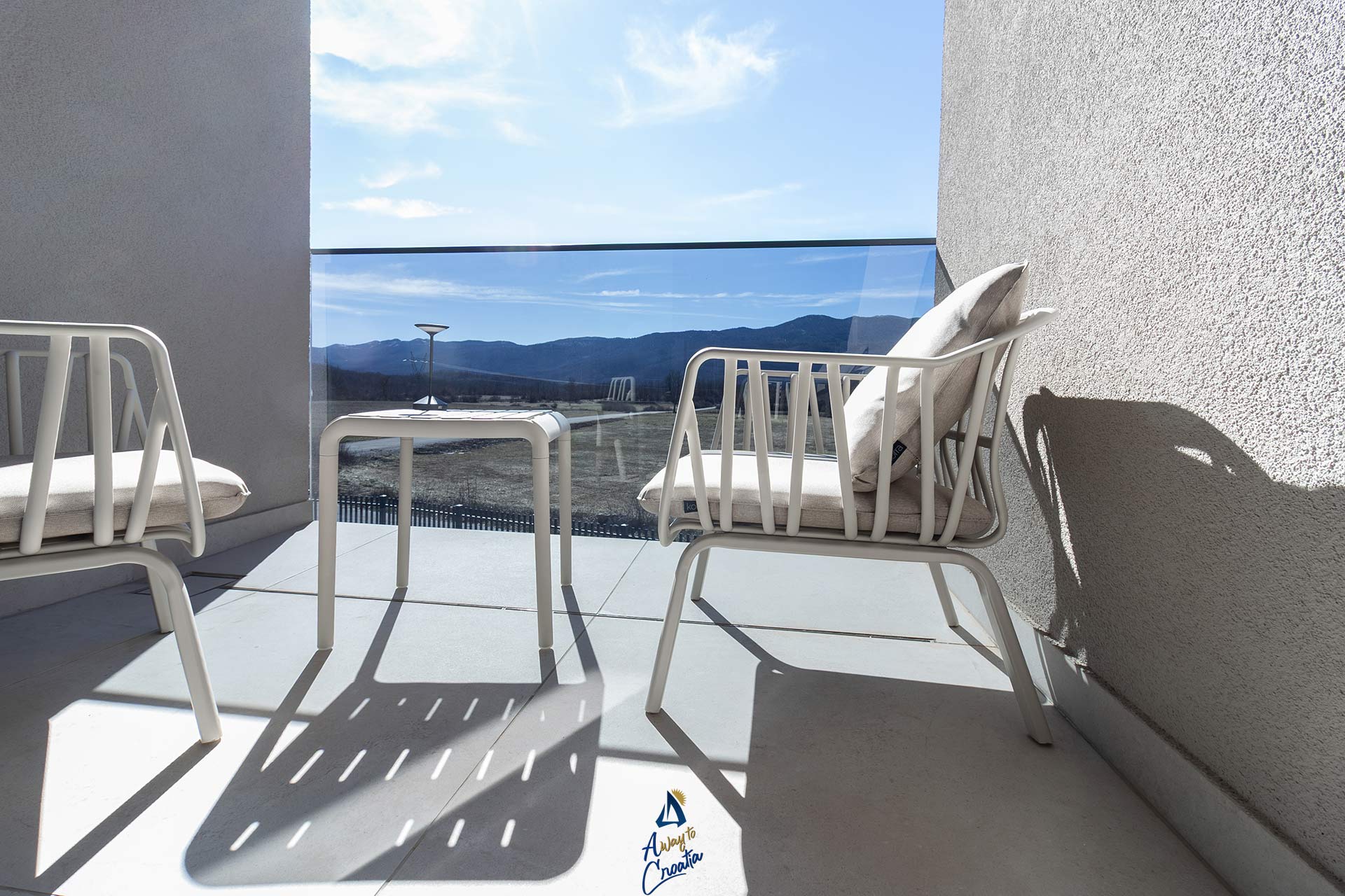 Inside, three elegant bedrooms with super king-size beds, private en-suite bathrooms, and balconies create peaceful personal spaces where mornings begin with fresh mountain air and quiet views. The villa comfortably hosts 6+2 guests, offering privacy and flexibility, supported by smart guest controls, premium audio, high-speed Wi-Fi, Netflix, and Spotify, all powered by clean solar energy for a sustainable yet luxurious stay.