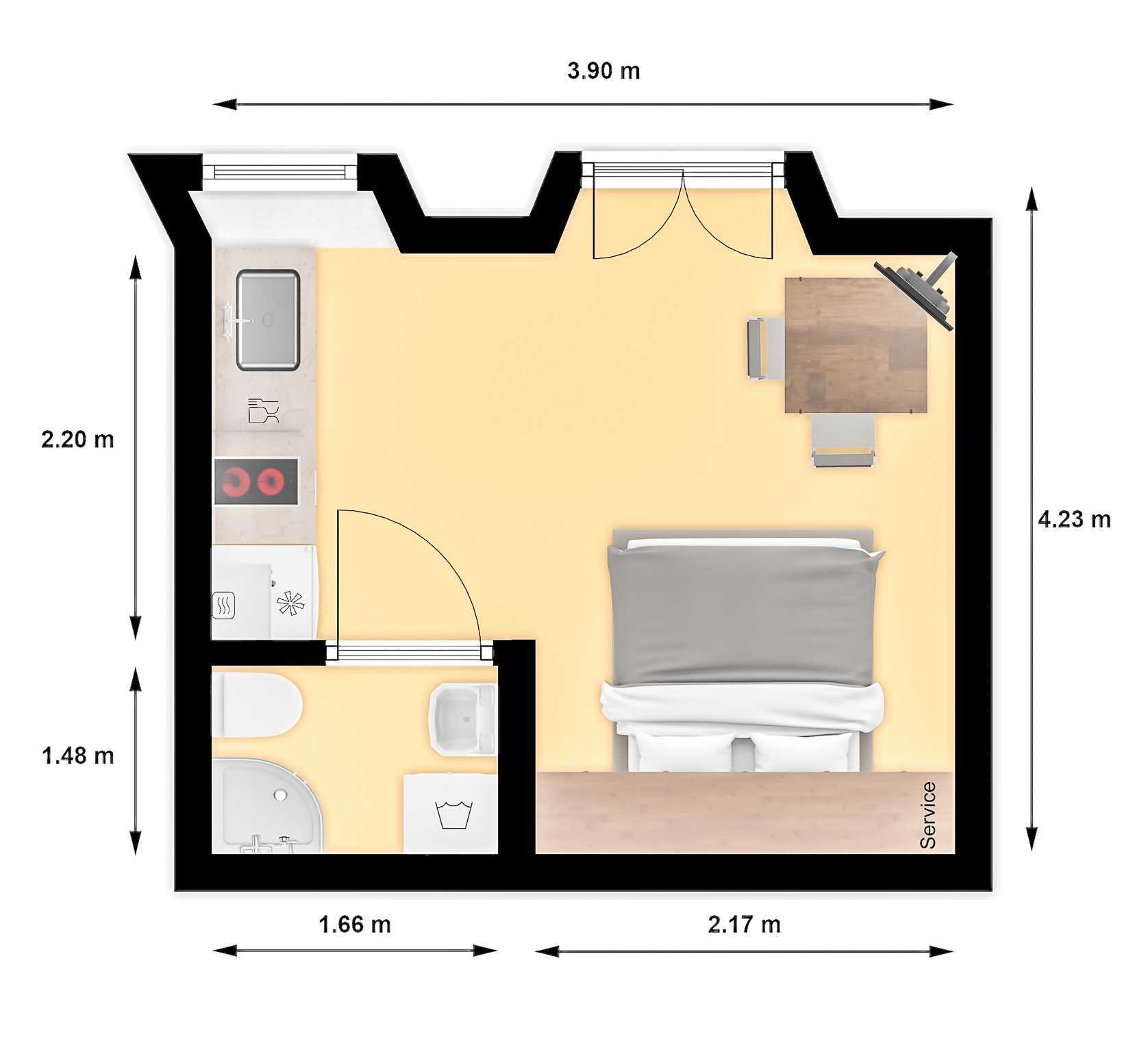 The studio features a double bed, private bathroom, air conditioning, SAT‑TV, and complimentary Wi‑Fi. The kitchen includes an electric stove, refrigerator with freezer, microwave, coffee maker, and dishwasher, and the bathroom also has a washing machine — everything you need for a comfortable stay.