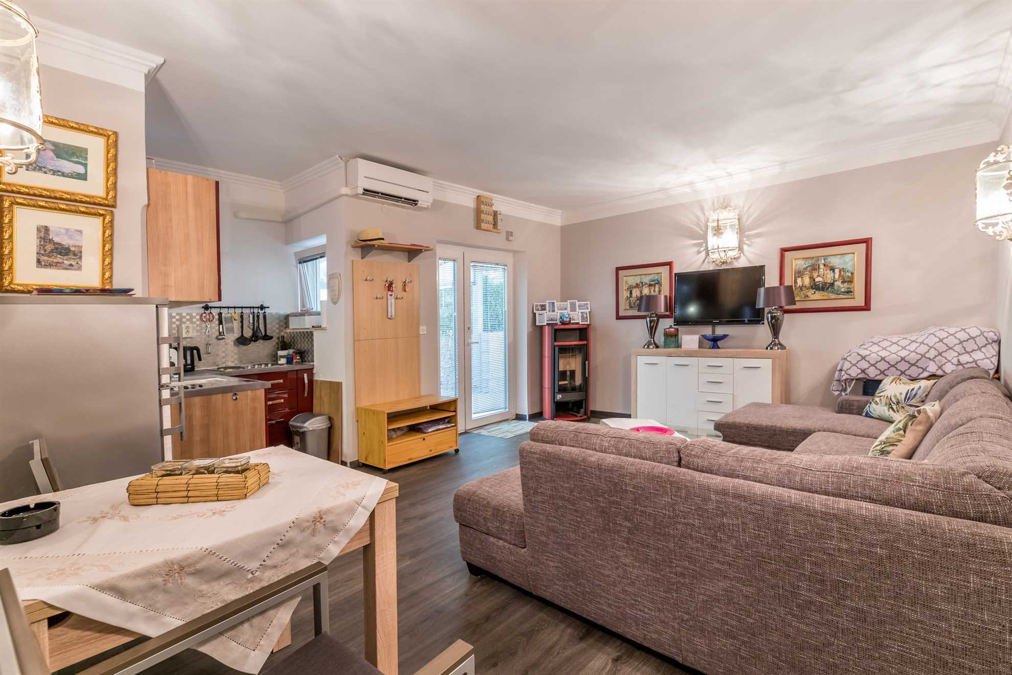 Within the cozy confinements of the Pavic Garden Apartment, you will find a well-equipped, contemporary kitchen merging seamlessly into a spacious living room, perfect for gatherings or a relaxed evening after a day of exploring Baška's abundant beauty. The property also features a modern bathroom furnished to a high standard to meet all your needs.