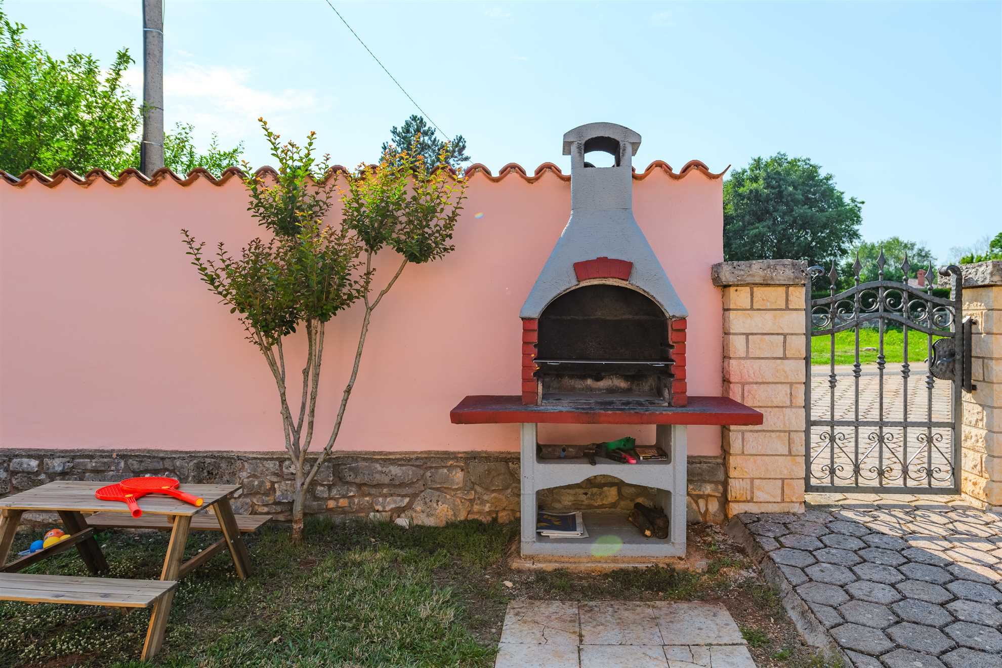 A BBQ grill and a large outdoor dining table invite you to enjoy long meals together, while pets are welcome with a fee (maximum two dogs).
