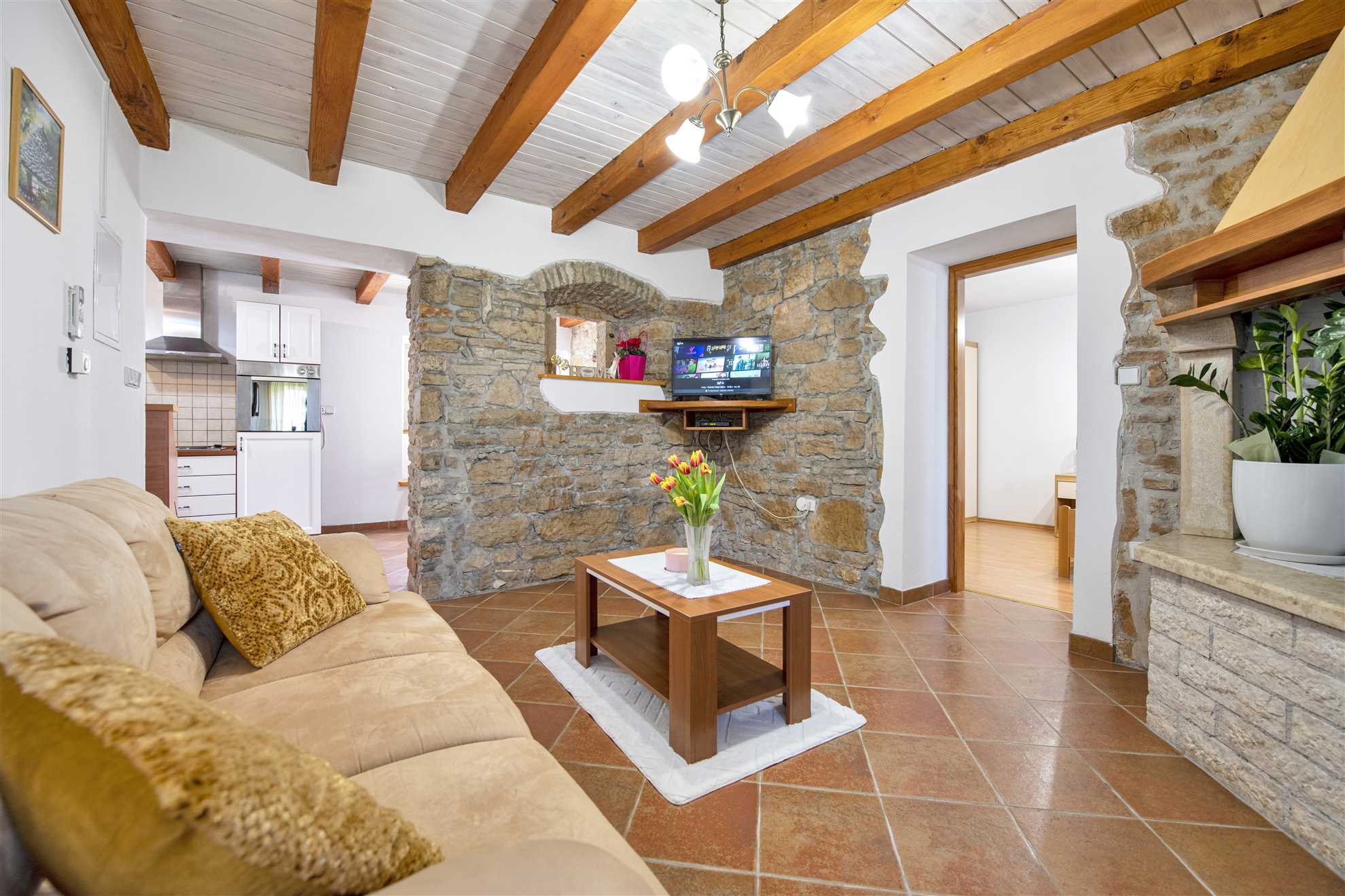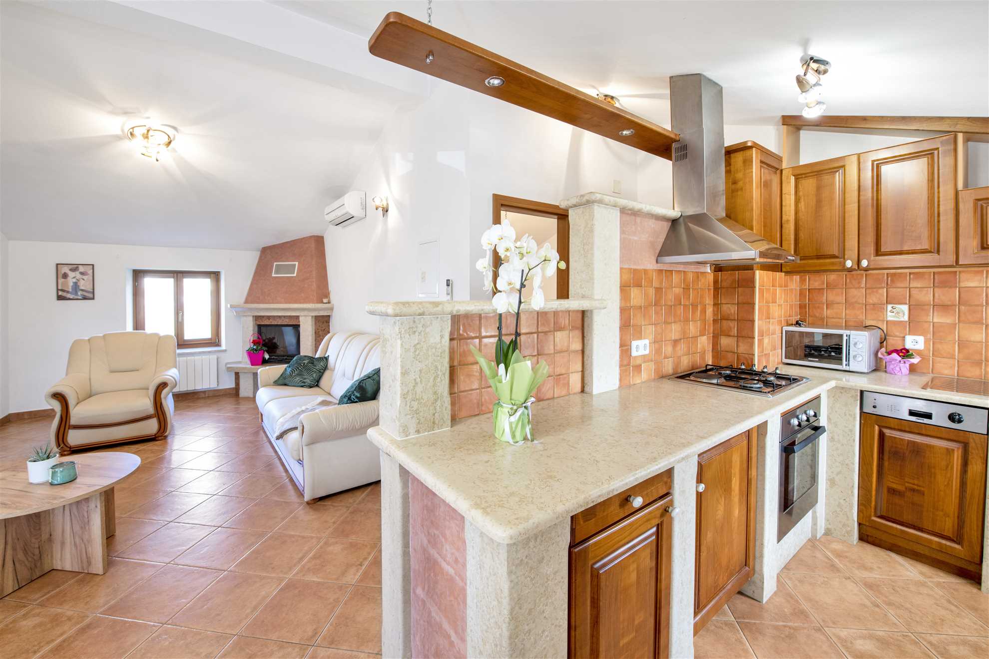 The modern, air-conditioned interiors feature two fully equipped kitchens, two comfortable living rooms, four bright and airy bedrooms, and two bathrooms, comfortably accommodating up to 10 guests.