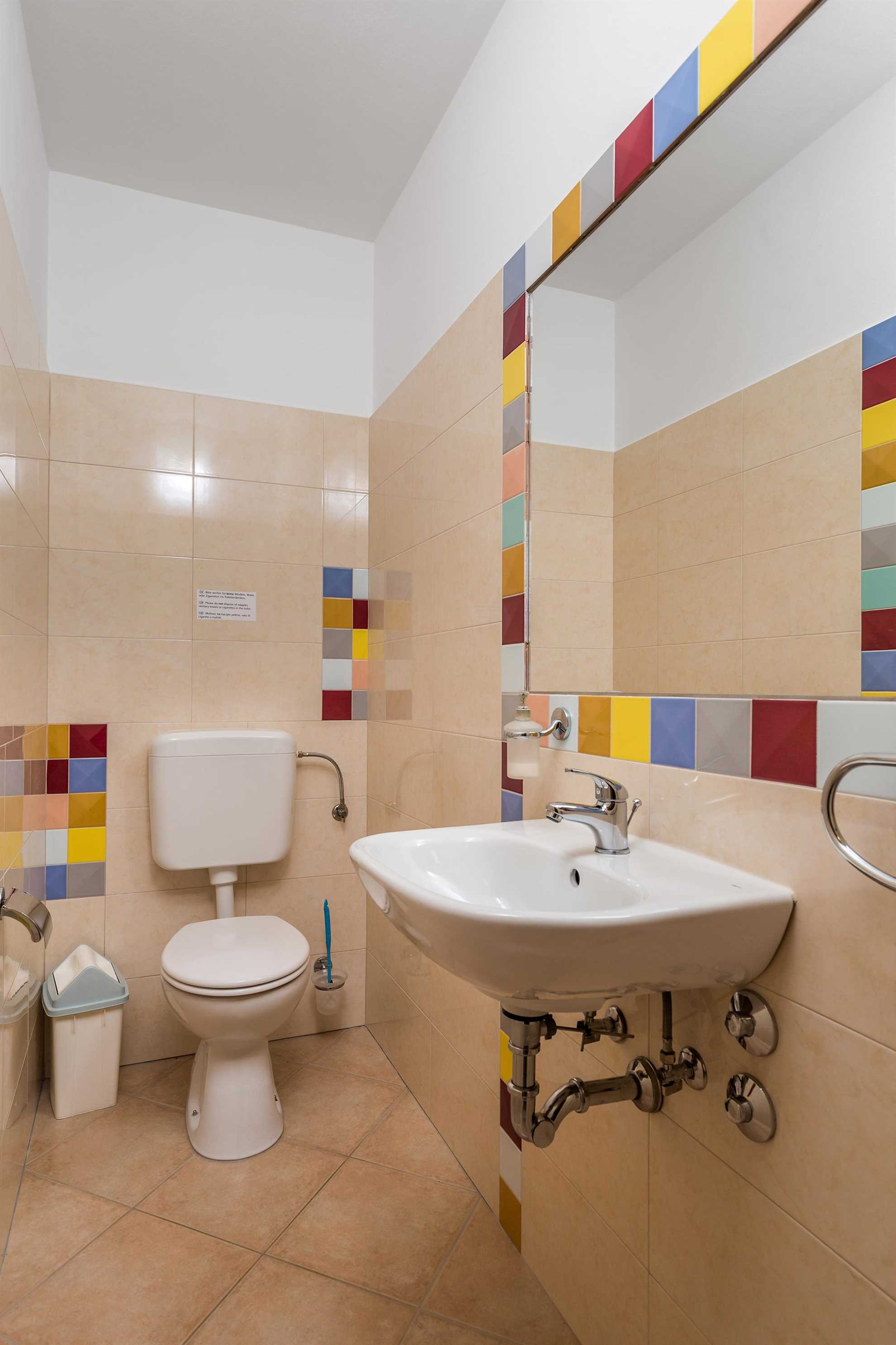 The living space flows seamlessly into the dining area and kitchen, with a direct connection to the private outdoor area, creating a bright and welcoming atmosphere. A Bluetooth speaker is also available for your enjoyment, and a guest toilet is conveniently located nearby.