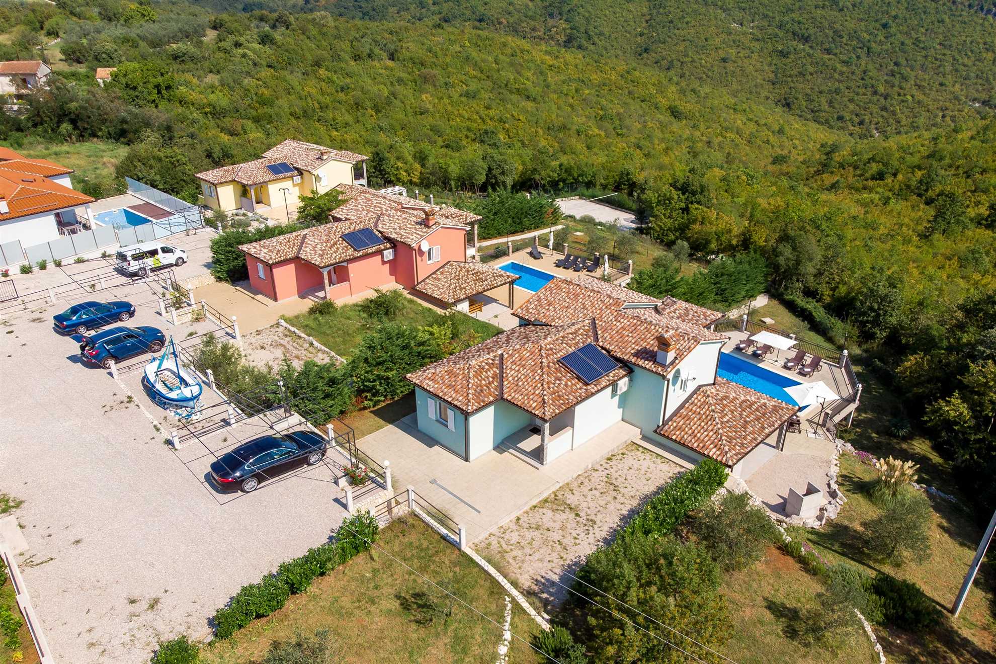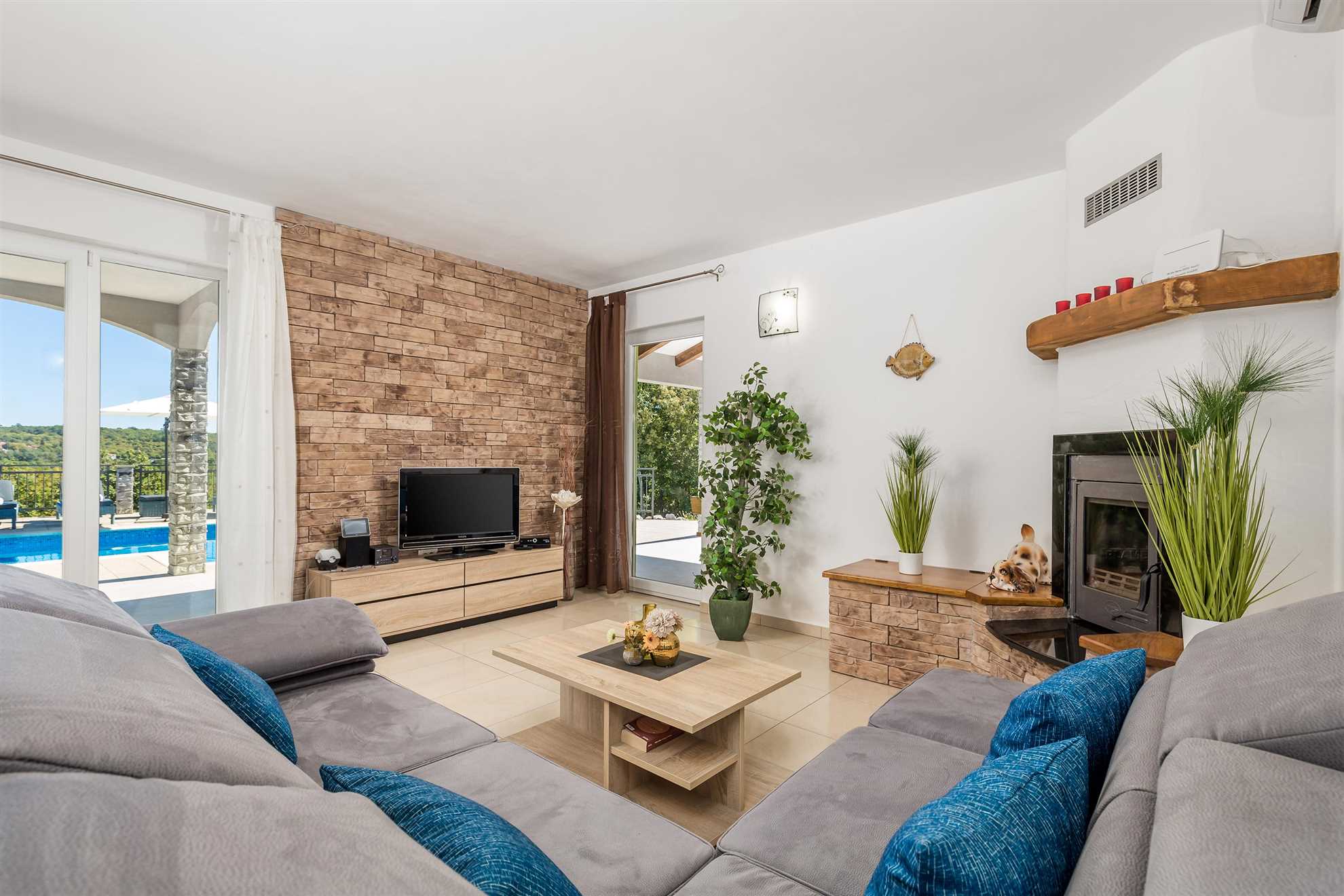 Set in the quiet village of Kunj, the 145 m² holiday home lies on a spacious 1,633 m² private plot, offering peace and privacy. Three bedrooms and three bathrooms provide comfort for everyone. Outdoors, a private pool, a sun deck with loungers, and shaded areas create a relaxed holiday vibe, while the covered terrace is ideal for outdoor dining and long summer evenings.