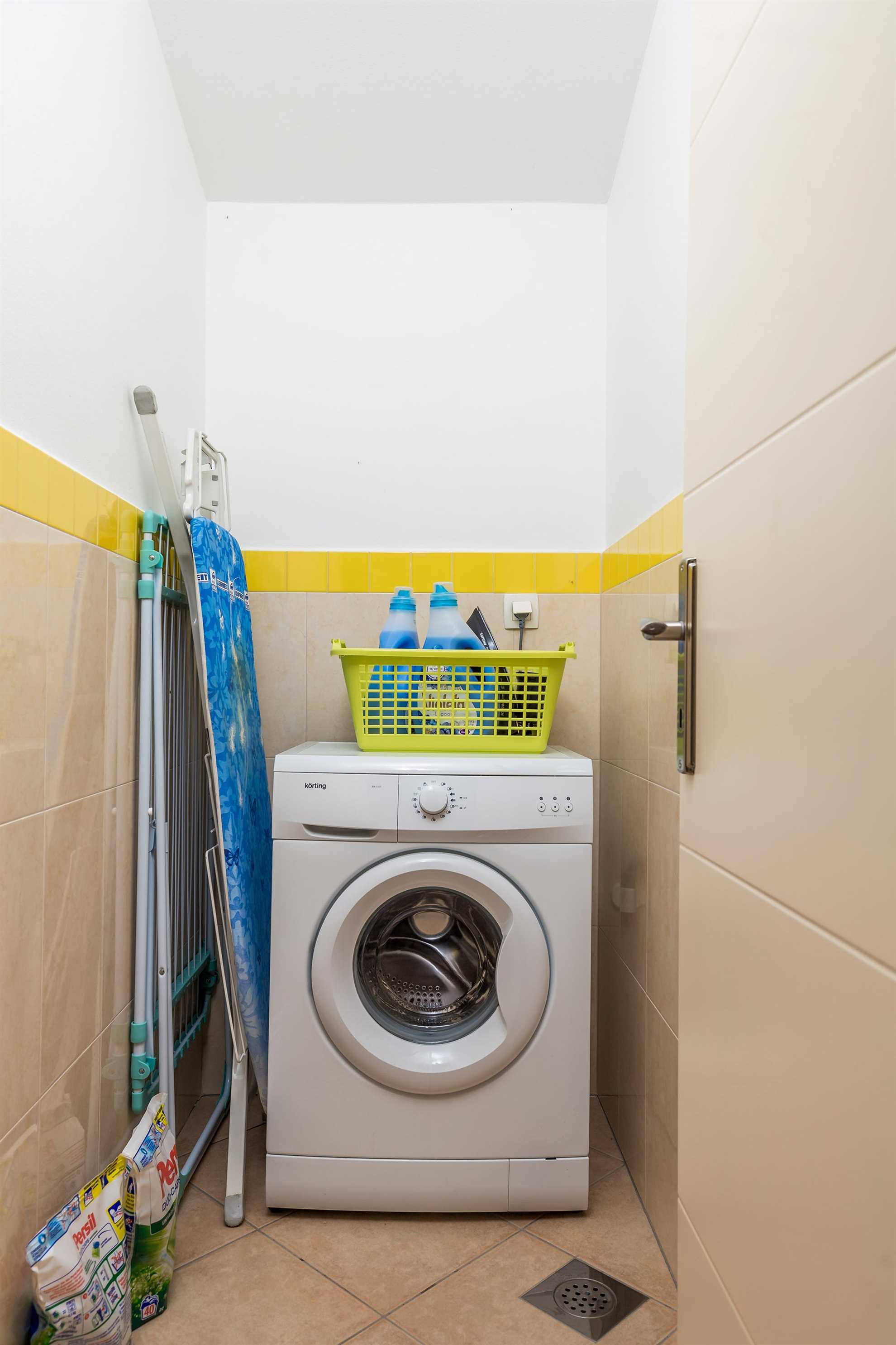 The house features three modern bathrooms, all equipped with rain showers, sinks, toilets, and hair dryers. An outdoor shower with hot and cold water is located near the pool area for added convenience. There is also a guest toilet and a small laundry room with a washing machine, dryer, drying rack, iron, ironing board, and vacuum cleaner.