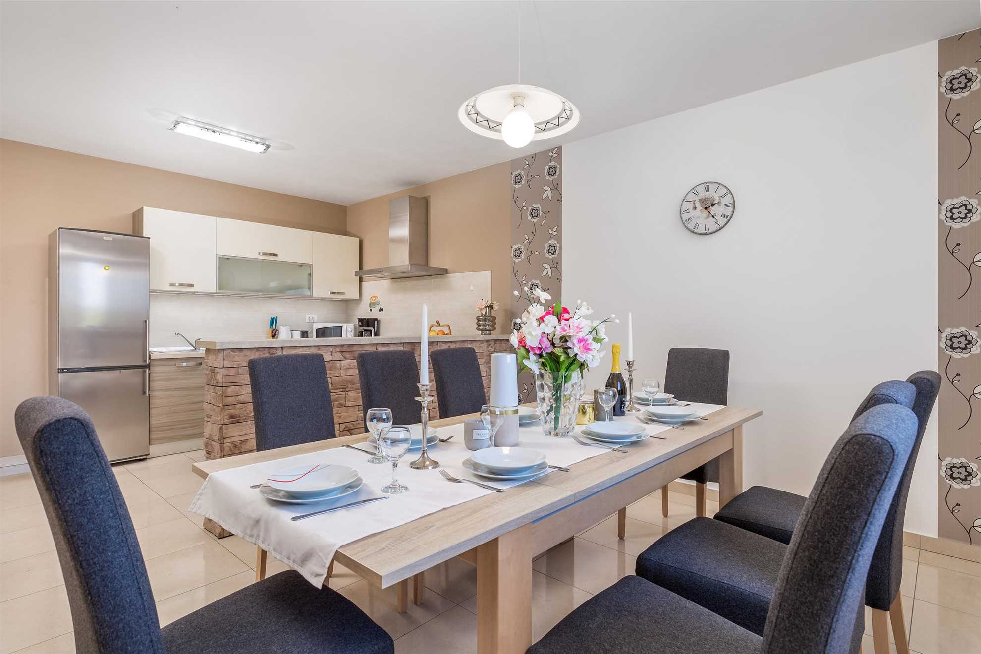 The fully equipped kitchen and dining area comfortably accommodates up to six guests. Modern appliances include a refrigerator with freezer and ice maker, gas and electric stove, oven, microwave, toaster, kettle, filter coffee machine, and a NESCAFÉ Dolce Gusto coffee machine — everything you need for easy holiday cooking and shared meals.