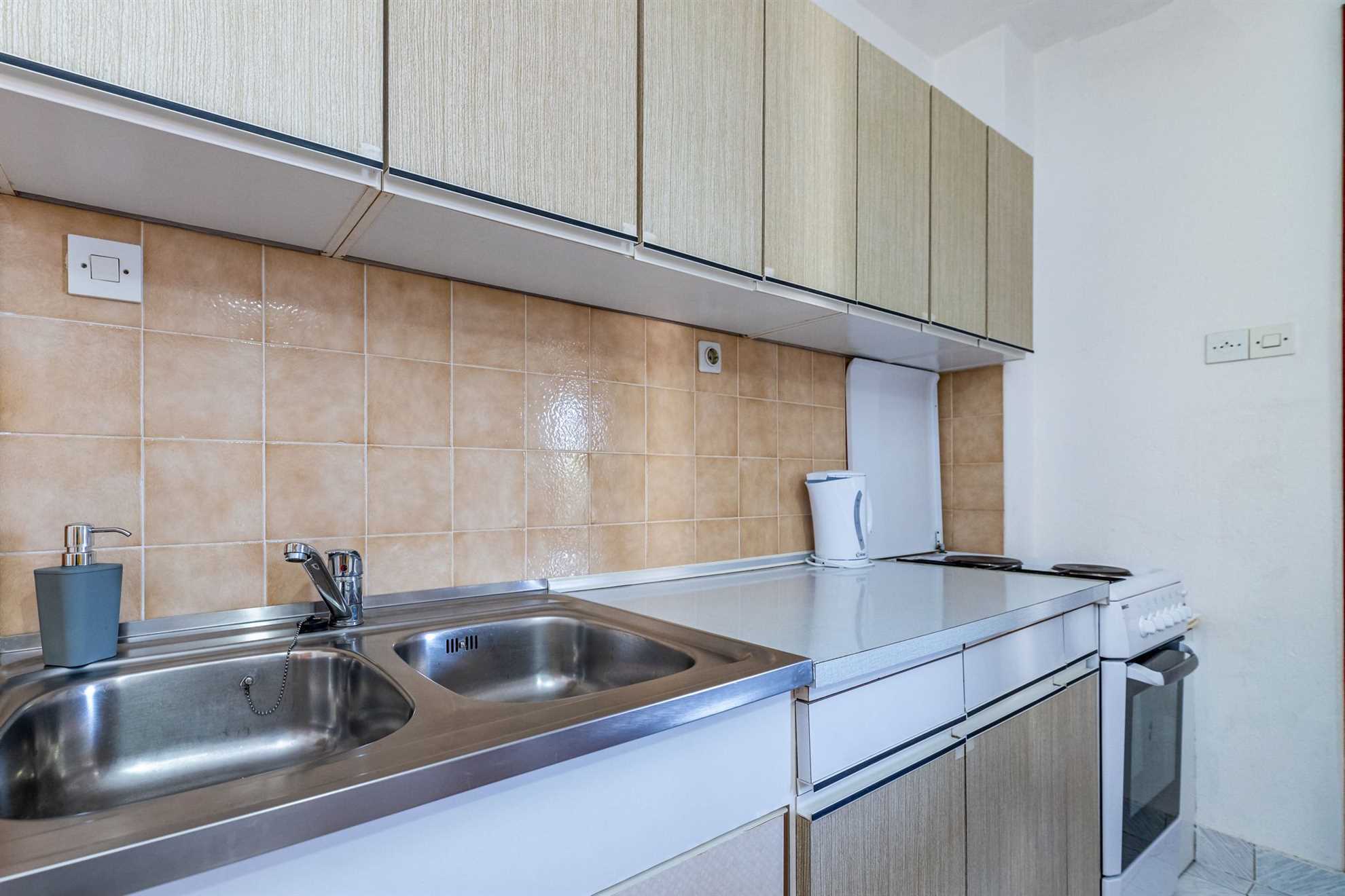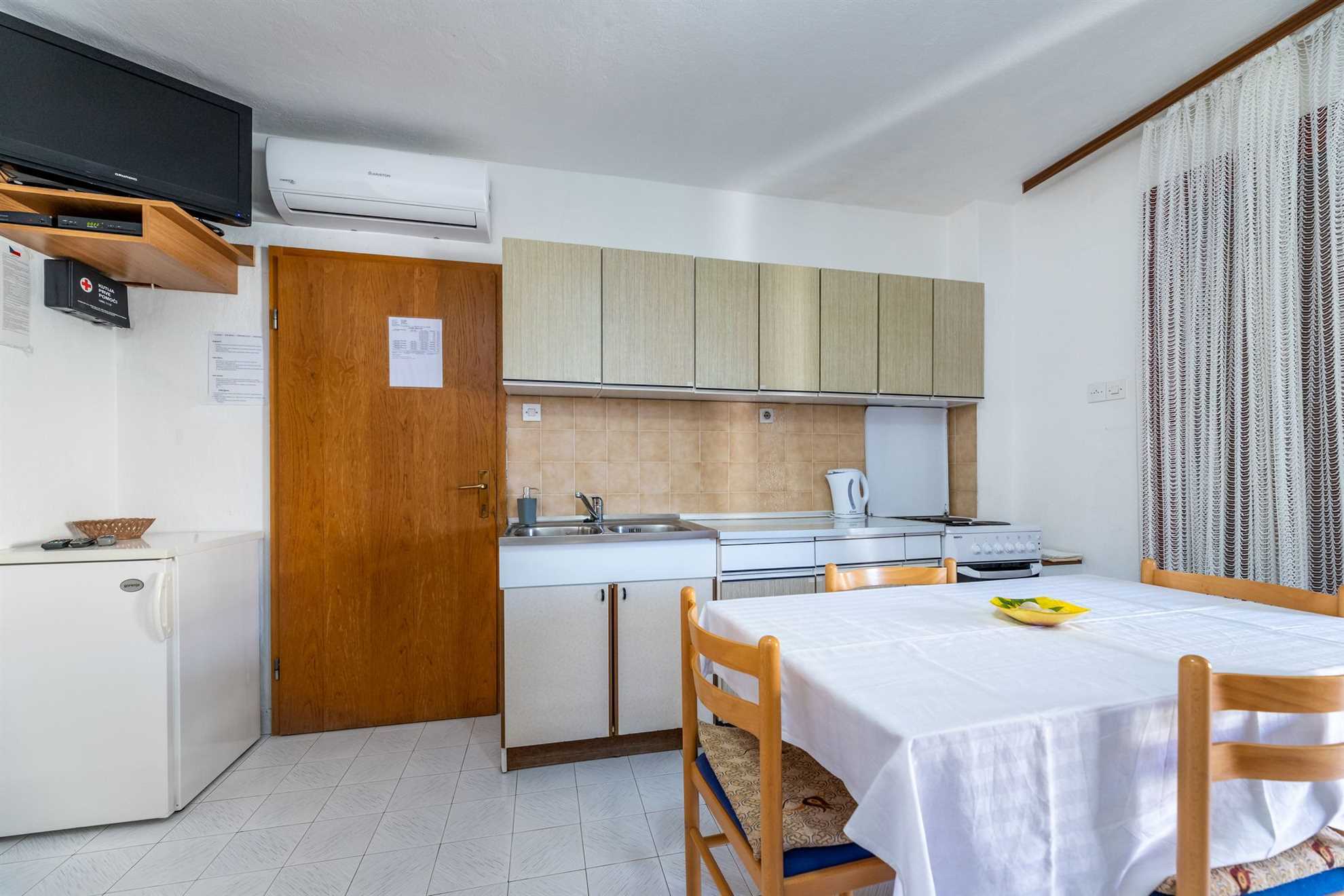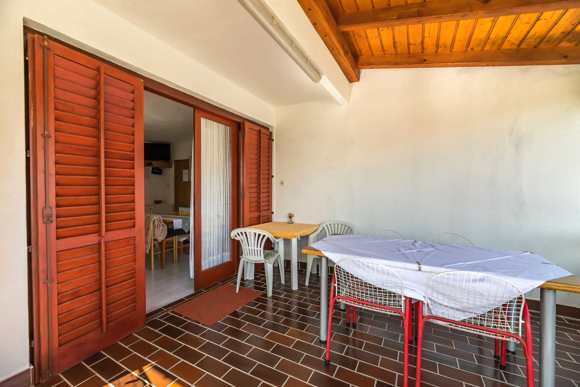 The 35 m² apartment features a comfortable double bedroom with an extra bed, a spacious living and dining area with SAT-TV, a well-equipped kitchen with electric and gas cooker, fridge with freezer, oven and a filter coffee machine, and a bathroom with shower and natural light. The highlight of the apartment is the large private shaded terrace, ideal for outdoor dining, relaxing mornings, or peaceful evenings in the Mediterranean air.