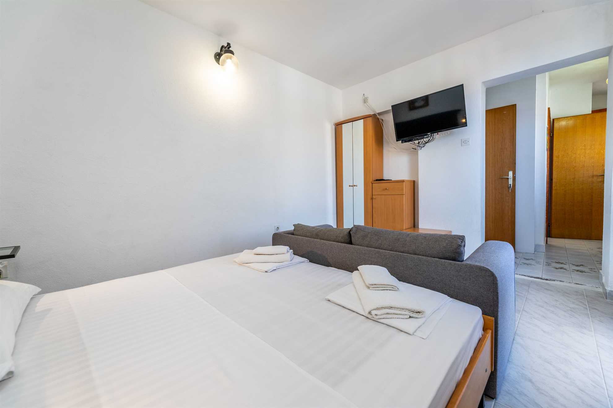The 30 m² apartment features a comfortable double bedroom with an additional bed, a compact and well-equipped kitchenette with an electric stove, fridge and filter coffee machine, and a bathroom with a shower and natural light. From the private balcony, guests can enjoy open views of the sea and the gentle Mediterranean atmosphere — ideal for slow mornings or relaxed evenings.