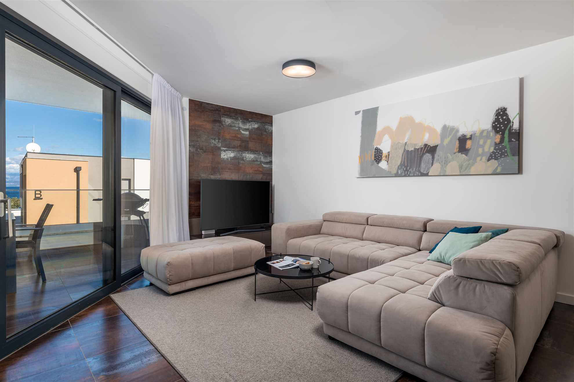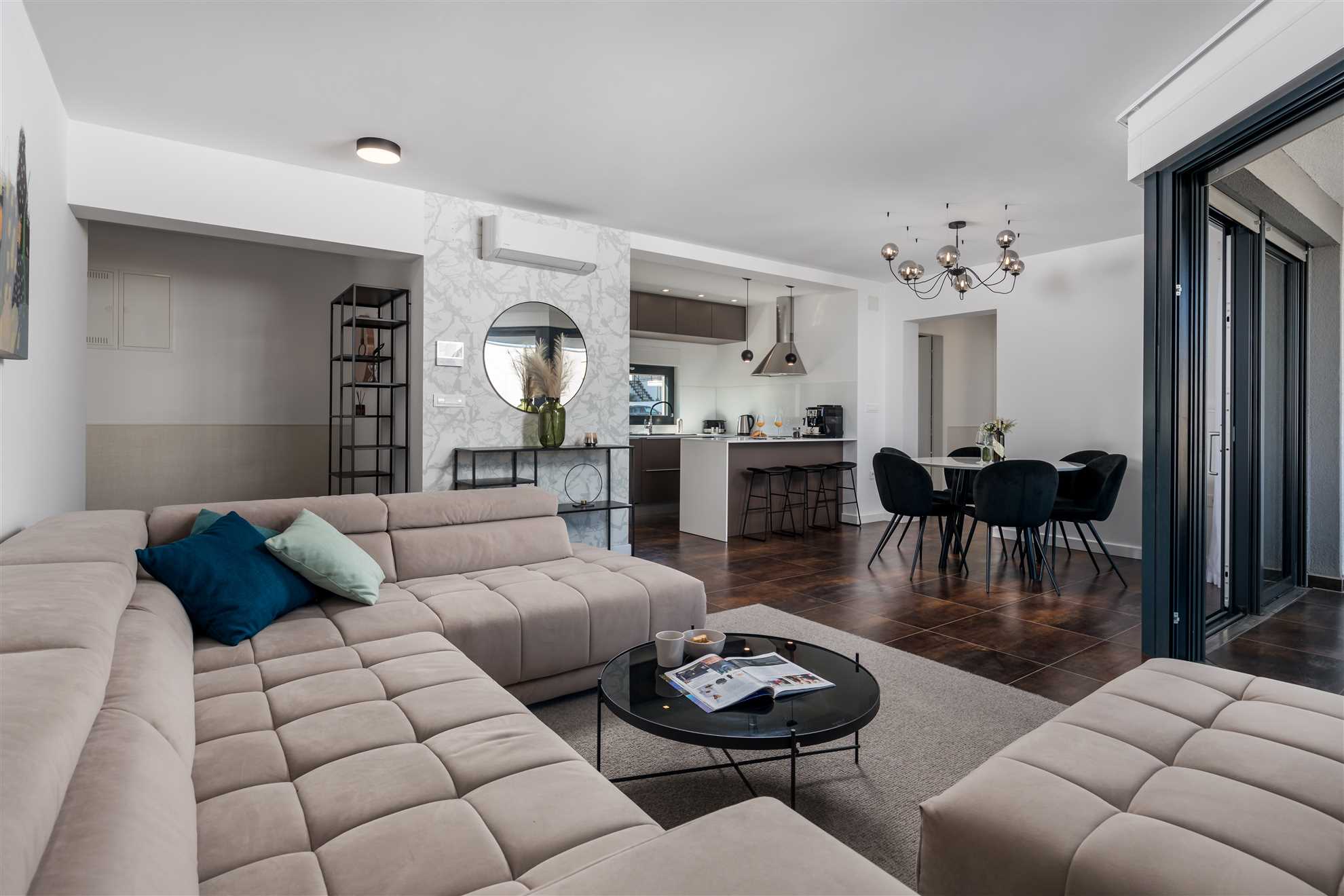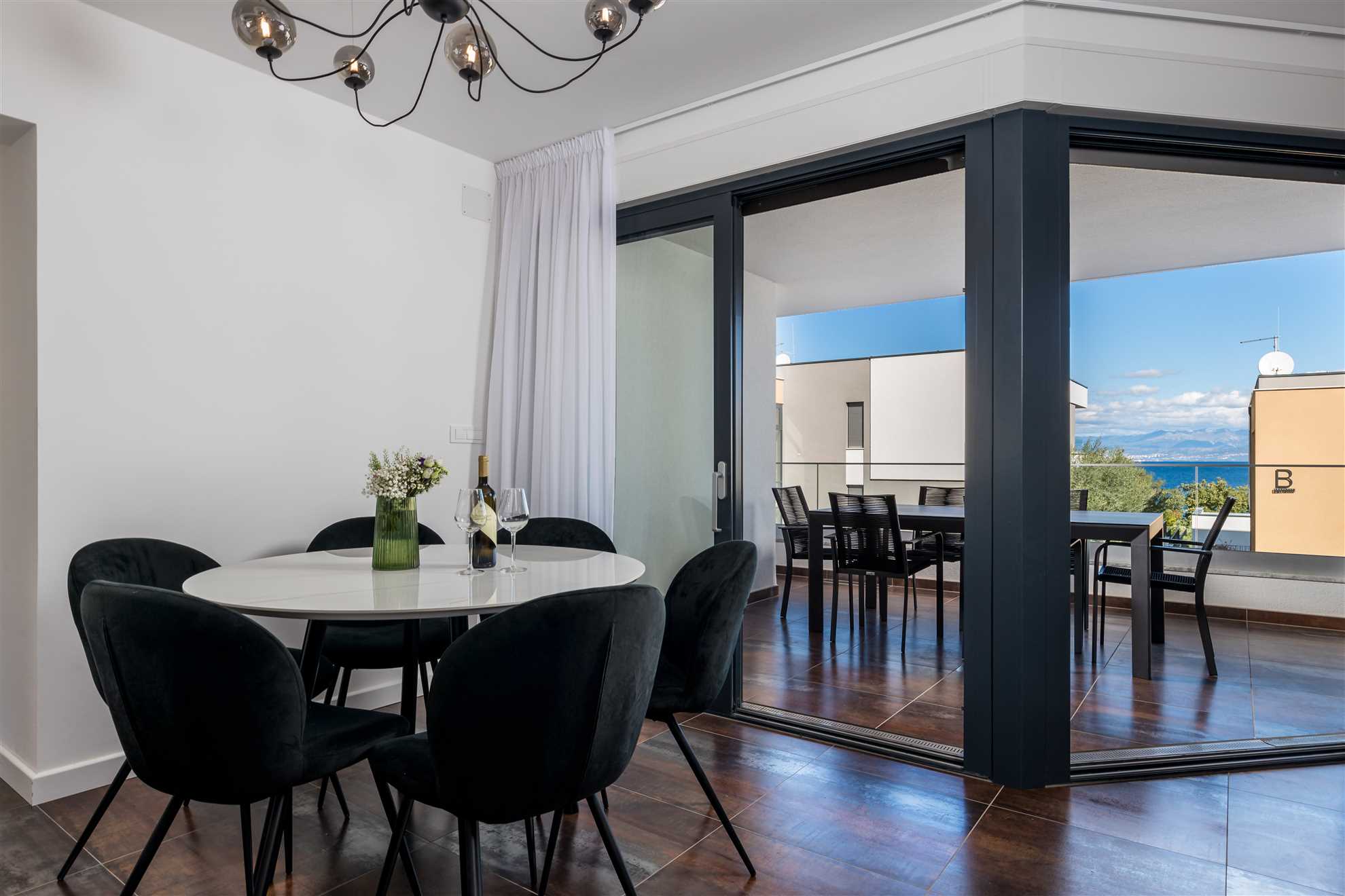 Welcome to the exceptional Apartment in Villa Rova, where top-notch modern comfort meets enchanting Mediterranean charm. This prestigious apartment, located on the first floor of the elegant villa, offers the perfect combination of comfort, luxury, and picturesque views of the Adriatic Sea. The apartment spans 84 m² of thoughtfully designed space, featuring elegant interiors and ample room, ideal for families or groups of up to 5 guests. The bright and spacious living room with comfortable seating is perfect for relaxed family moments or socializing while watching TV, while the panoramic views through large windows create a sense of connection with nature and the sea.