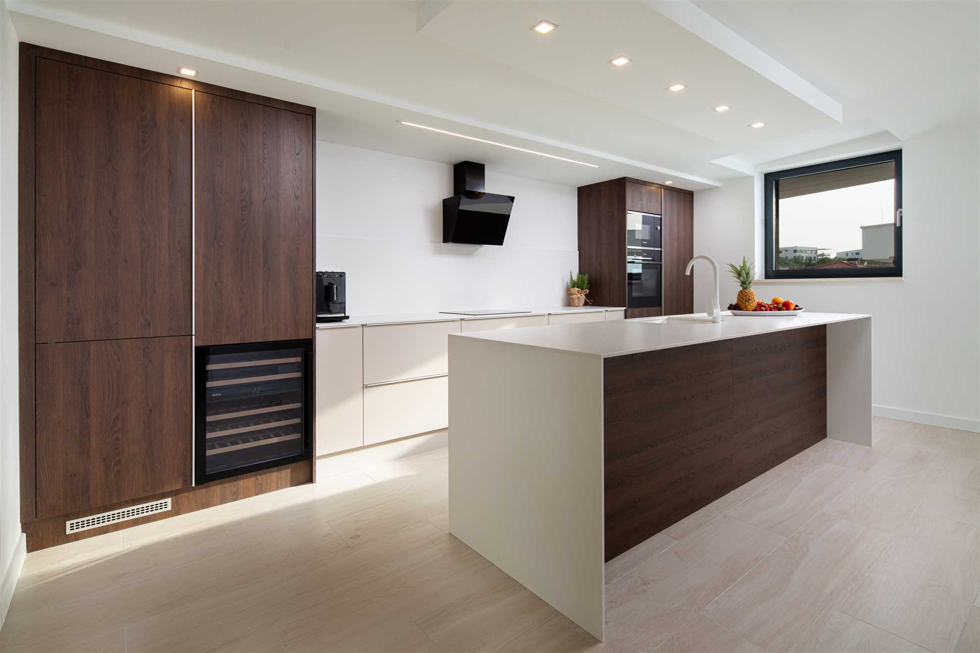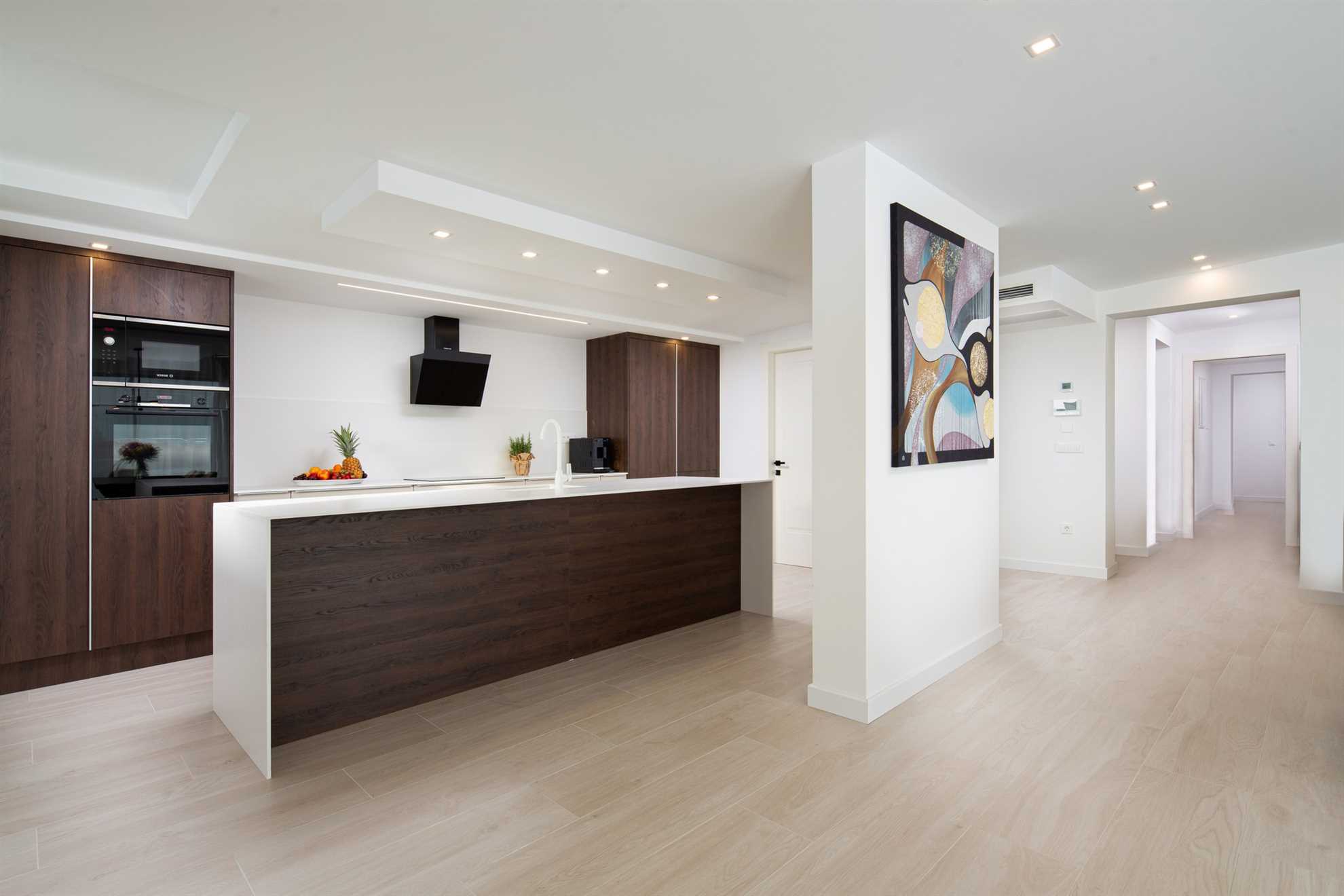 The penthouse is designed to offer a sense of space and light. The spacious living room with comfortable seating and dining area, connected to an open kitchen, is the heart of the apartment, ideal for family moments or social gatherings. The kitchen is fully equipped with high-quality appliances, including a dishwasher, coffee machine, oven, and fridge with oven, allowing you to prepare meals just like at home.