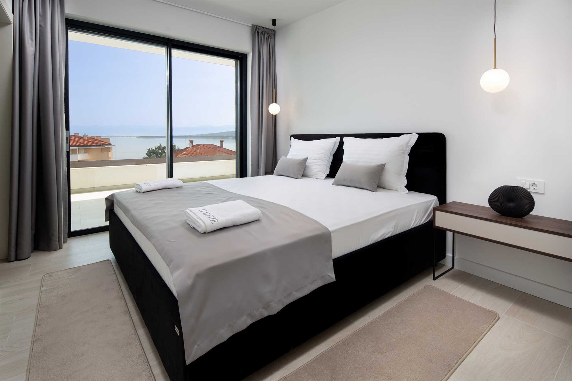 This prestigious penthouse is located in a modern apartment resort in Malinska, a picturesque town on the west coast of Krk Island, offering top-class accommodation for up to 7 guests. The apartment combines modern luxury, comfort, and a unique location with panoramic views of the Adriatic Sea, the surrounding greenery, and a quiet street.
