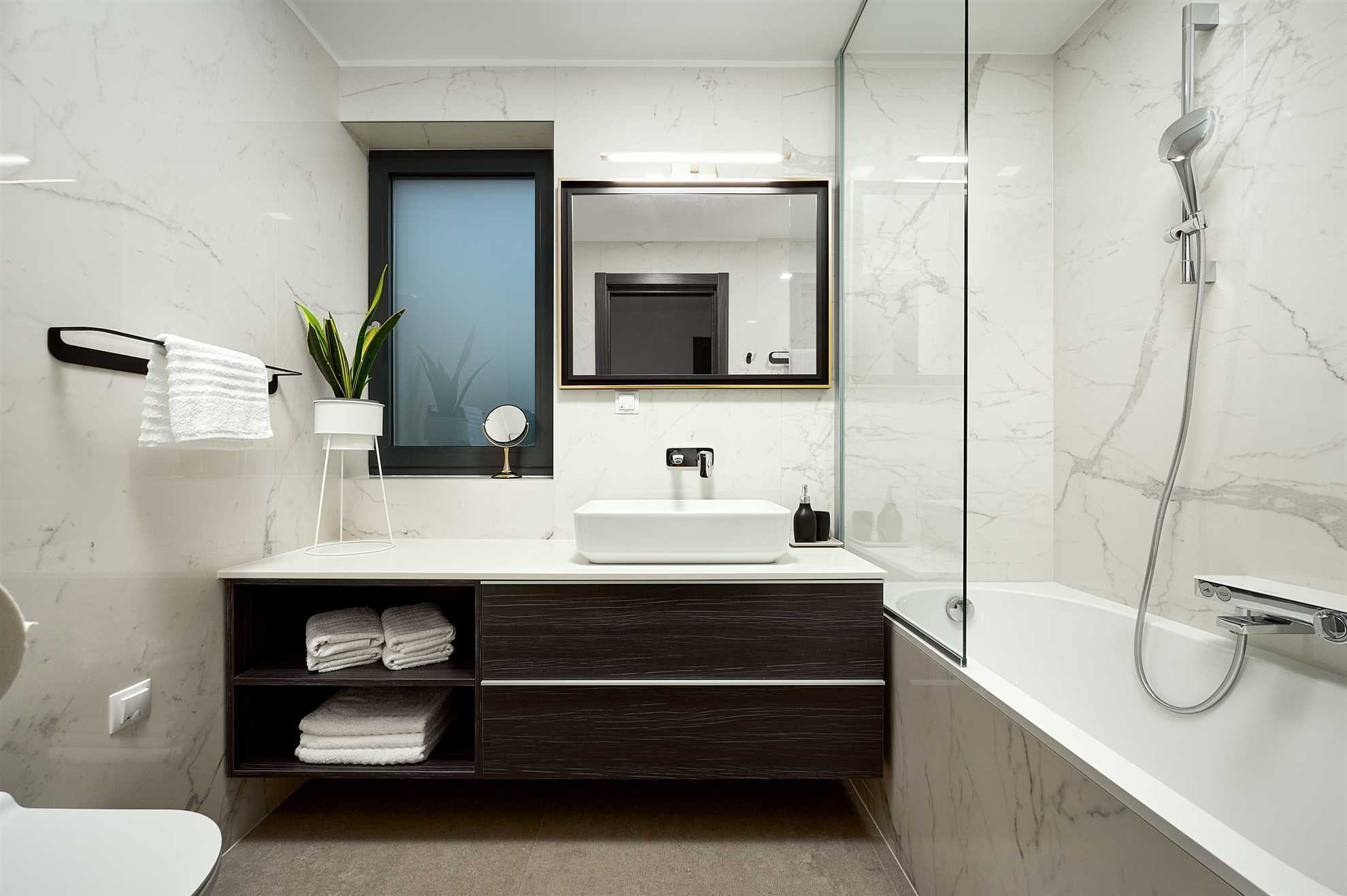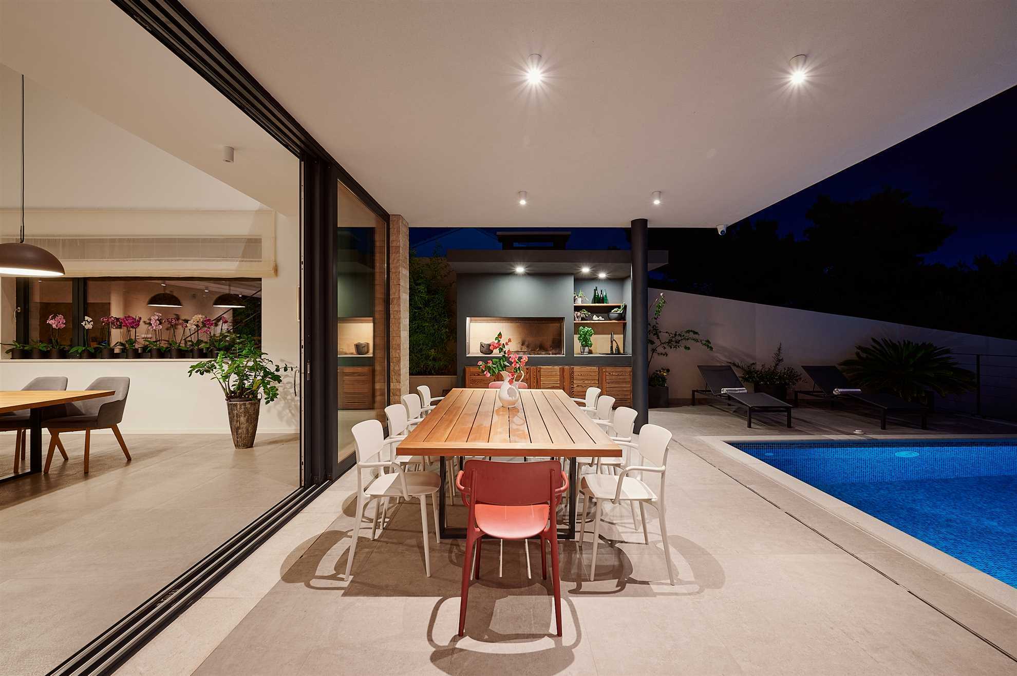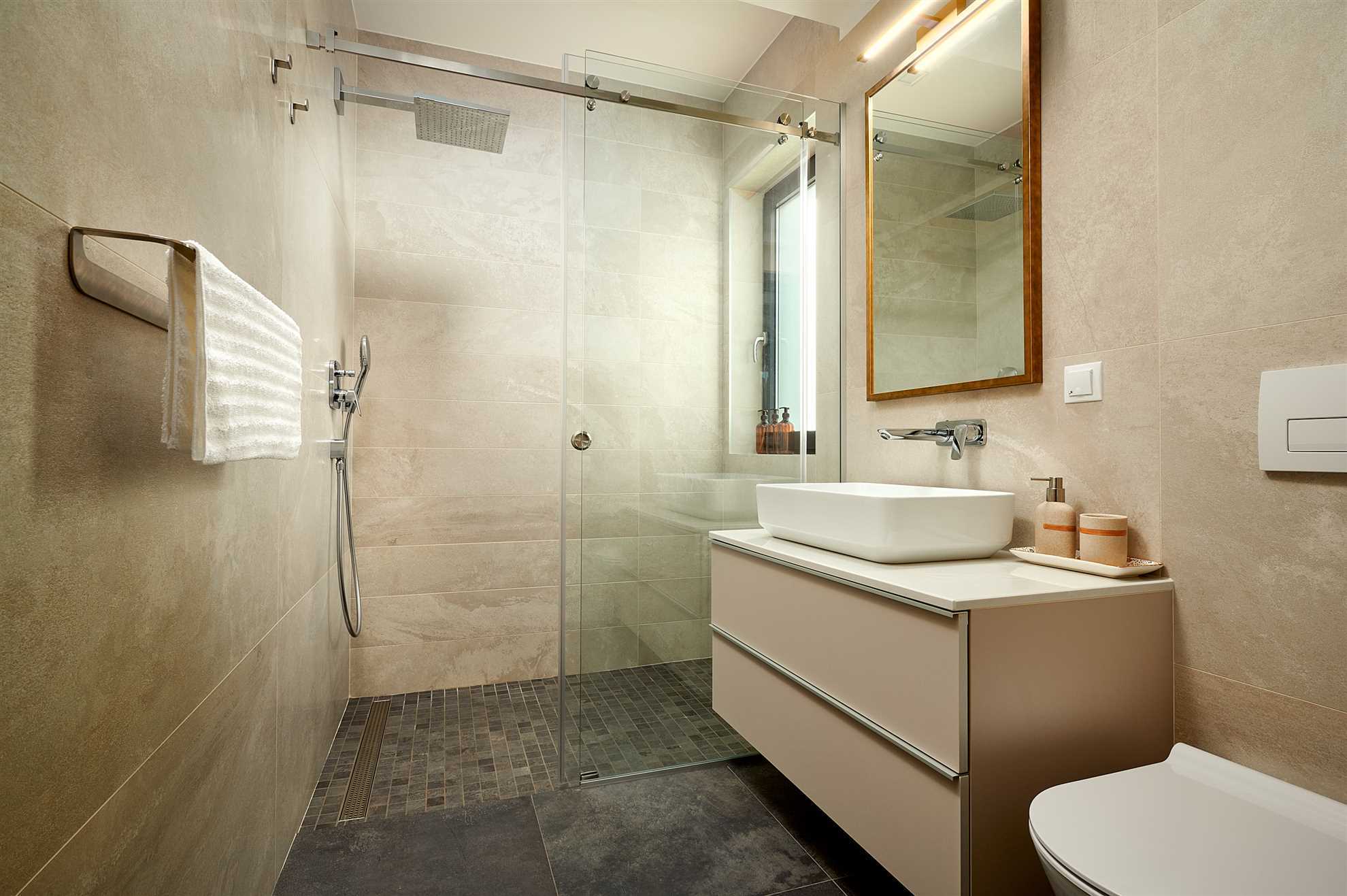 On the upper floor, three additional bedrooms await, two with en-suite bathrooms and uninterrupted sea views. Abundant natural light fills the rooms, creating a bright and calming atmosphere throughout the villa.