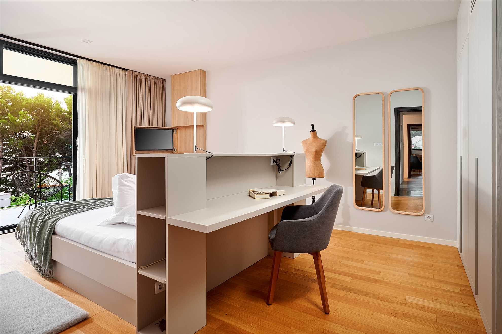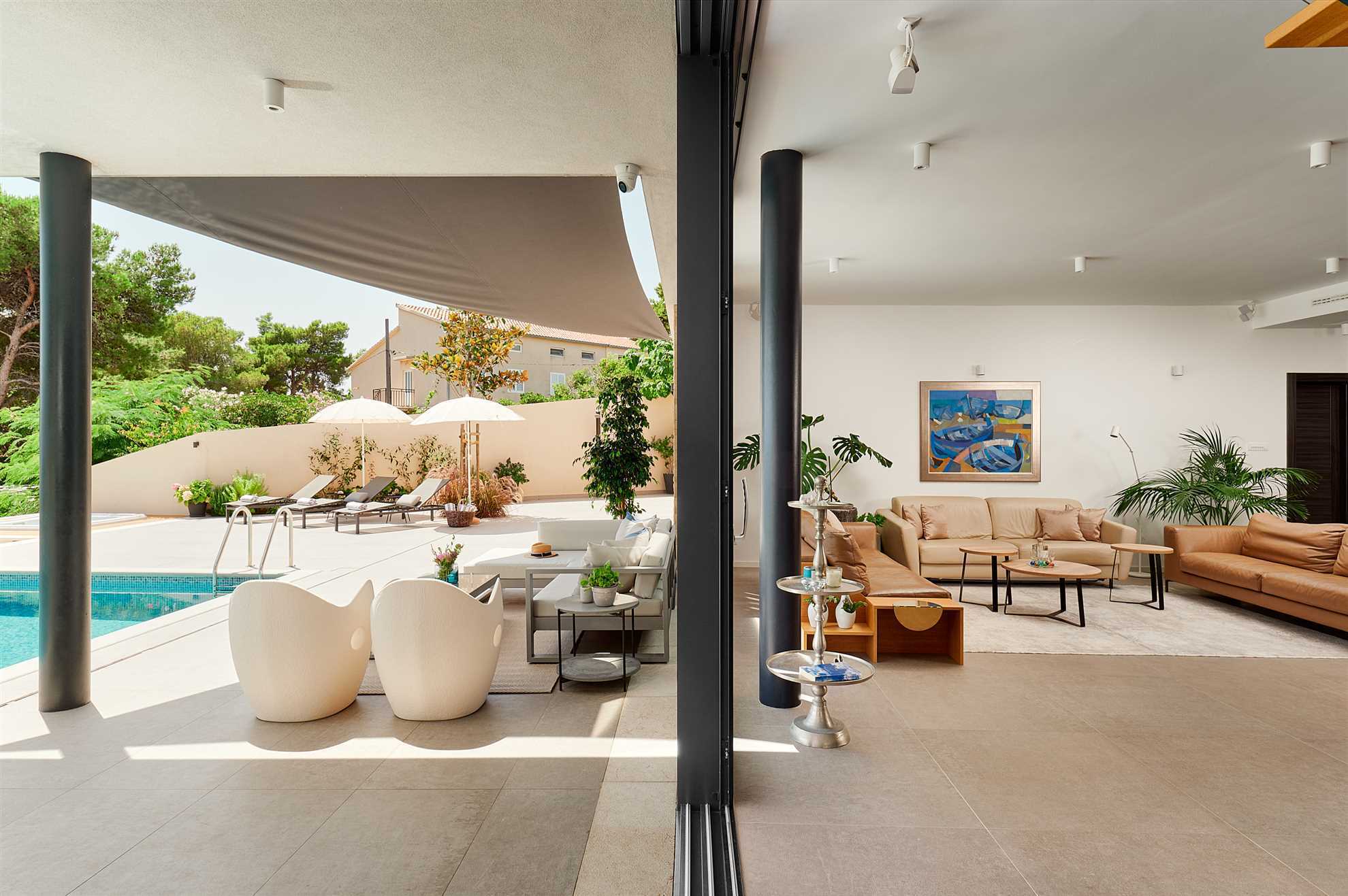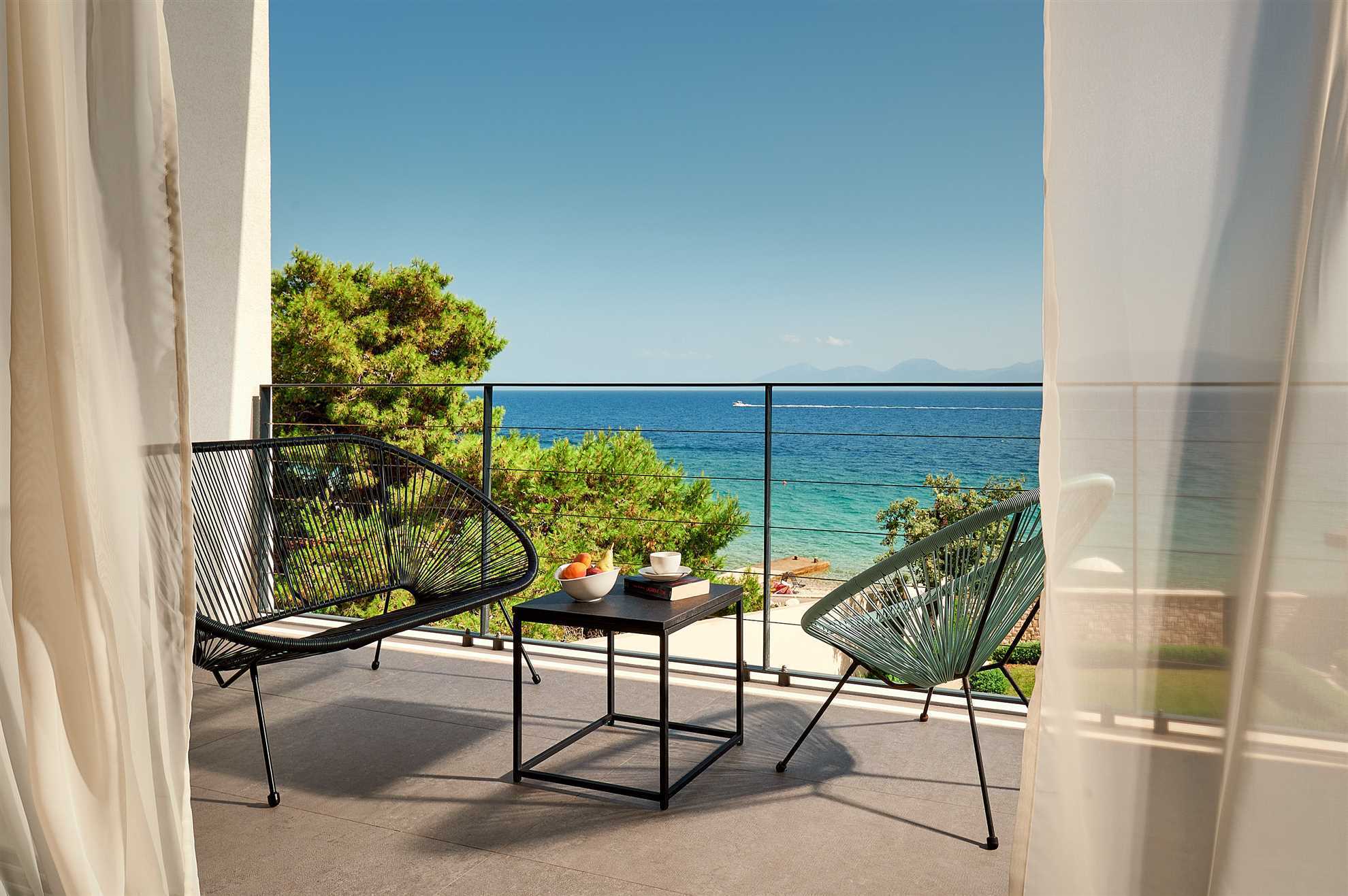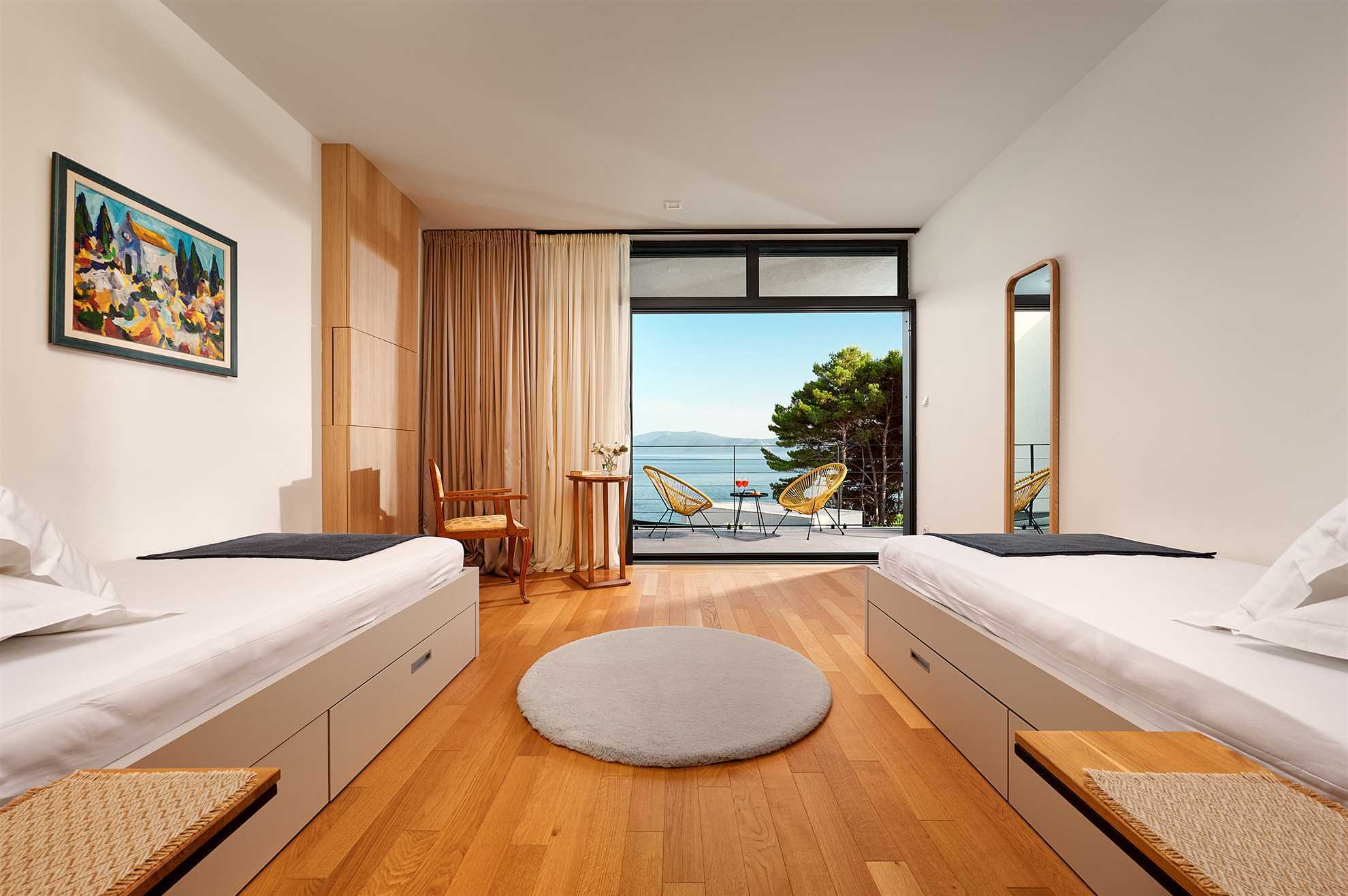 Facing the open sea, the villa offers a direct connection to nature and the Adriatic coastline. On the upper floor, a cozy lounge area creates an ideal spot for morning coffee or evening cocktails with panoramic sea views.