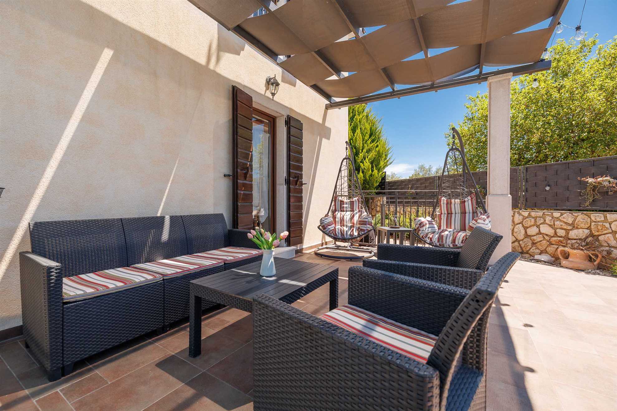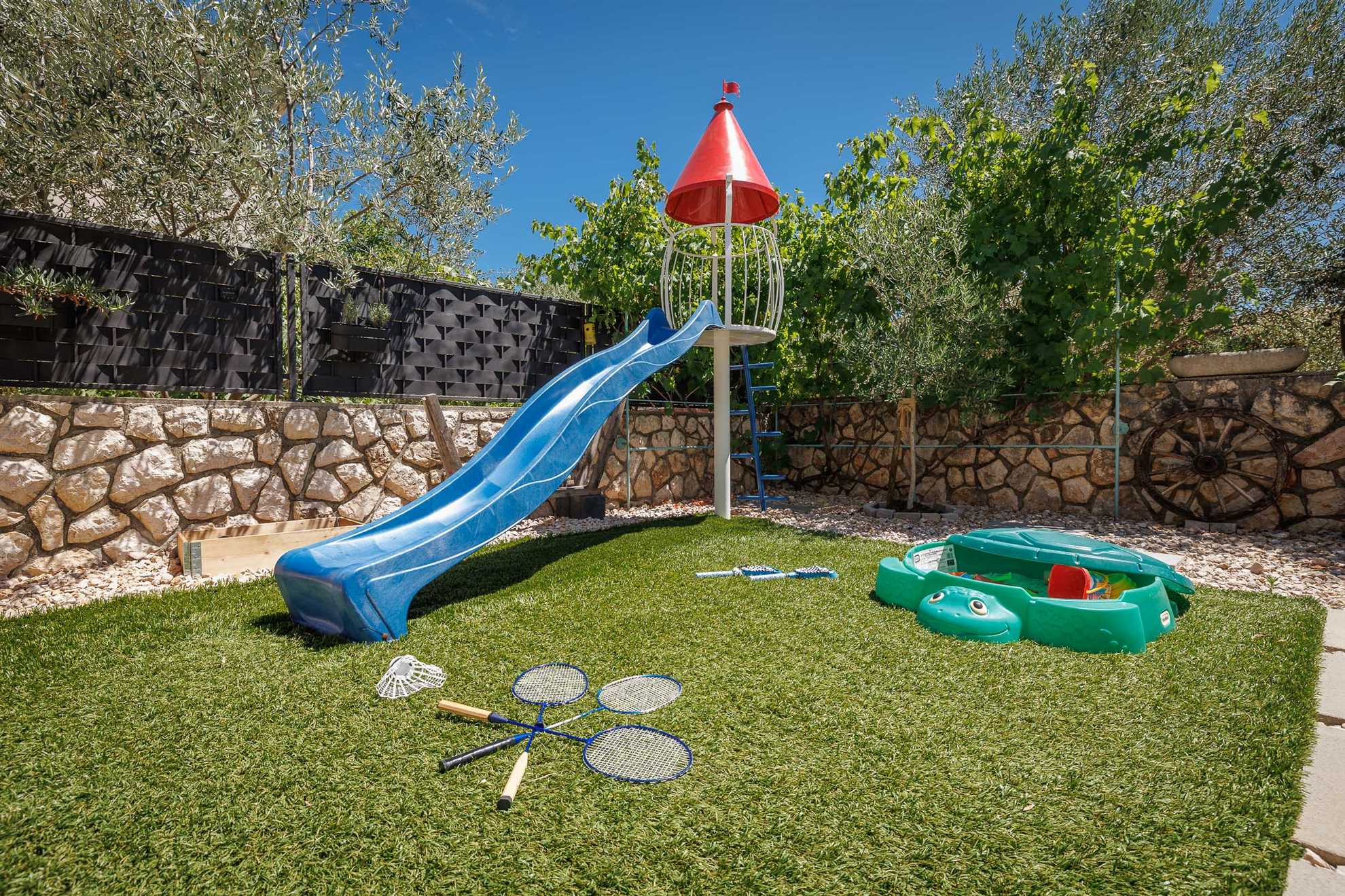 The garden surrounding the villa is carefully designed to offer maximum privacy while also including a children's playground, perfect for younger guests who want to have fun in the fresh air. The design of the garden allows for relaxation in the silence provided by the peaceful environment, meaning you can enjoy every moment without any disturbances.