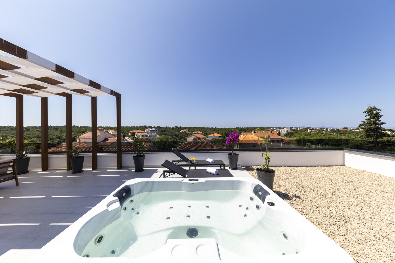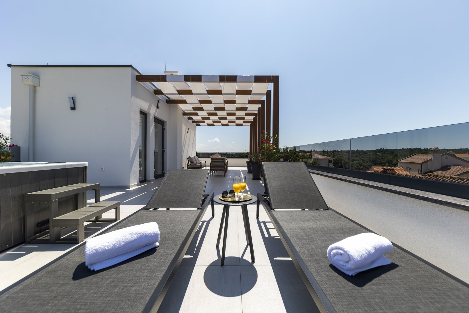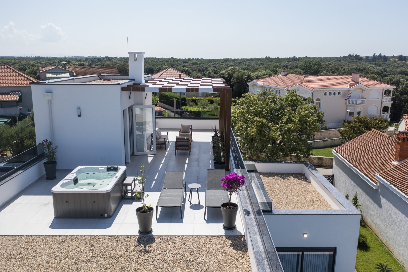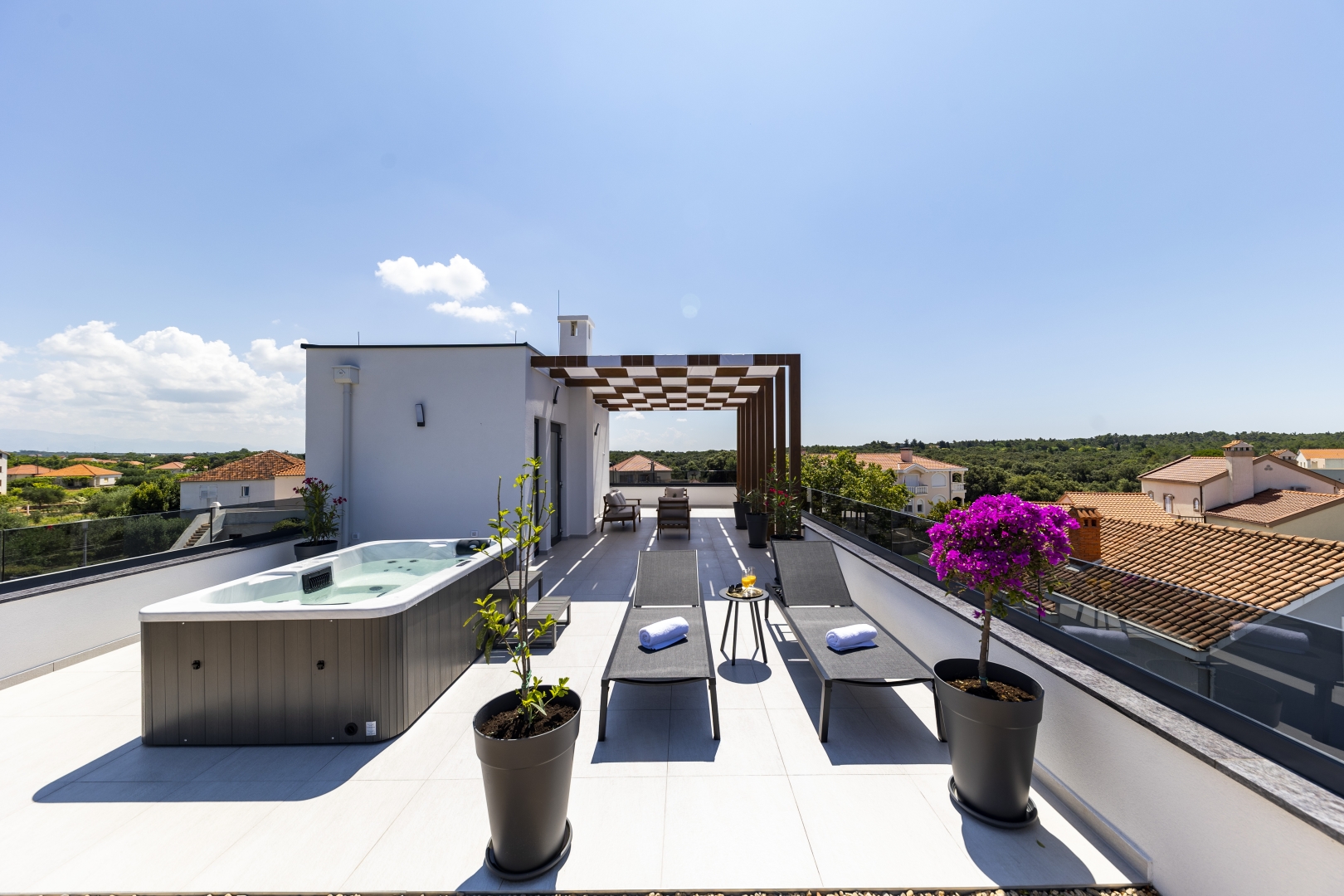 The top floor is dedicated to pure indulgence. From the rooftop terrace, guests can enjoy stunning views of the surrounding greenery while relaxing in the high-quality jacuzzi. Comfortable garden furniture invites you to unwind, while part of the terrace is shaded by a pergola, ensuring comfort throughout the day.