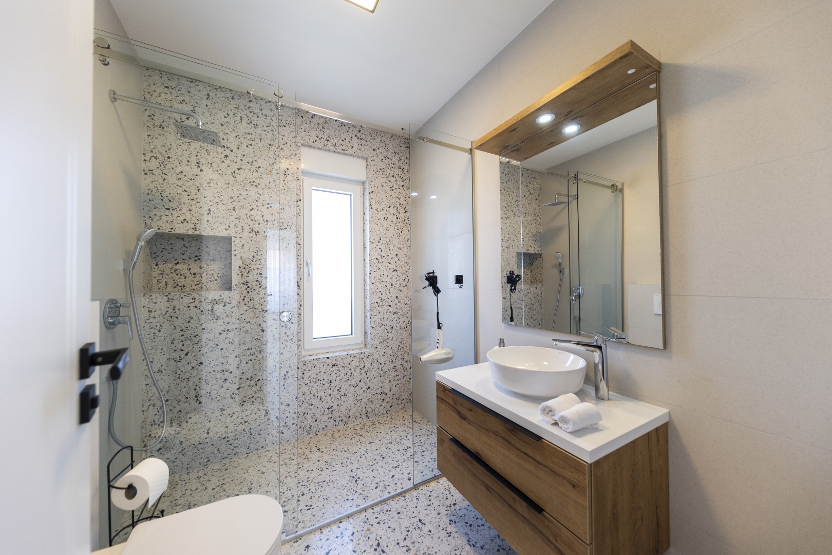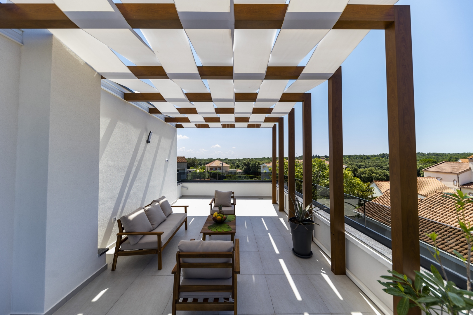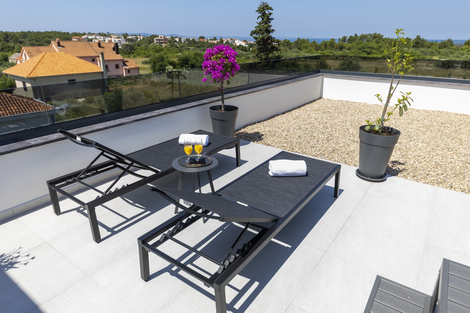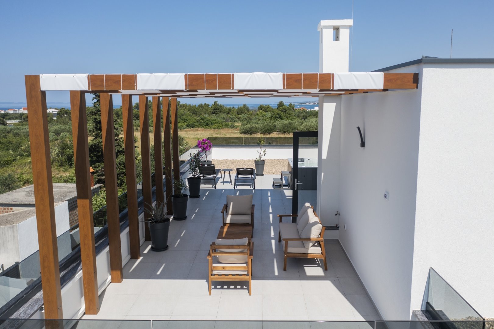 The top floor is dedicated to pure indulgence. From the rooftop terrace, guests can enjoy stunning views of the surrounding greenery while relaxing in the high-quality jacuzzi. Comfortable garden furniture invites you to unwind, while part of the terrace is shaded by a pergola, ensuring comfort throughout the day.
