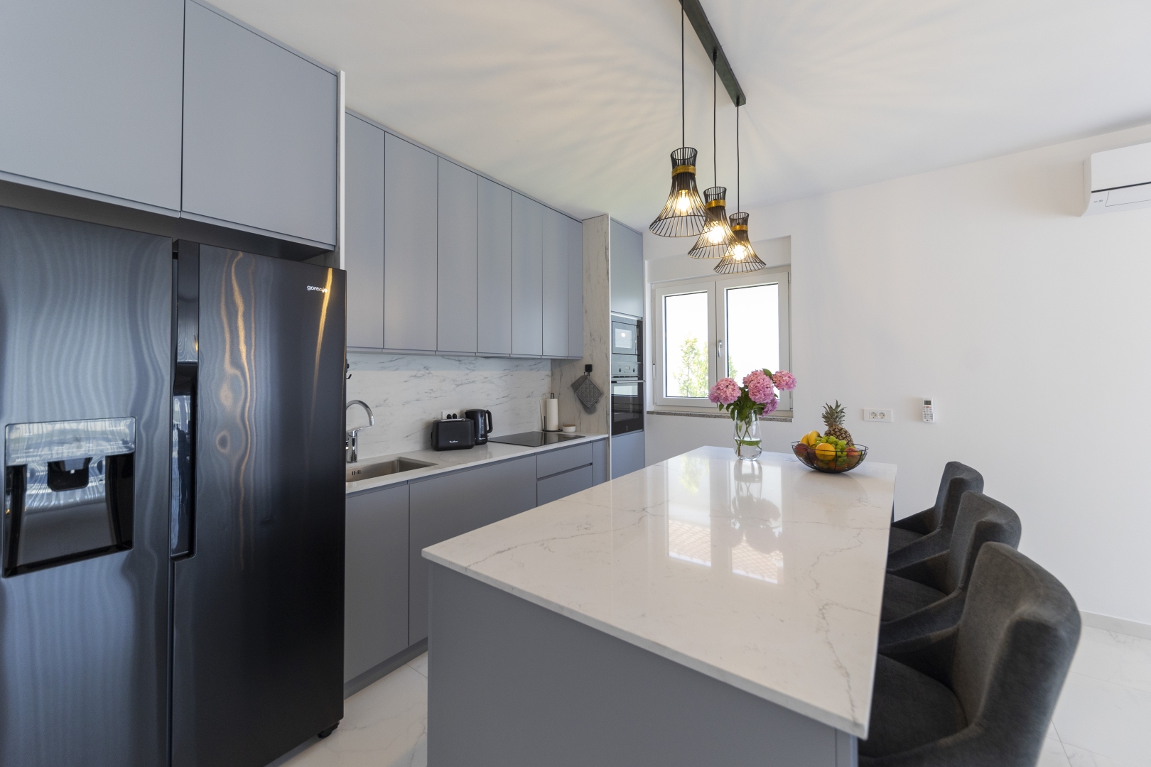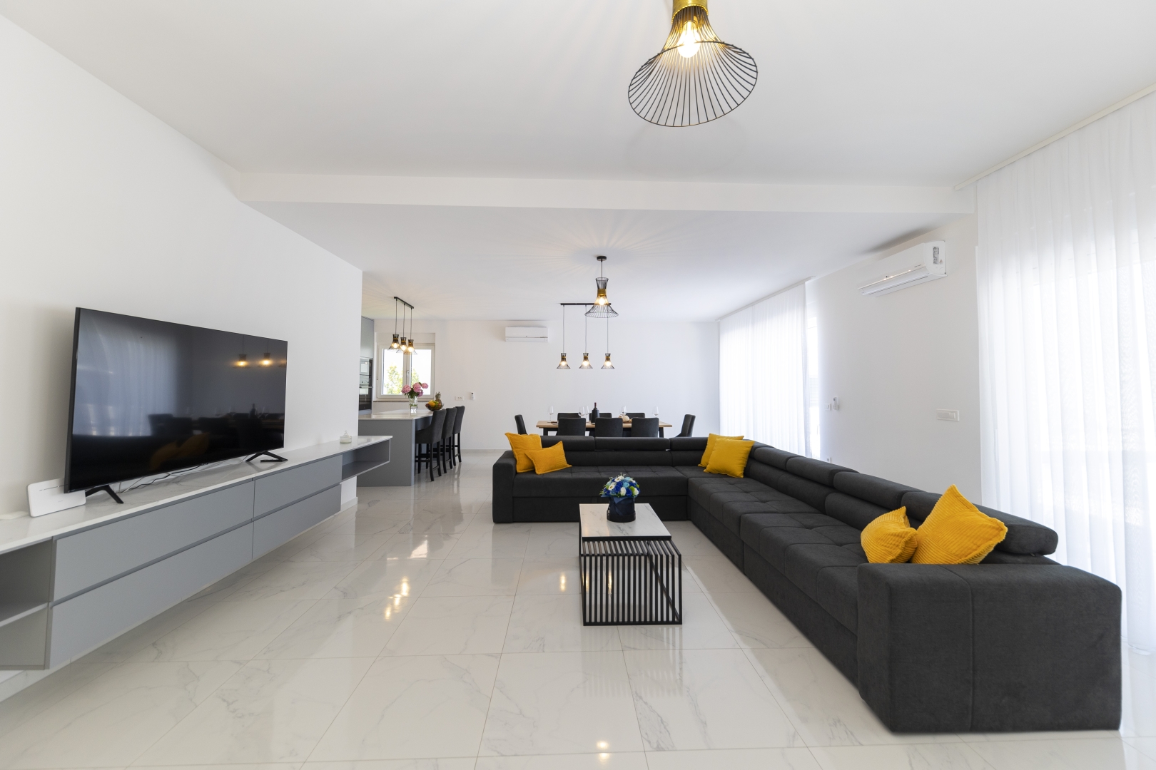 The villa offers three comfortable bedrooms, each with its own en-suite bathroom and elegant Italian-style showers. Every bedroom is air-conditioned and equipped with wardrobes, bedside tables, and a TV.