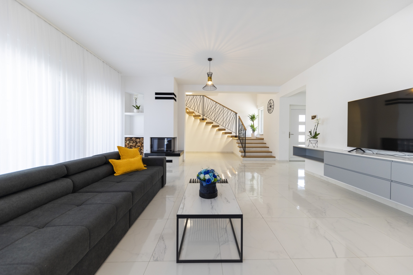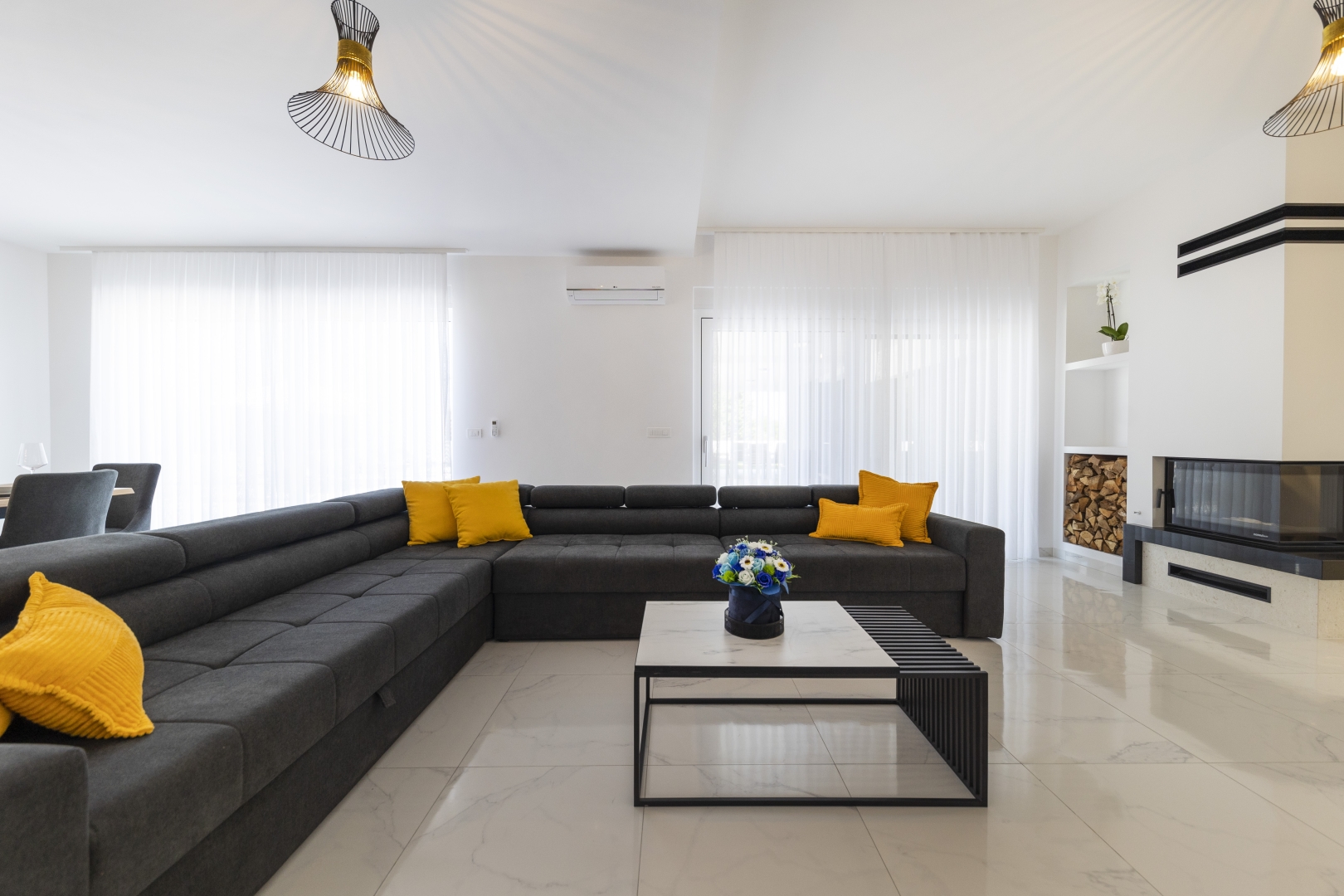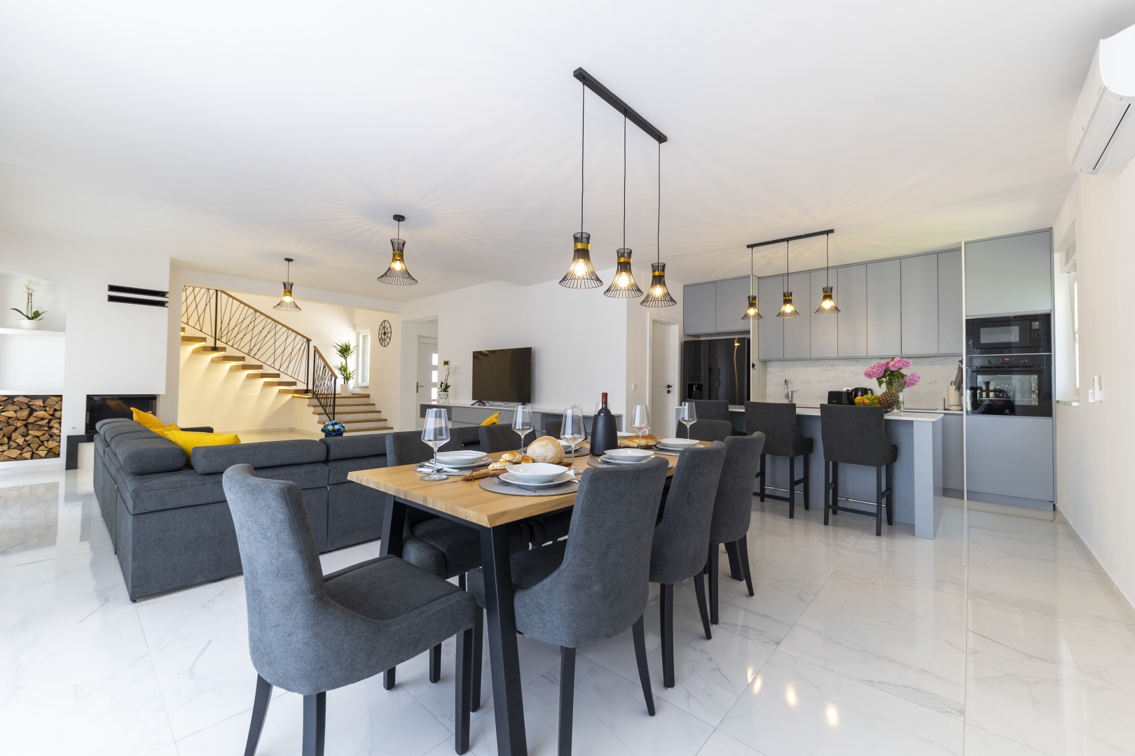 The ground floor features a spacious, air-conditioned, and elegantly designed living room with a fireplace and a large TV, offering direct views of the swimming pool and garden. This layout is ideal for families with children, allowing parents to comfortably supervise the youngest guests.