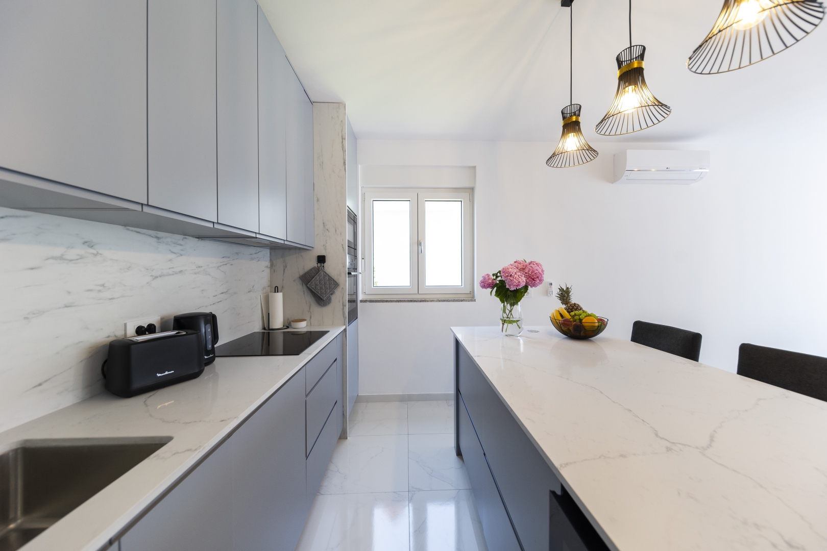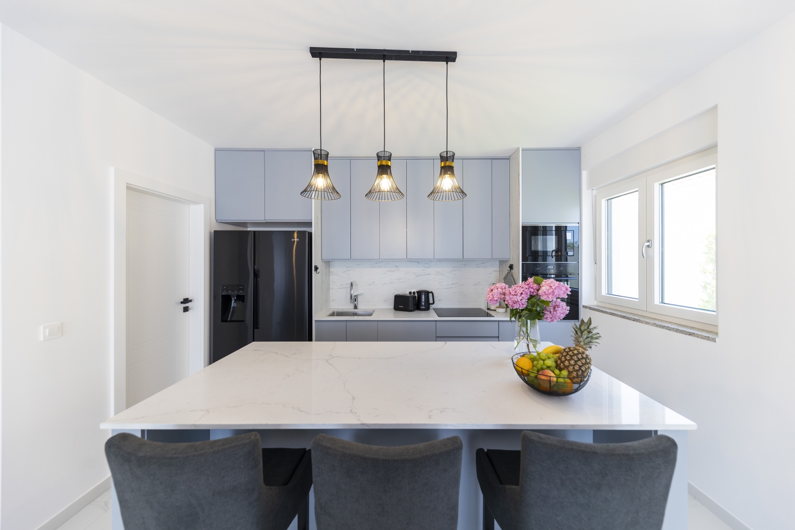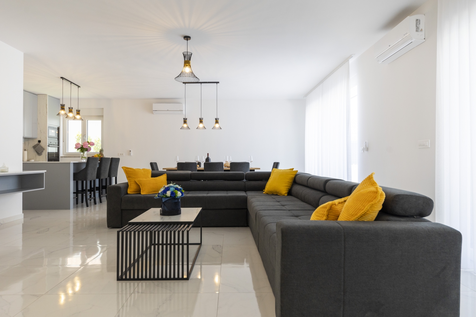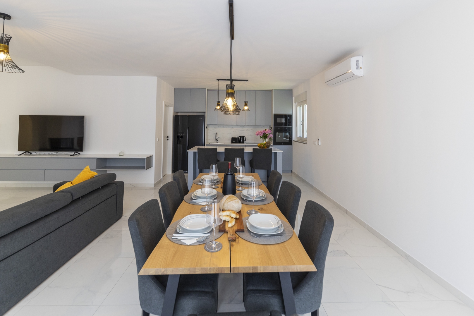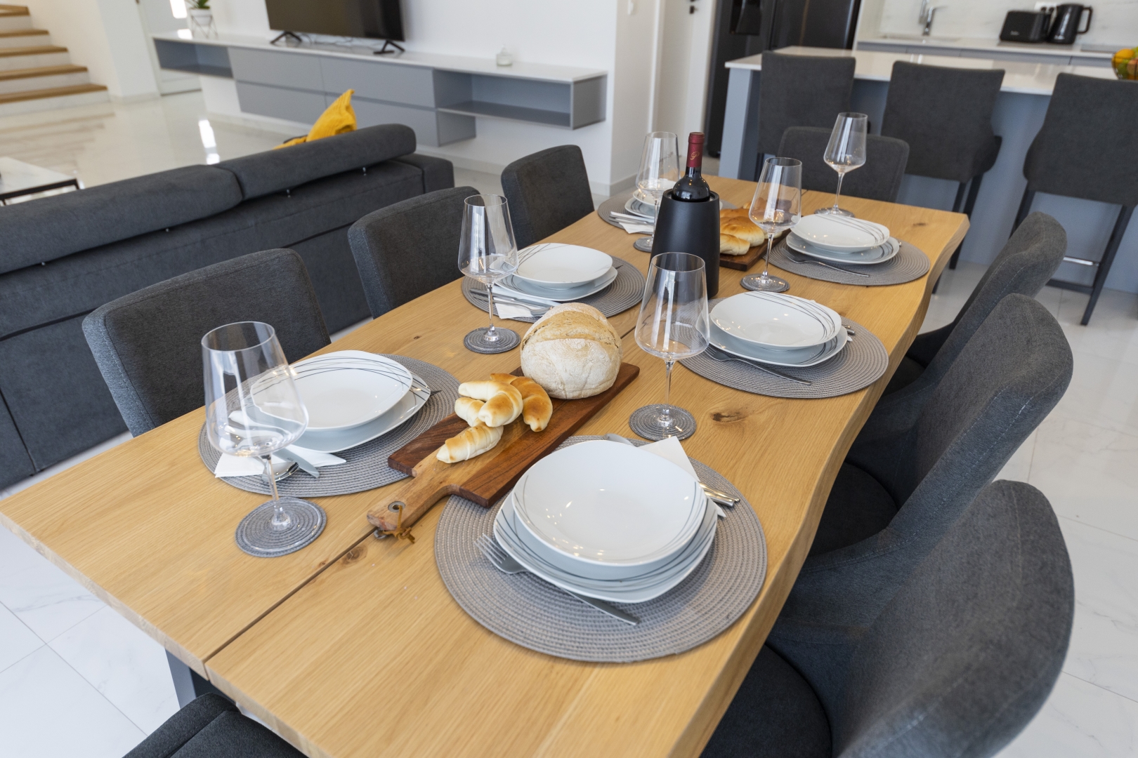 The fully equipped modern kitchen is fitted with high-quality kitchenware and includes a large preparation counter, as well as a generous dining table seating 8 guests.