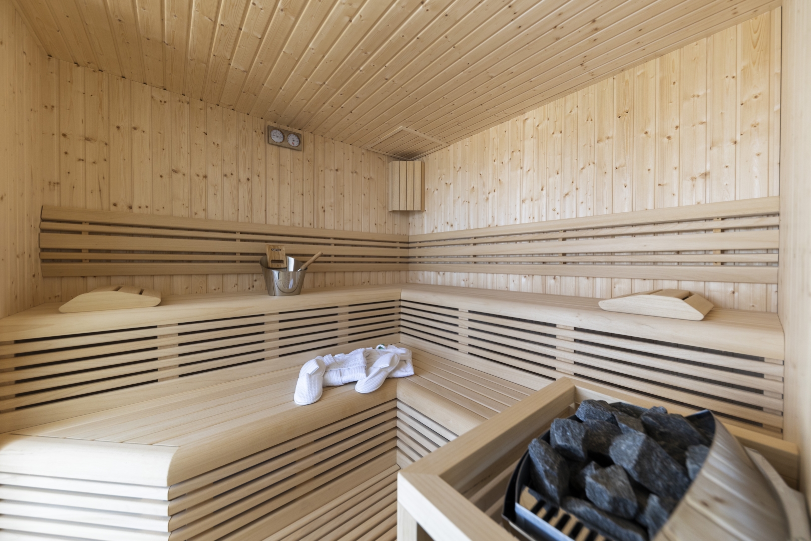 On this level, guests will also find a large sauna for up to 6 people, with a shower and toilet, and direct access to the garden and pool area. Additionally, there is a utility room equipped with a washing machine and dryer.