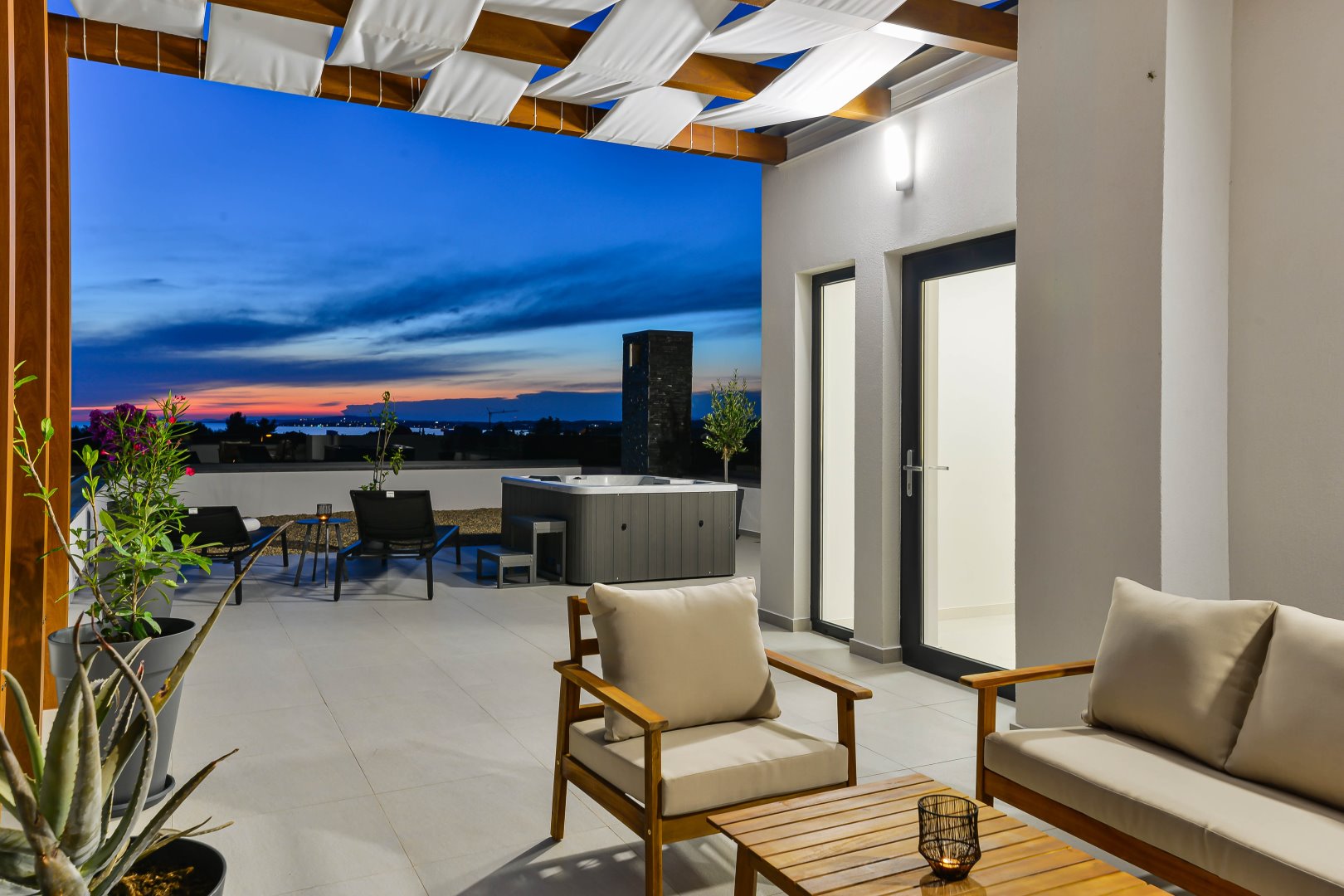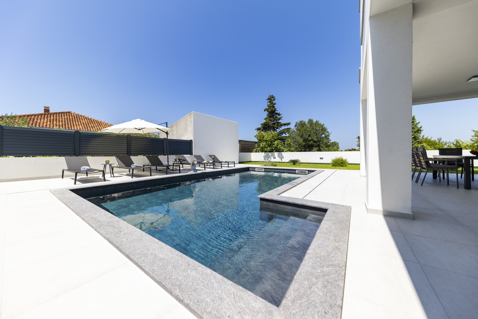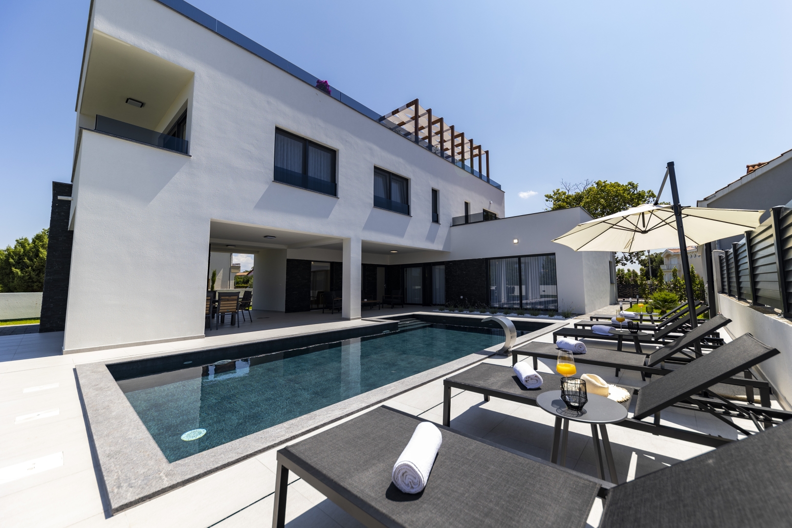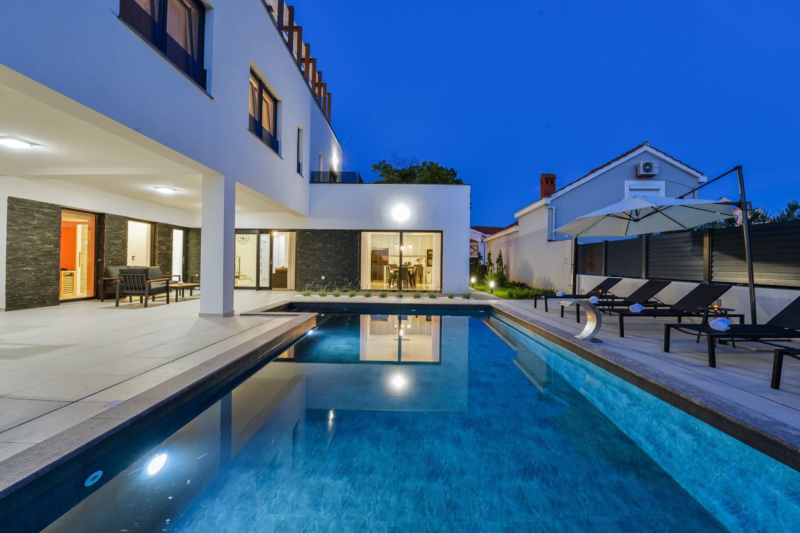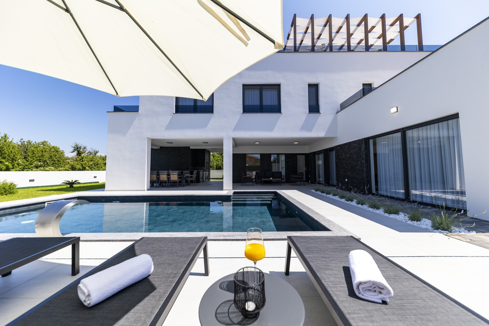 Villa Mila is a modern house with a heated swimming pool, sauna, and jacuzzi on a roof. The residence is placed in a calm and green area in Zaton. It has 3 bedrooms.