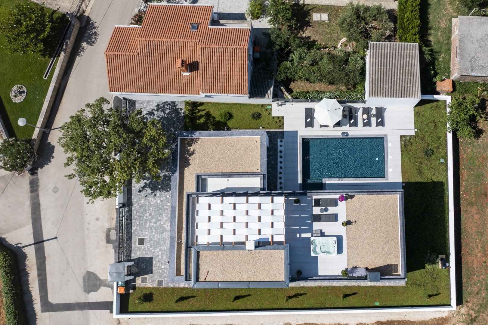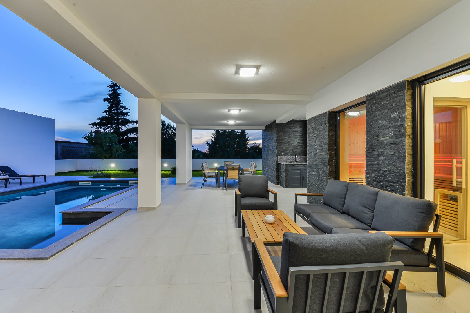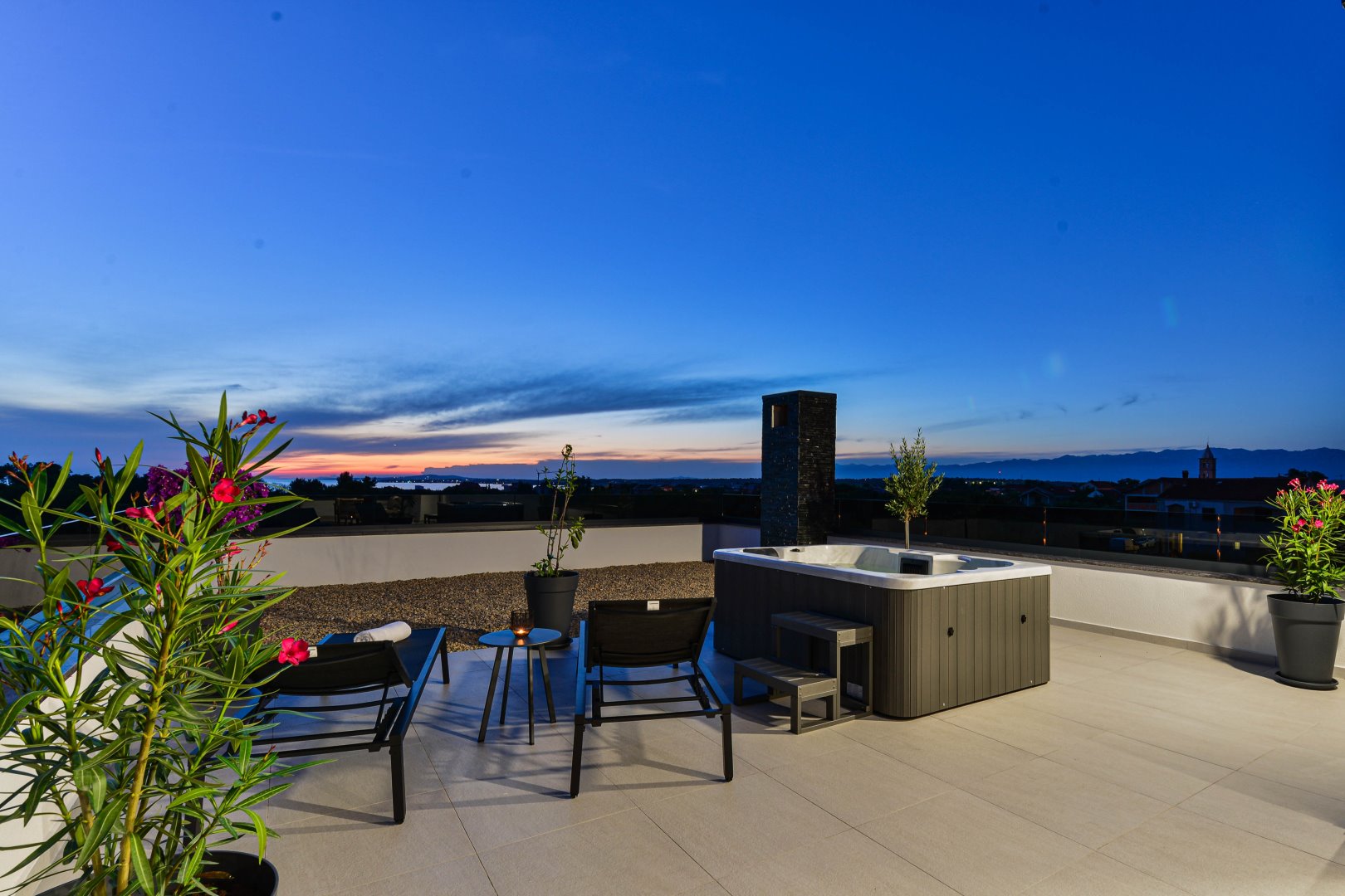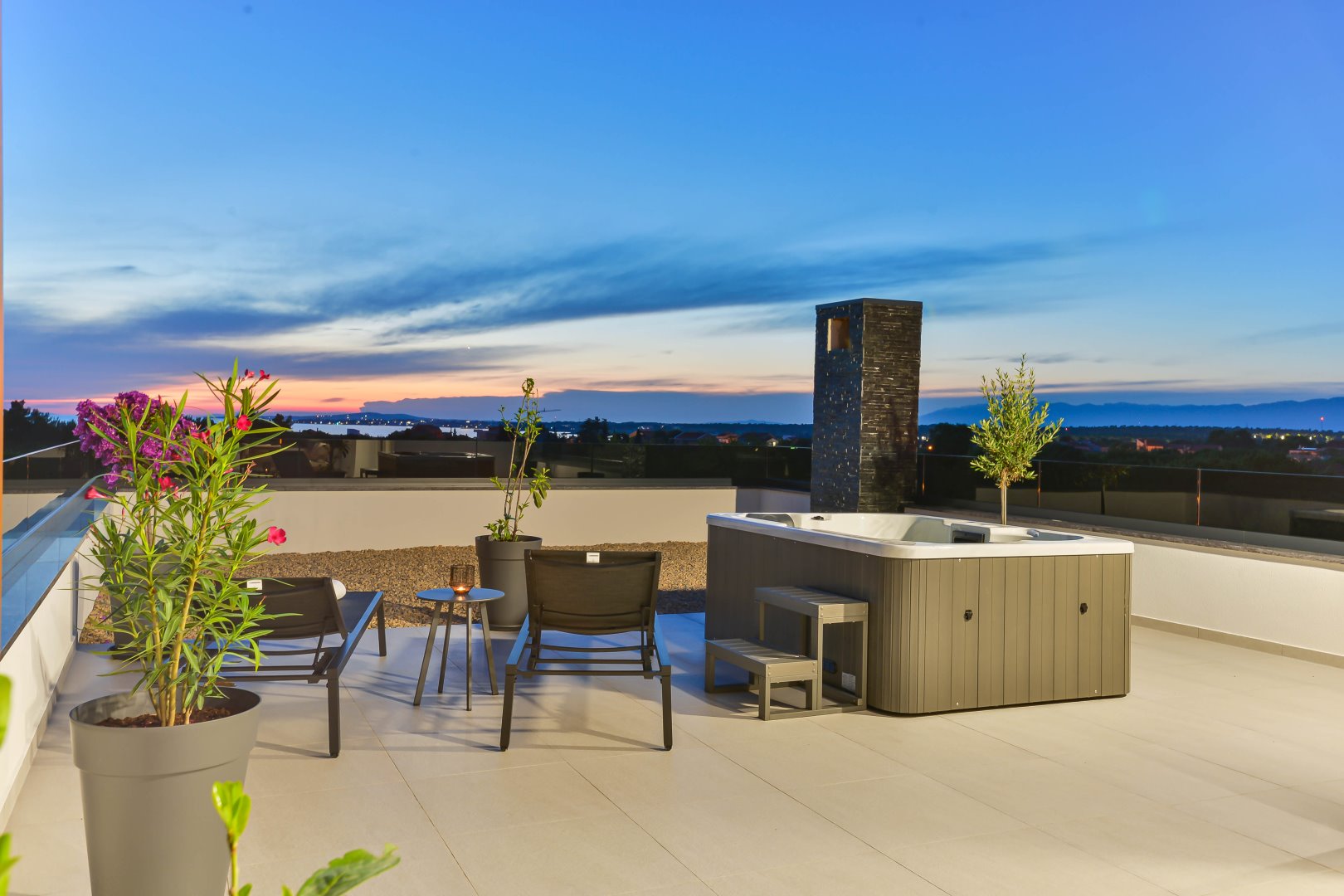 Villa Mila is a modern house with a heated swimming pool, sauna, and jacuzzi on a roof. The residence is placed in a calm and green area in Zaton. It has 3 bedrooms.