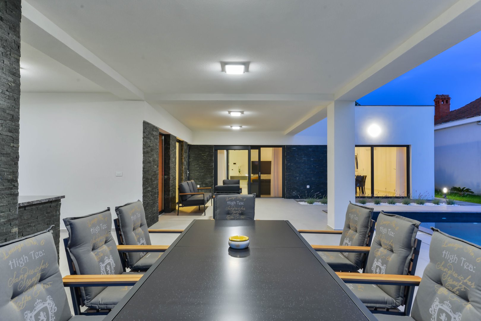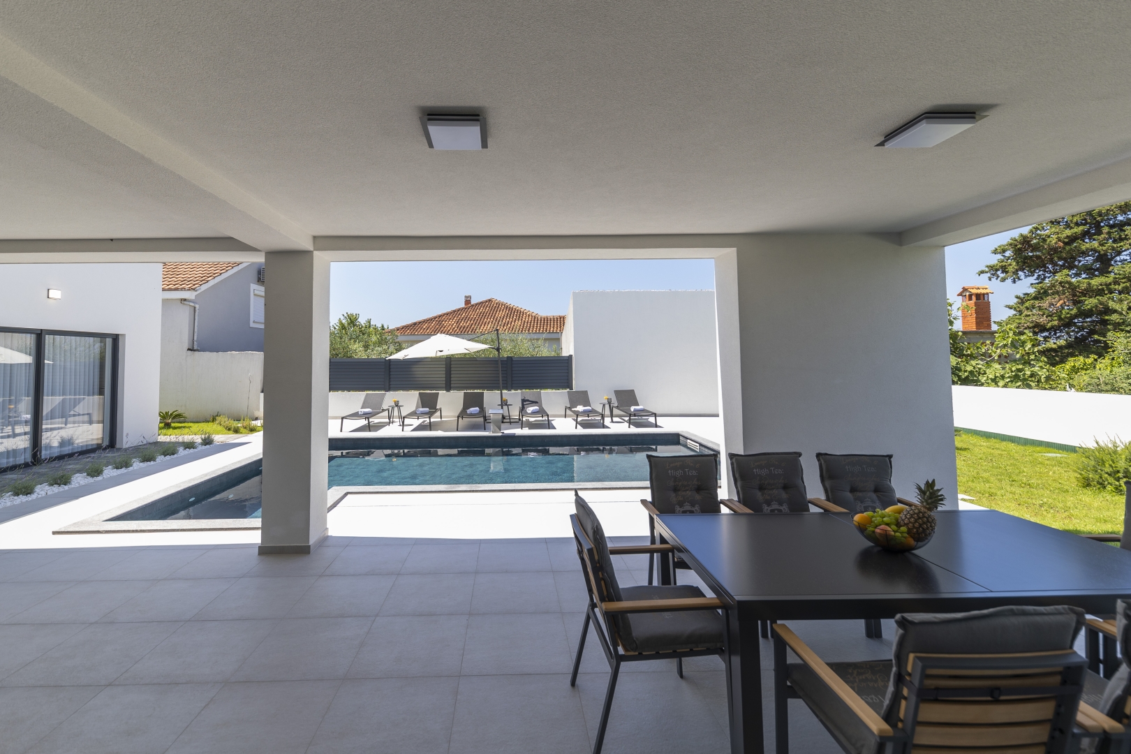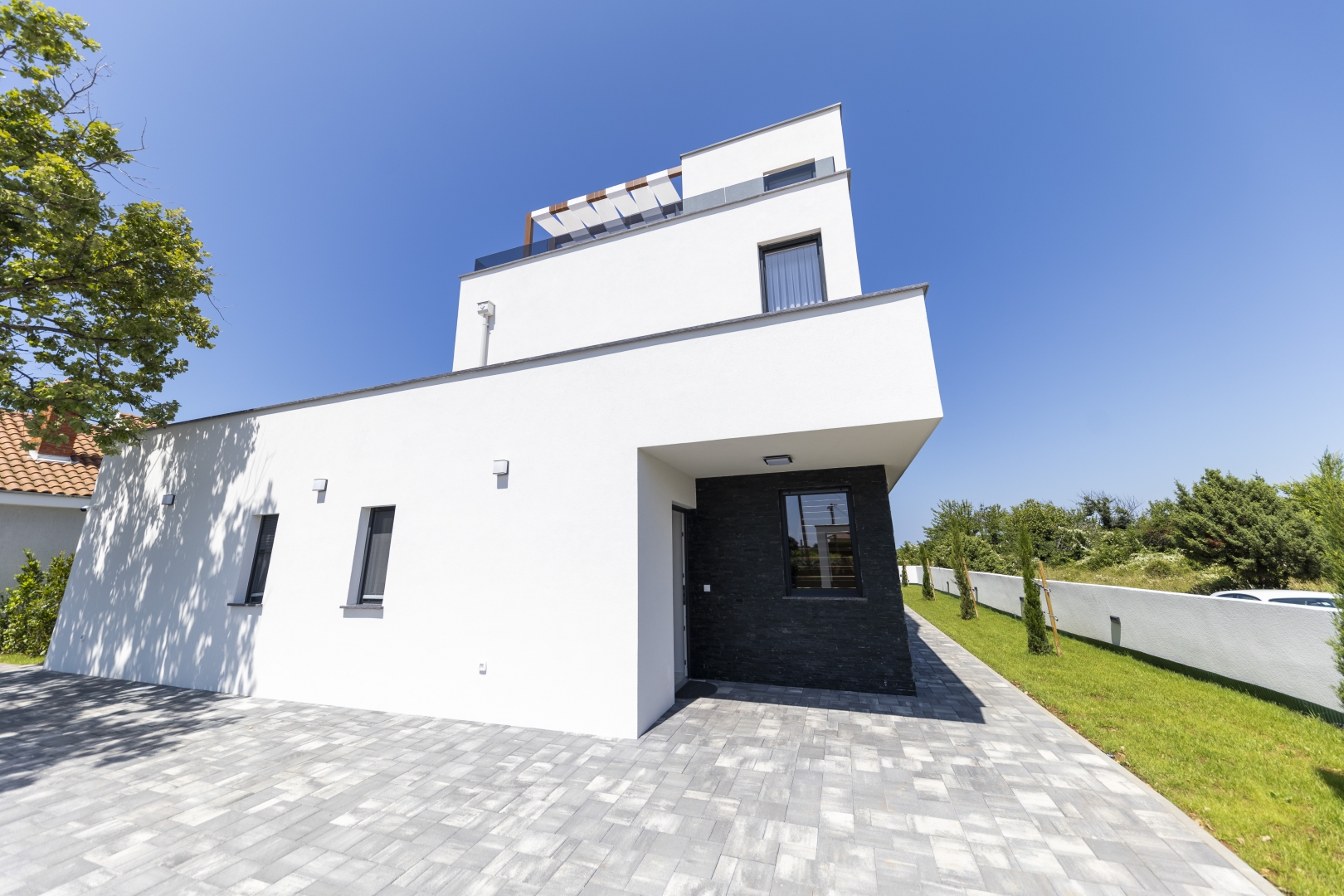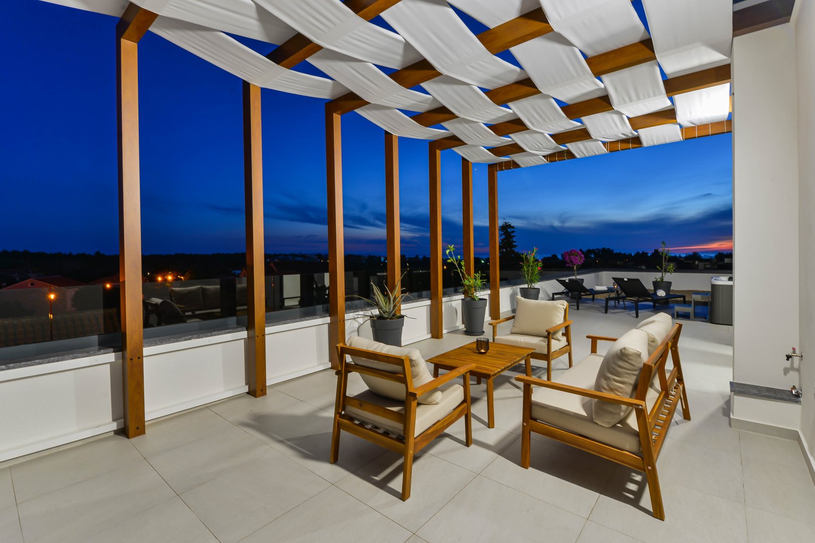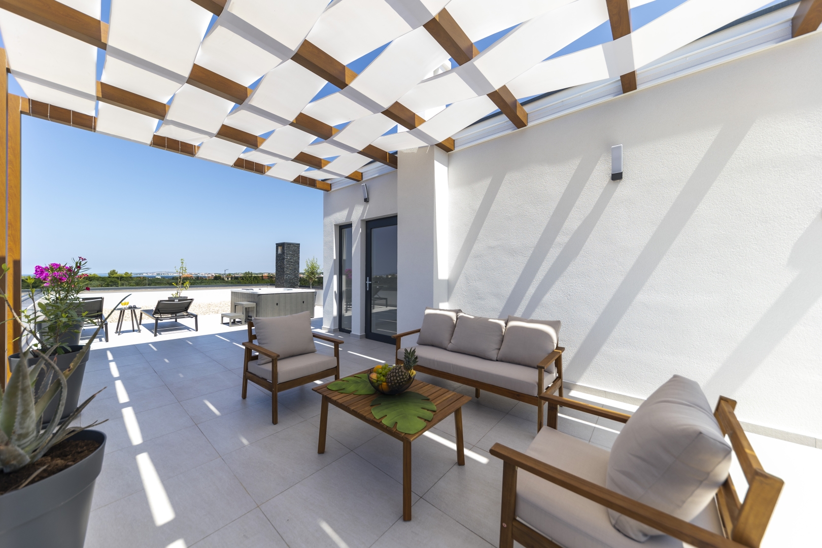 Villa Mila is a modern house with a heated swimming pool, sauna, and jacuzzi on a roof. The residence is placed in a calm and green area in Zaton. It has 3 bedrooms.