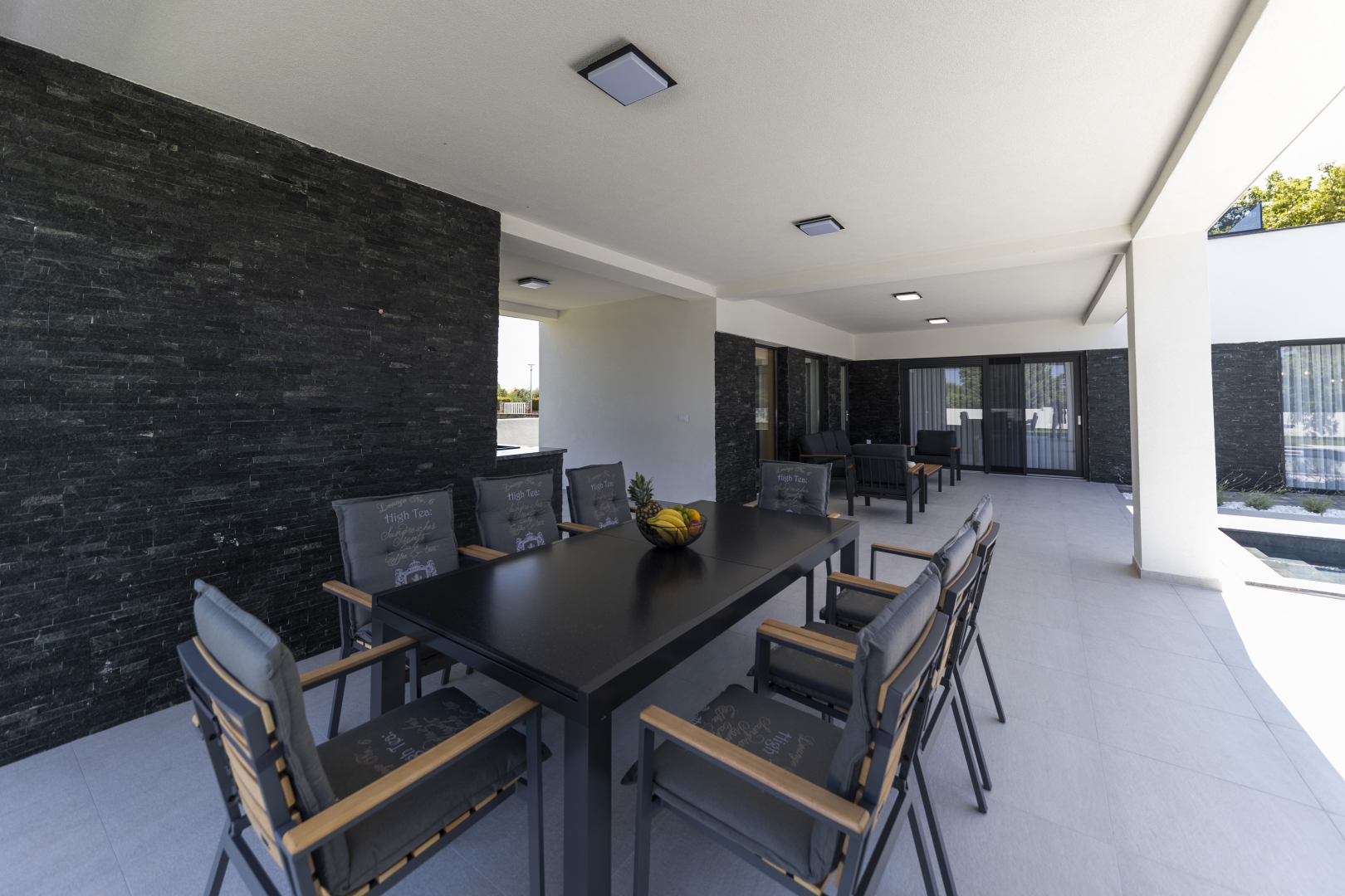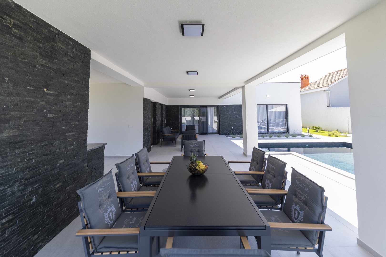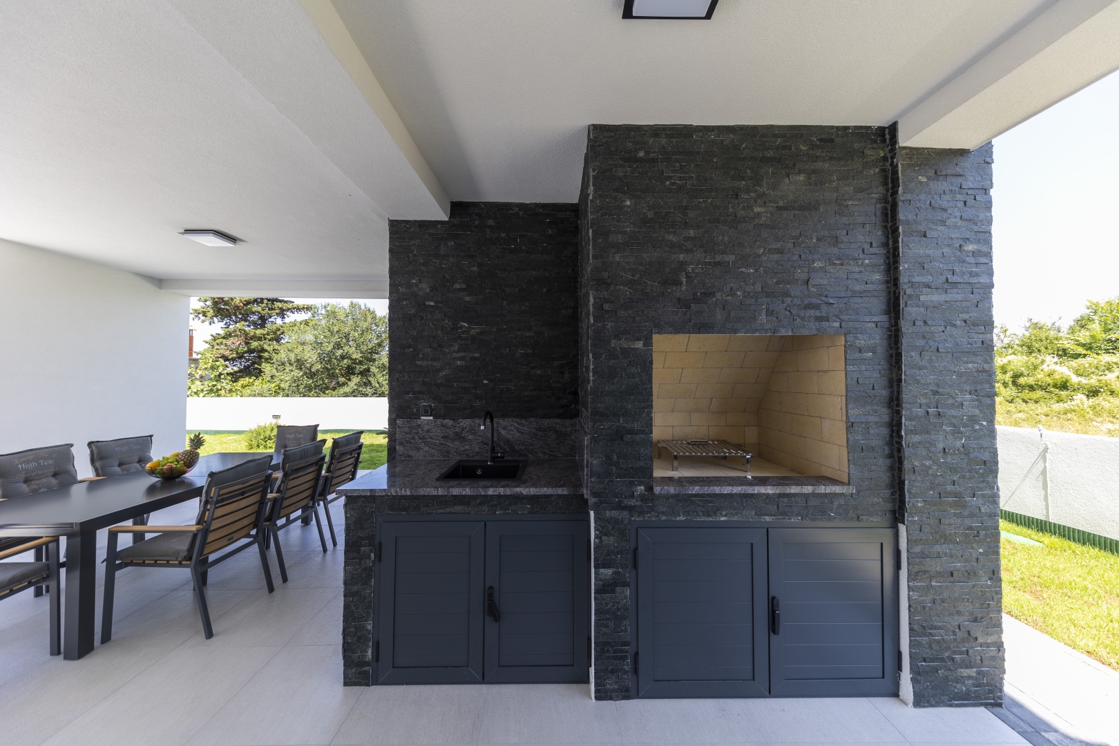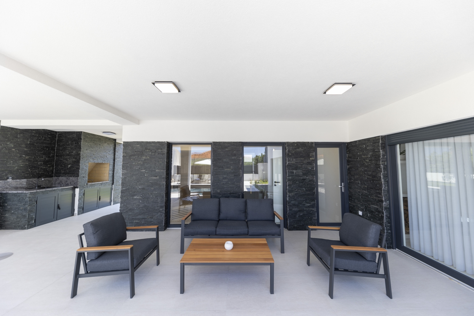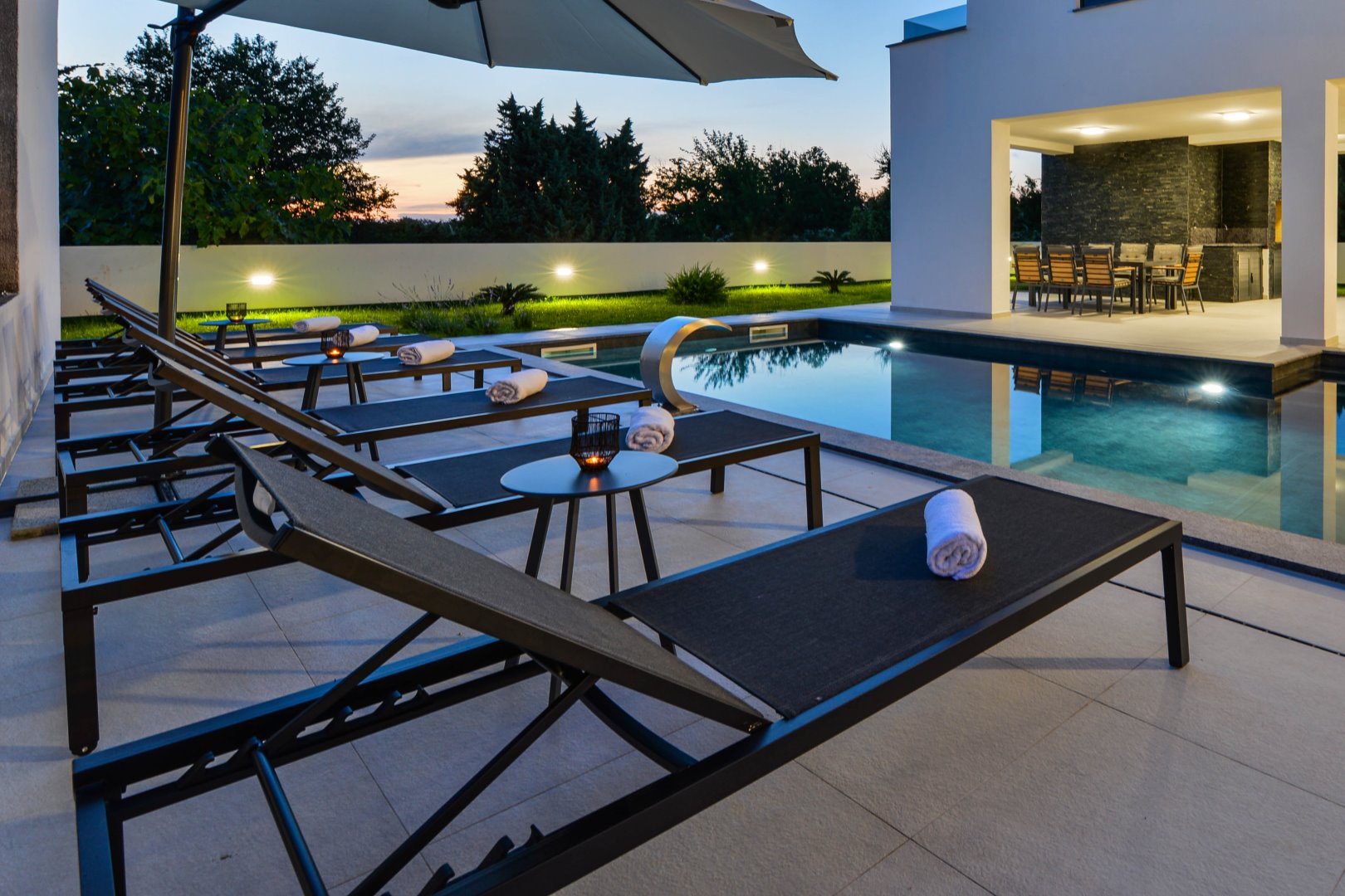 Next to the swimming pool and outdoor shower, guests can enjoy an outdoor dining area, a relaxation zone, as well as a fully equipped outdoor kitchen and barbecue.