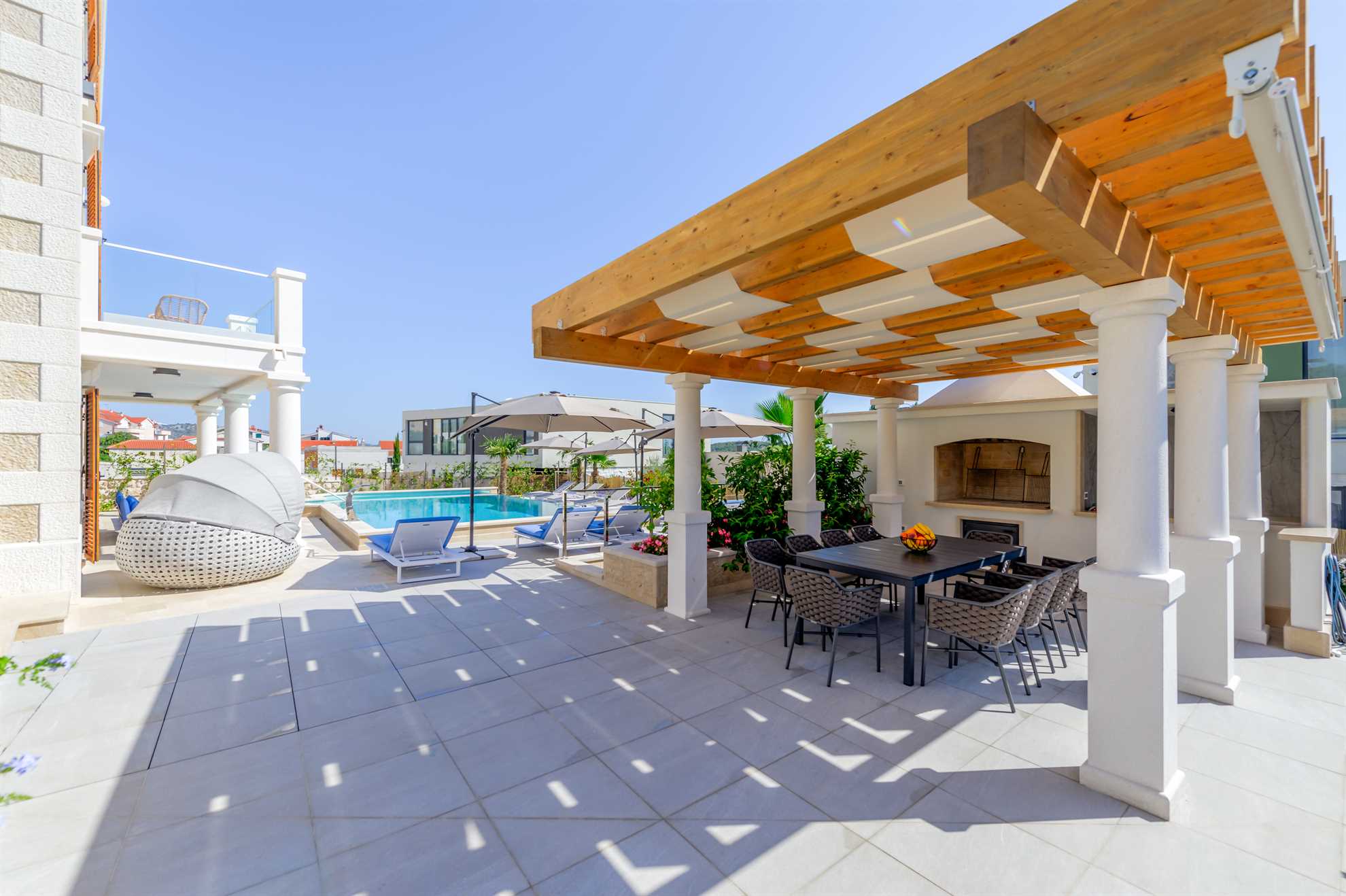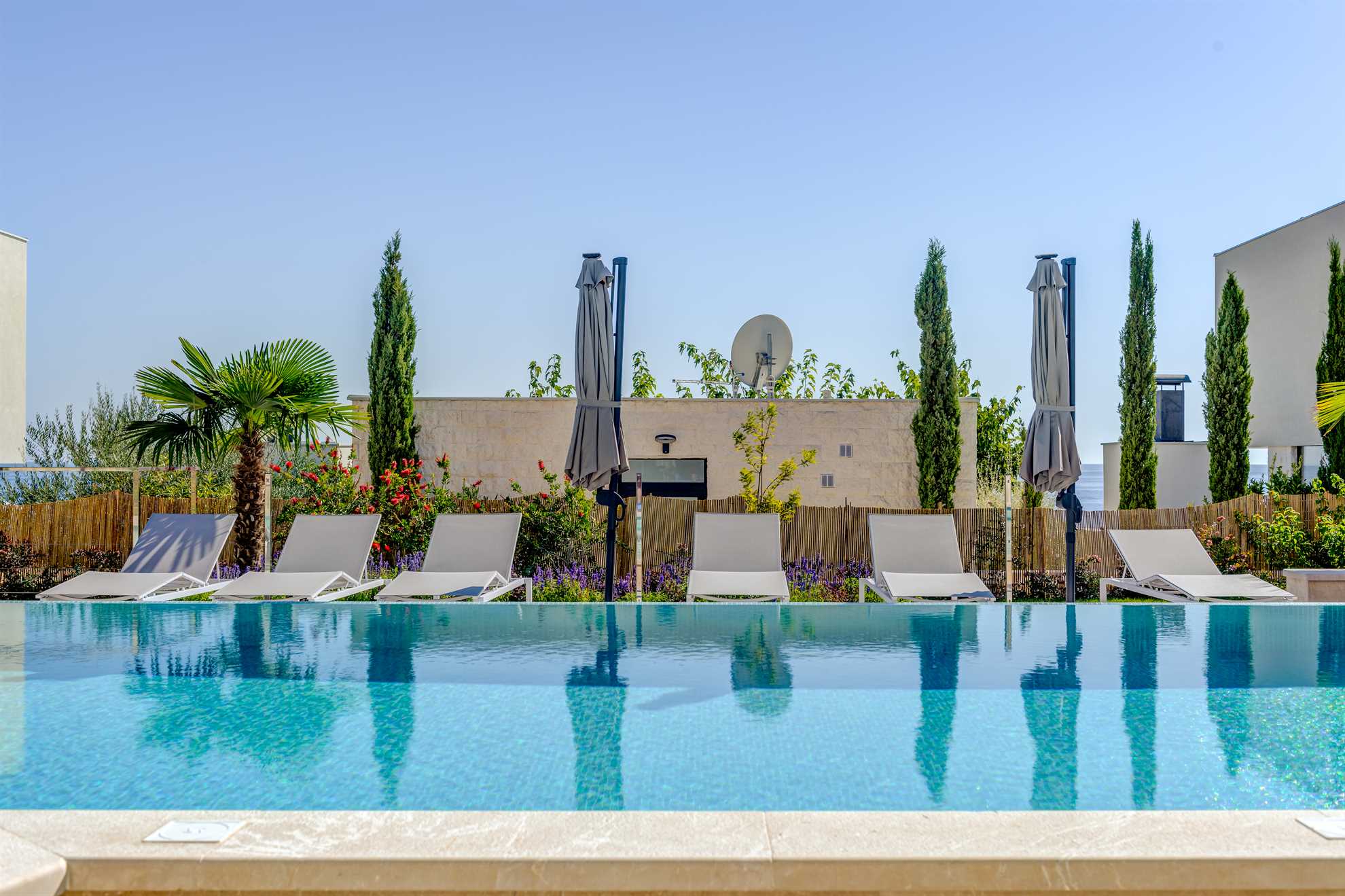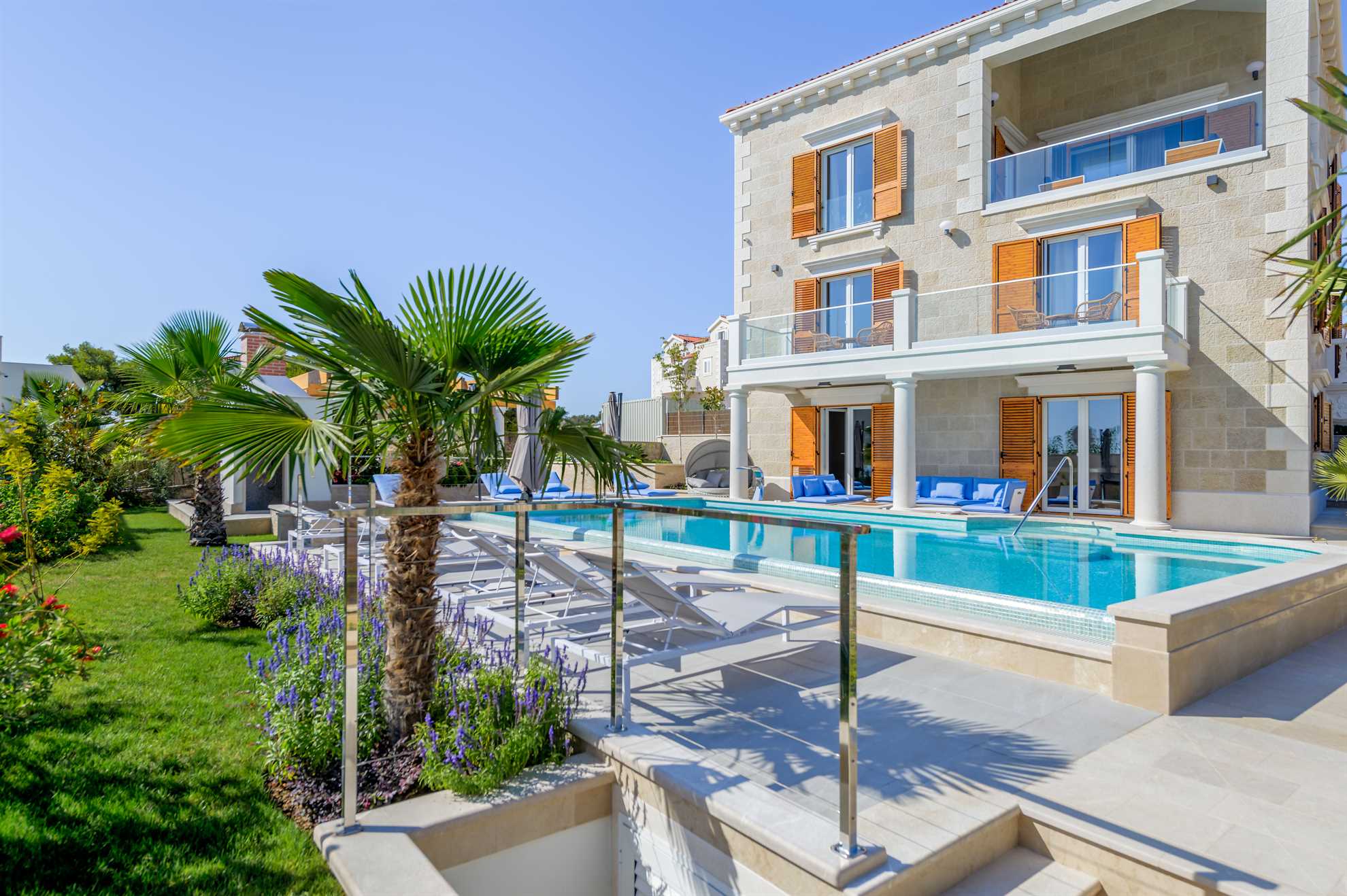 Beautiful new Villa Sea Pearl is a striking blend of traditional build with regional features and contemporary interior with top of the line facilities. Get ready to be impressed. The 500 m² interior is composed of three floors. Five ensuite bedrooms display king beds, quality bedding, flatscreen TVs, pleasing and rich color combinations and tasteful décor and for some, access to a balcony granting sea views. While all five bathrooms are truly exquisite using the finest materials and a clever theme unique to each of the bedrooms, in addition to a shower lucky guest in the master bedroom gets to indulge in a whirlpool bathtub. Sleeping areas are found on the upper floors while a fully equipped kitchen, a dining area and a living room are all on the ground floor with 2 sets of staircase connecting the three levels. On the ground floor is also a luxurious spa with a sauna, jacuzzi and a specious gym packed with exercise equipment and a quiet massage area. From here you will find yourself outside greeted by 50 m² heated pool surrounded by numerous sun loungers and a meticulous garden. Keeping with the traditional theme of the region there is a built in BBQ with an outdoor kitchen and a large shaded dining table. Covered lounge areas ensure sunset watching a comfortable experience. Welcome to Sea Pearl, a truly unique yet authentic Croatian holiday destination.