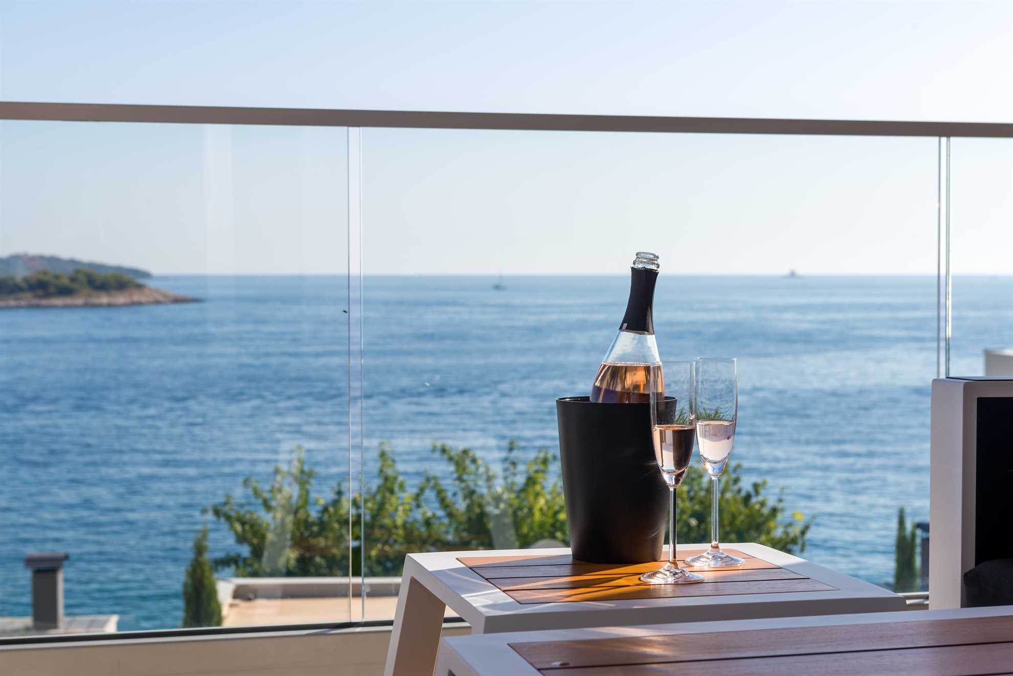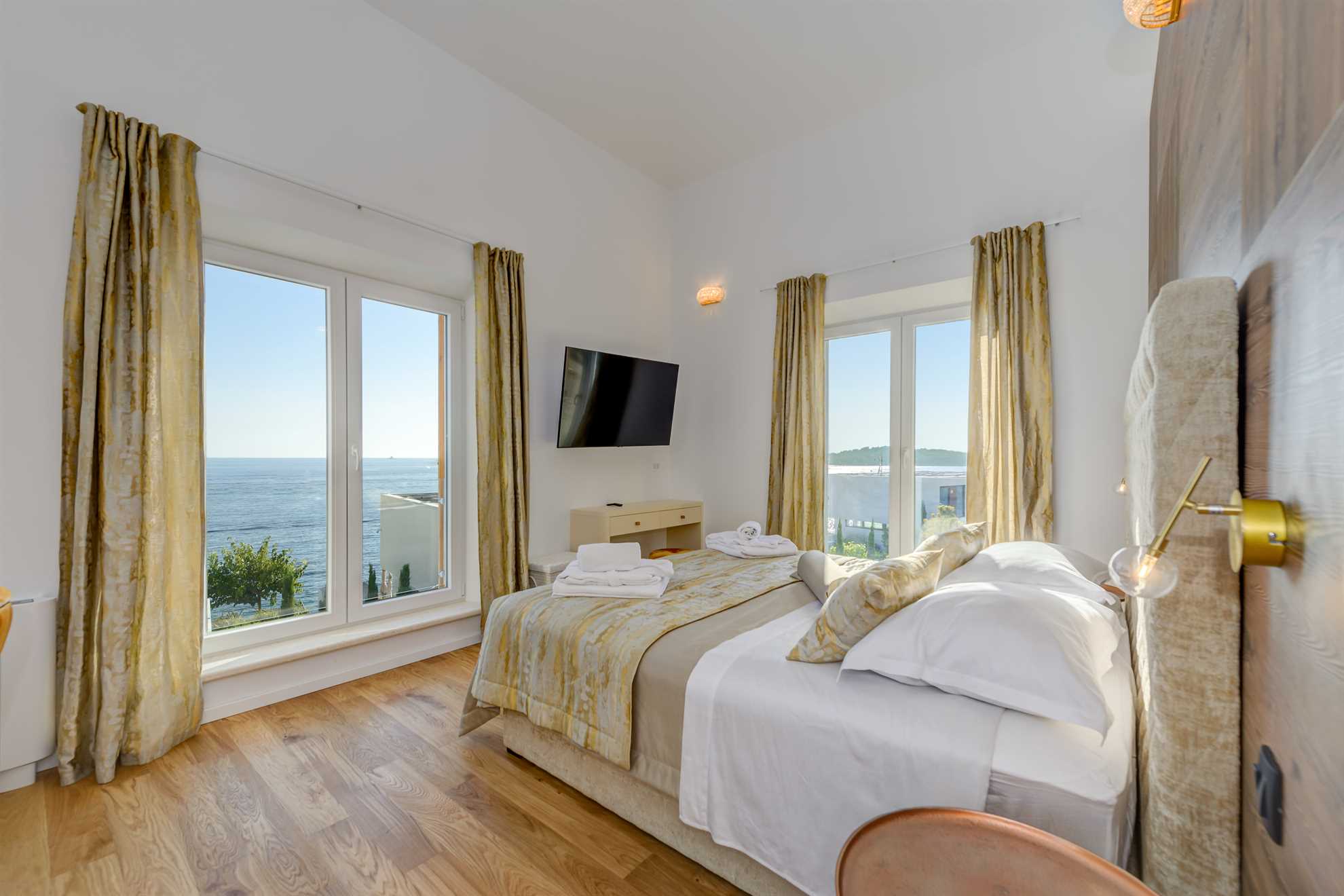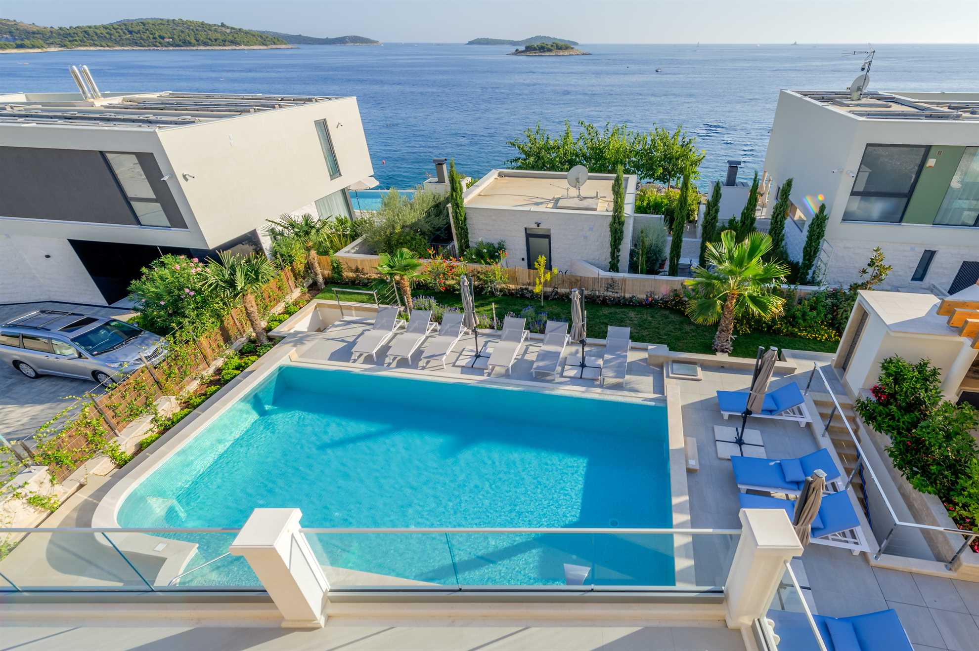 Beautiful new Villa Sea Pearl is a striking blend of traditional build with regional features and contemporary interior with top of the line facilities. Get ready to be impressed. The 500 m² interior is composed of three floors. Five ensuite bedrooms display king beds, quality bedding, flatscreen TVs, pleasing and rich color combinations and tasteful décor and for some, access to a balcony granting sea views. While all five bathrooms are truly exquisite using the finest materials and a clever theme unique to each of the bedrooms, in addition to a shower lucky guest in the master bedroom gets to indulge in a whirlpool bathtub. Sleeping areas are found on the upper floors while a fully equipped kitchen, a dining area and a living room are all on the ground floor with 2 sets of staircase connecting the three levels. On the ground floor is also a luxurious spa with a sauna, jacuzzi and a specious gym packed with exercise equipment and a quiet massage area. From here you will find yourself outside greeted by 50 m² heated pool surrounded by numerous sun loungers and a meticulous garden. Keeping with the traditional theme of the region there is a built in BBQ with an outdoor kitchen and a large shaded dining table. Covered lounge areas ensure sunset watching a comfortable experience. Welcome to Sea Pearl, a truly unique yet authentic Croatian holiday destination.