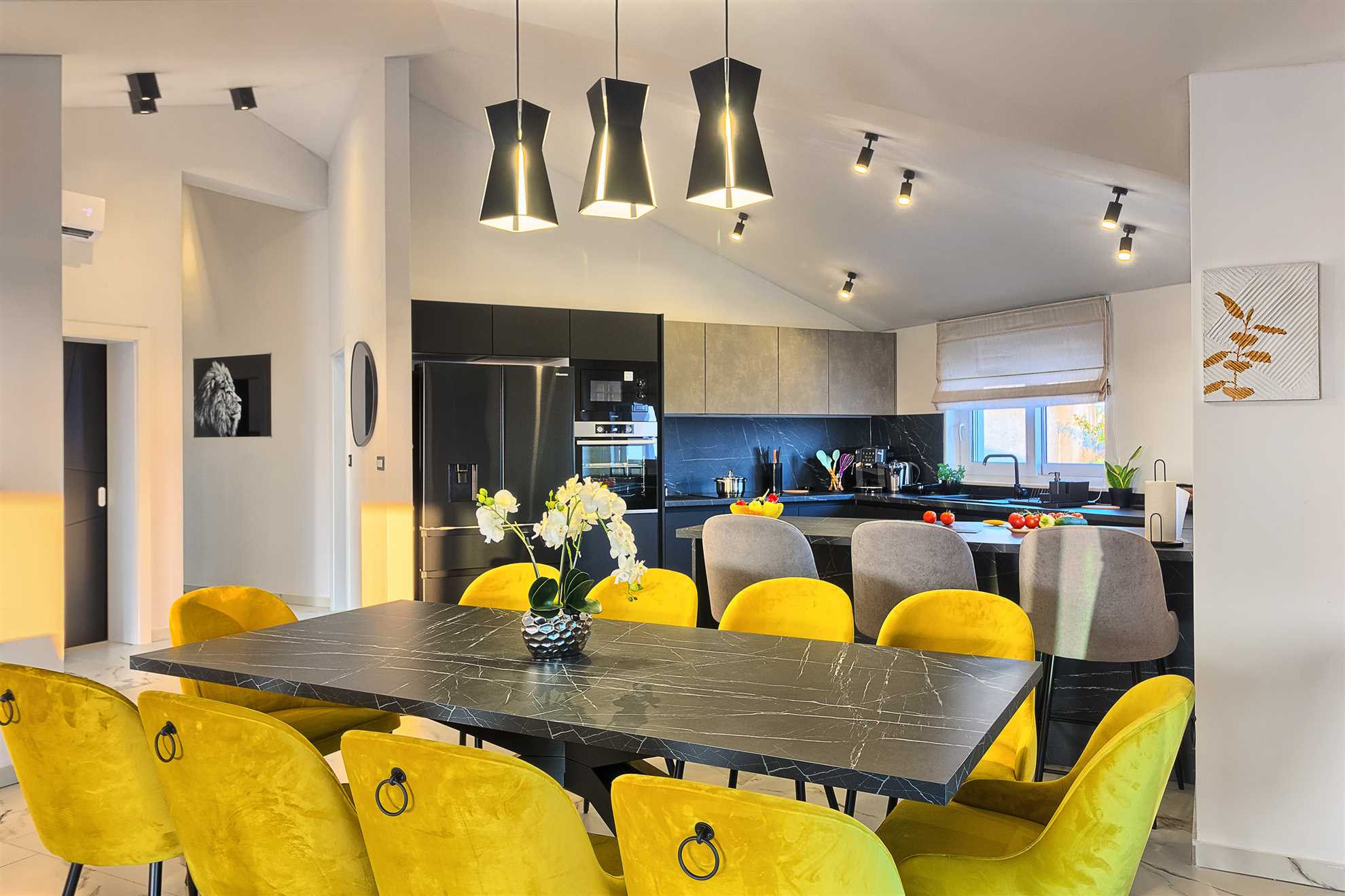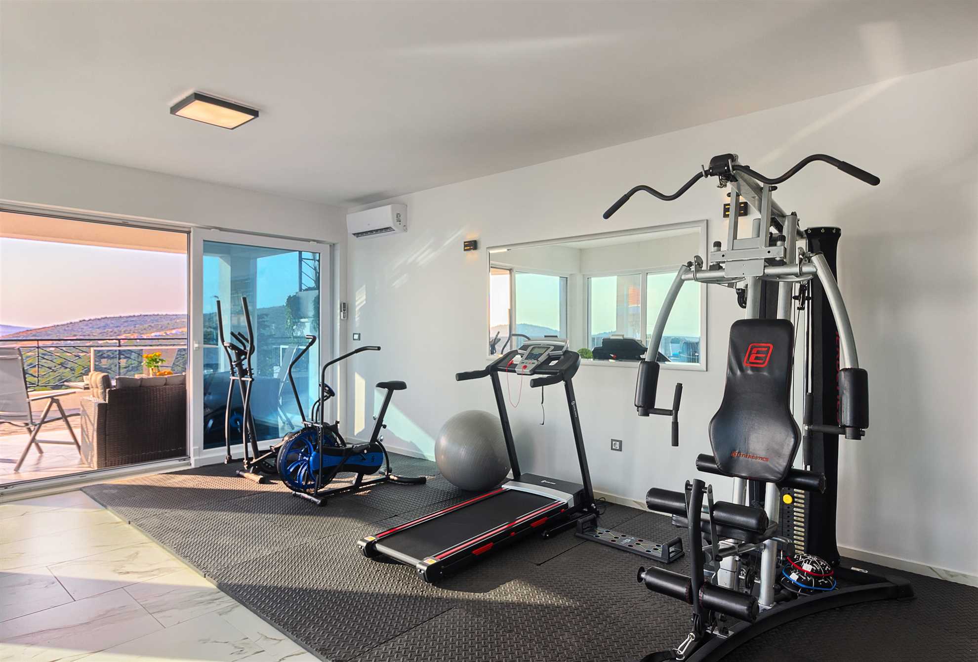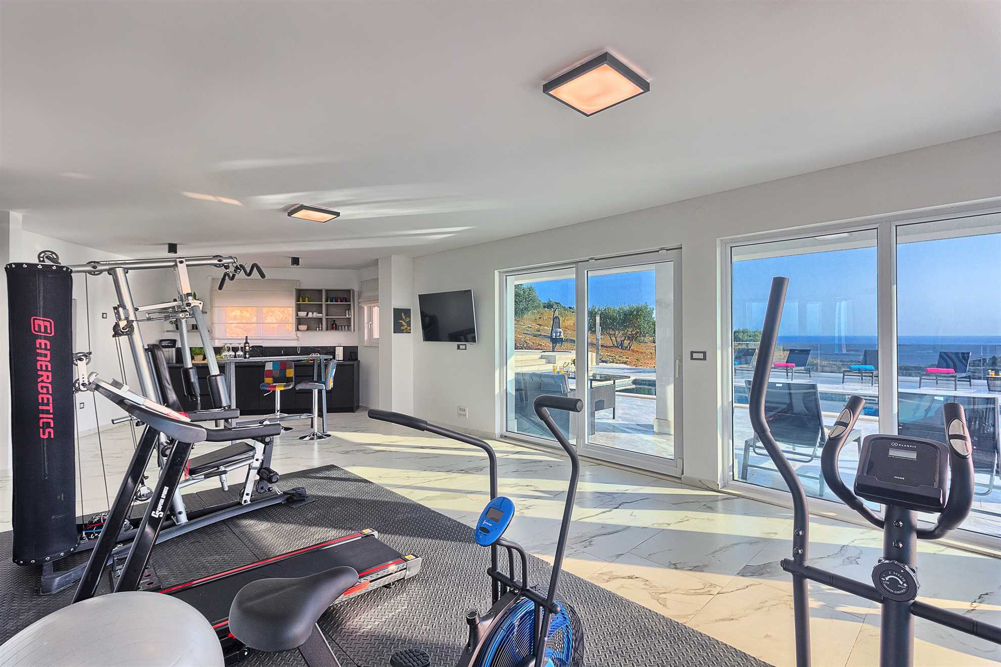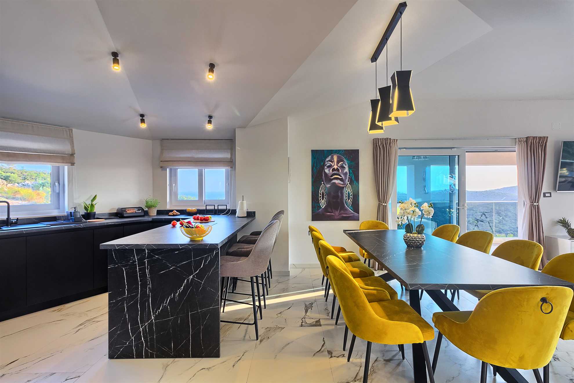 Welcome to Villa Moderna, a newly built architectural gem that beautifully blends contemporary design and a warm and inviting ambiance with focus on functionality. As you step inside, you are greeted by cool tile floors that lead through the open concept living space adorned with chic colors and funky art pieces, creating a refreshing and vibrant atmosphere. Two levels occupy the 340 m2 specious interior, each level with its own entrance. The upper level displays an open plan living room with an oversized plush sofa adjacent to the kitchen and a dining room, as well as 3 of the bedrooms (two with a double bed each, and one with 2 twin beds). Floor to ceiling windows and access to multiple balconies grant spectacular views of the sea and the serene nature around. Lower lever houses a gym, additional kitchenette, and the 3 remaining bedrooms (two with a double bed each, and one with 2 twin beds). From here walk out onto the luxurious terrace leading to an L shaped heated pool surrounded by sun loungers making this the perfect spot for soaking up the sun, or sharing a meal while enjoying breathtaking sunsets in an outdoor dining area. Electric BBQ is provided for your enjoyment. Wheather you are traveling wih family, friends or both Villa Moderna ensures a delightful escape for those seeking a harmonious blend of contemporary living, natural beauty and carefree holiday.