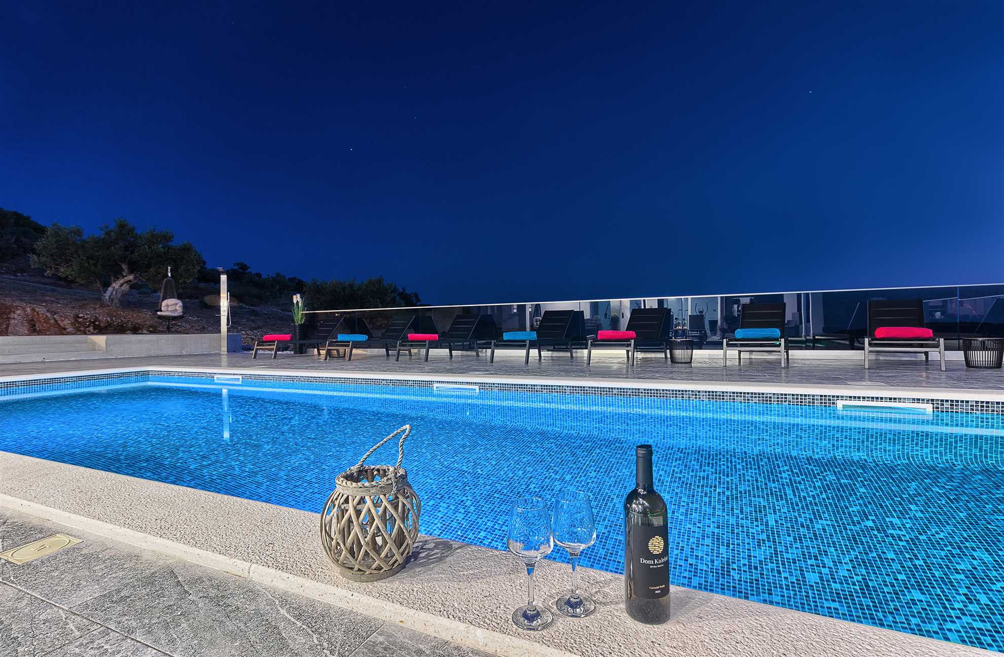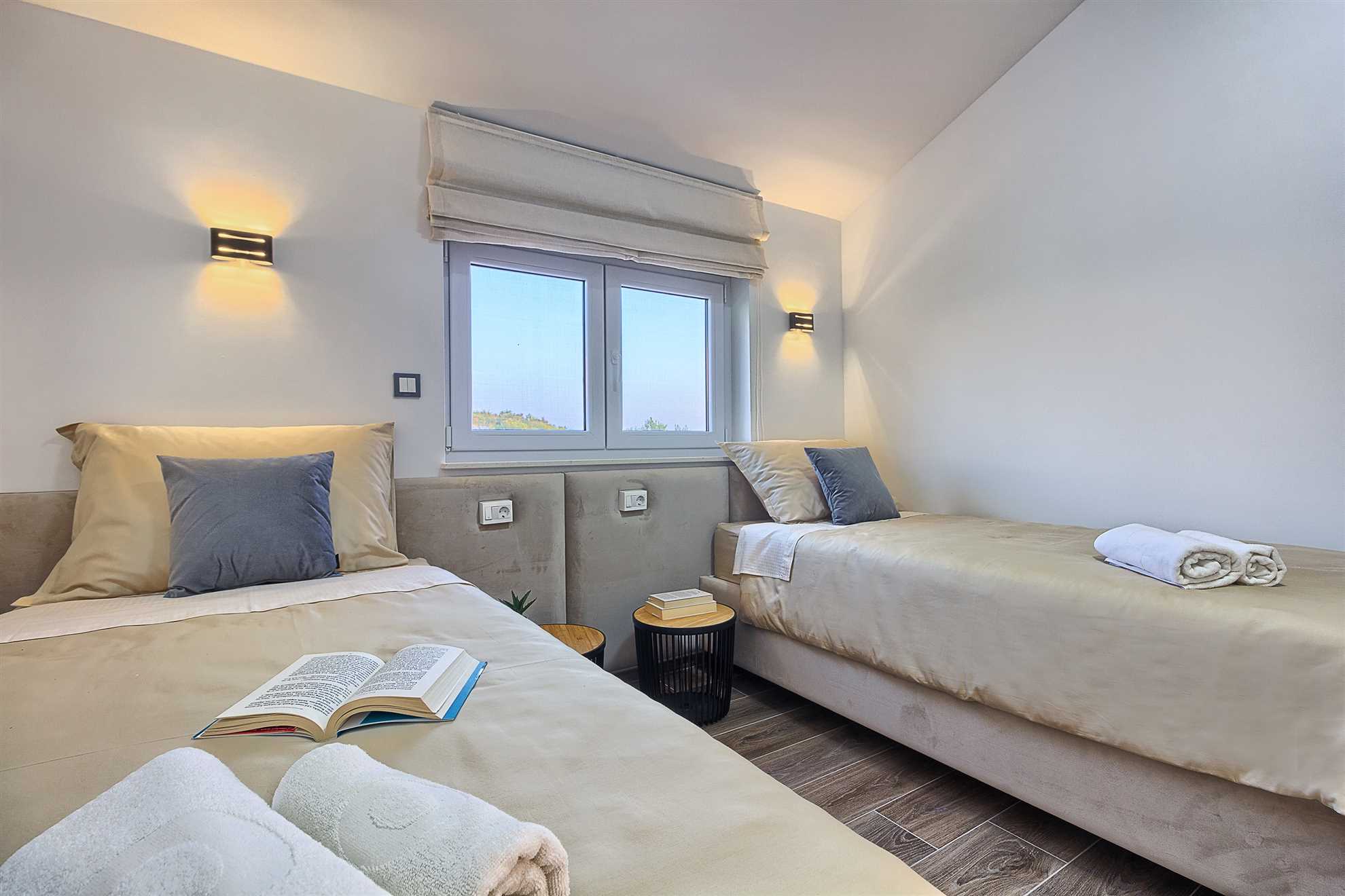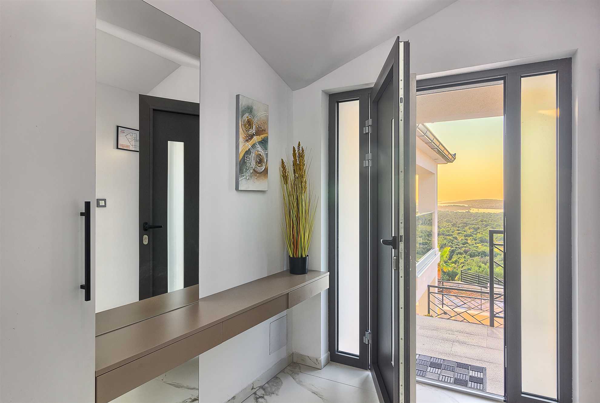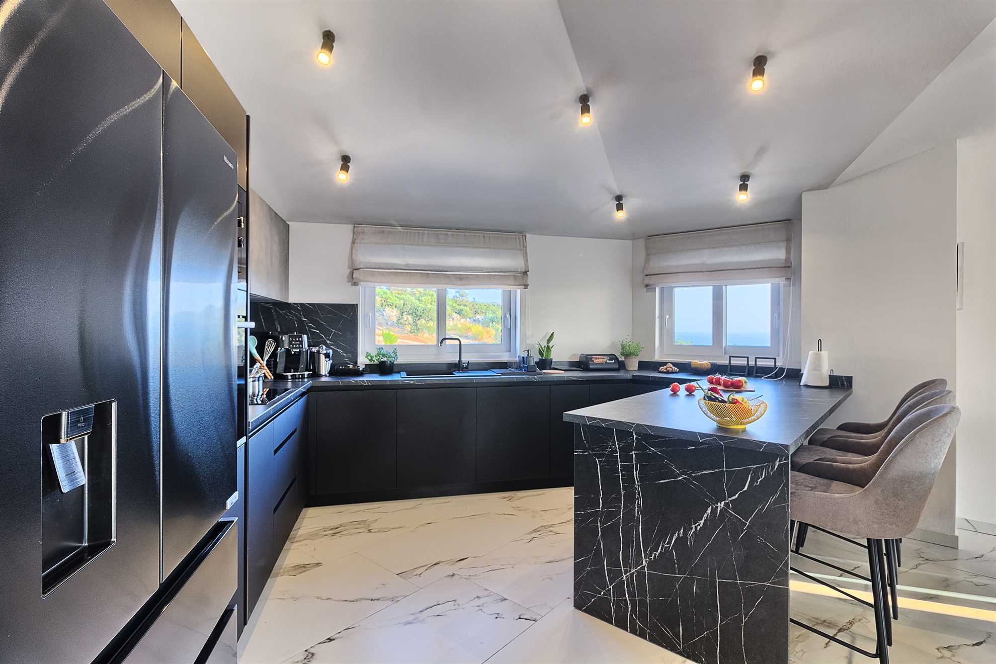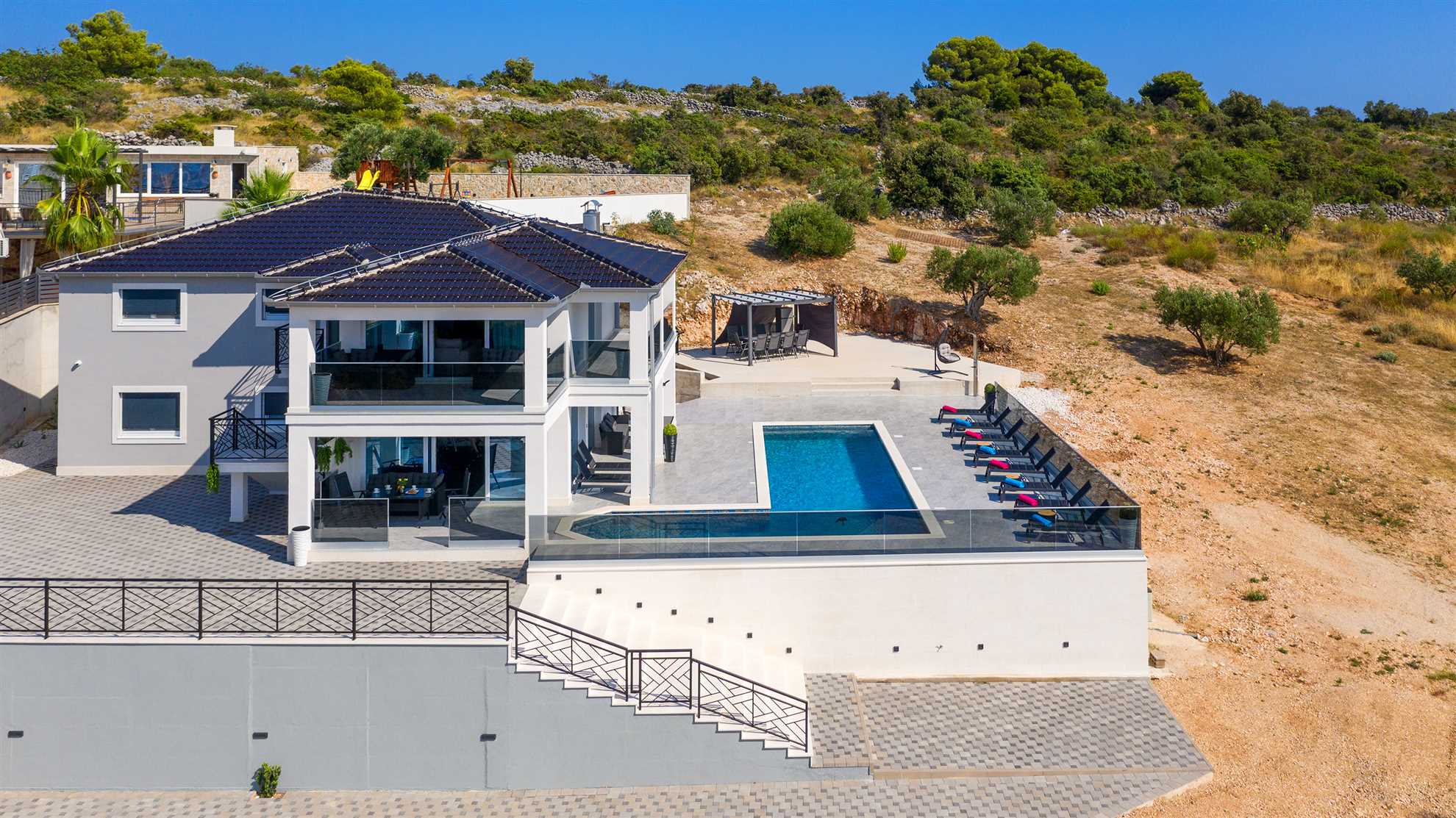 Welcome to Villa Moderna, a newly built architectural gem that beautifully blends contemporary design and a warm and inviting ambiance with focus on functionality. As you step inside, you are greeted by cool tile floors that lead through the open concept living space adorned with chic colors and funky art pieces, creating a refreshing and vibrant atmosphere. Two levels occupy the 340 m2 specious interior, each level with its own entrance. The upper level displays an open plan living room with an oversized plush sofa adjacent to the kitchen and a dining room, as well as 3 of the bedrooms (two with a double bed each, and one with 2 twin beds). Floor to ceiling windows and access to multiple balconies grant spectacular views of the sea and the serene nature around. Lower lever houses a gym, additional kitchenette, and the 3 remaining bedrooms (two with a double bed each, and one with 2 twin beds). From here walk out onto the luxurious terrace leading to an L shaped heated pool surrounded by sun loungers making this the perfect spot for soaking up the sun, or sharing a meal while enjoying breathtaking sunsets in an outdoor dining area. Electric BBQ is provided for your enjoyment. Wheather you are traveling wih family, friends or both Villa Moderna ensures a delightful escape for those seeking a harmonious blend of contemporary living, natural beauty and carefree holiday.