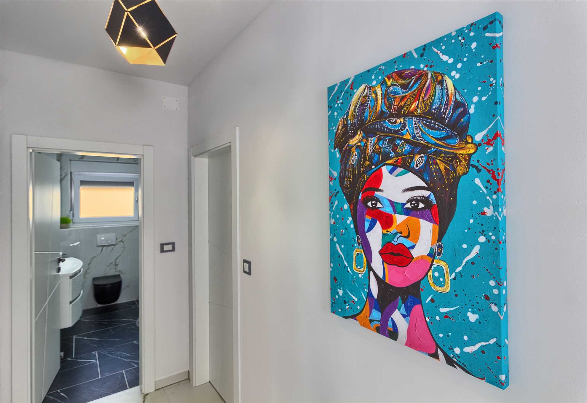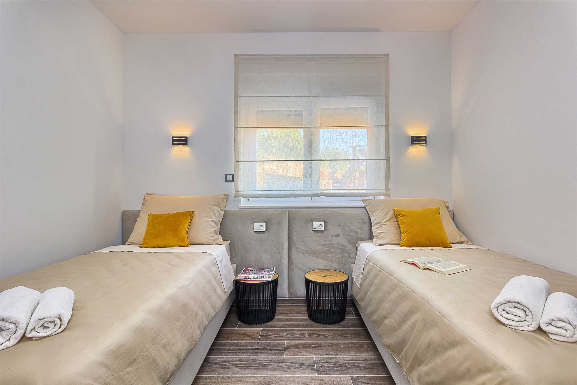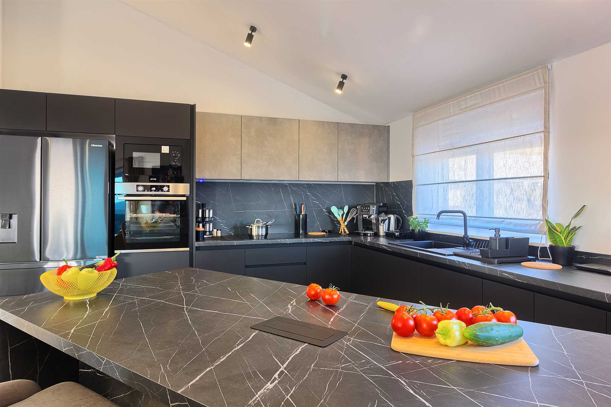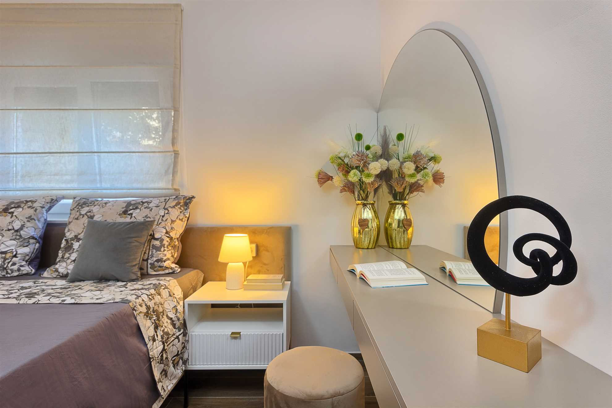 Welcome to Villa Moderna, a newly built architectural gem that beautifully blends contemporary design and a warm and inviting ambiance with focus on functionality. As you step inside, you are greeted by cool tile floors that lead through the open concept living space adorned with chic colors and funky art pieces, creating a refreshing and vibrant atmosphere. Two levels occupy the 340 m2 specious interior, each level with its own entrance. The upper level displays an open plan living room with an oversized plush sofa adjacent to the kitchen and a dining room, as well as 3 of the bedrooms (two with a double bed each, and one with 2 twin beds). Floor to ceiling windows and access to multiple balconies grant spectacular views of the sea and the serene nature around. Lower lever houses a gym, additional kitchenette, and the 3 remaining bedrooms (two with a double bed each, and one with 2 twin beds). From here walk out onto the luxurious terrace leading to an L shaped heated pool surrounded by sun loungers making this the perfect spot for soaking up the sun, or sharing a meal while enjoying breathtaking sunsets in an outdoor dining area. Electric BBQ is provided for your enjoyment. Wheather you are traveling wih family, friends or both Villa Moderna ensures a delightful escape for those seeking a harmonious blend of contemporary living, natural beauty and carefree holiday.