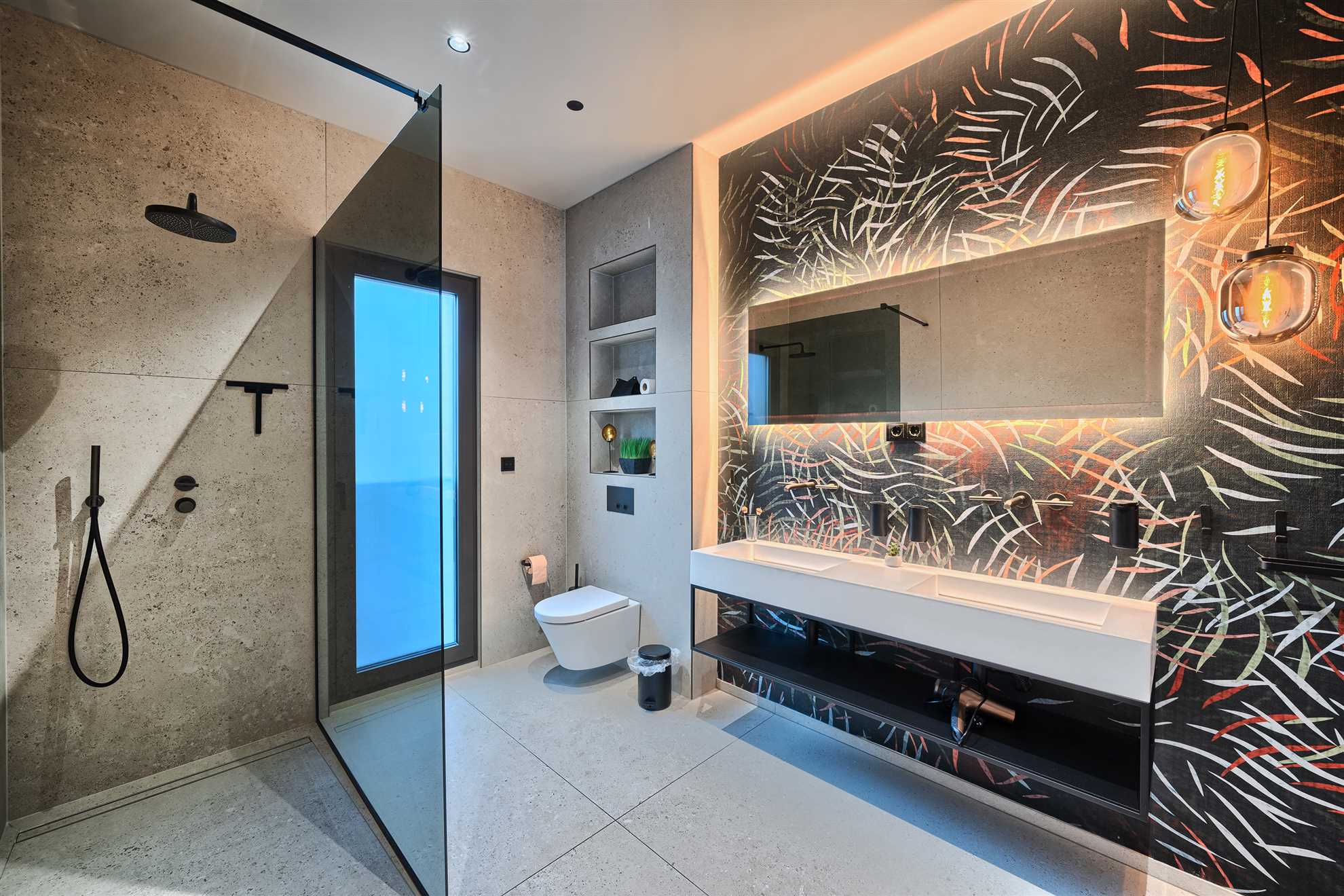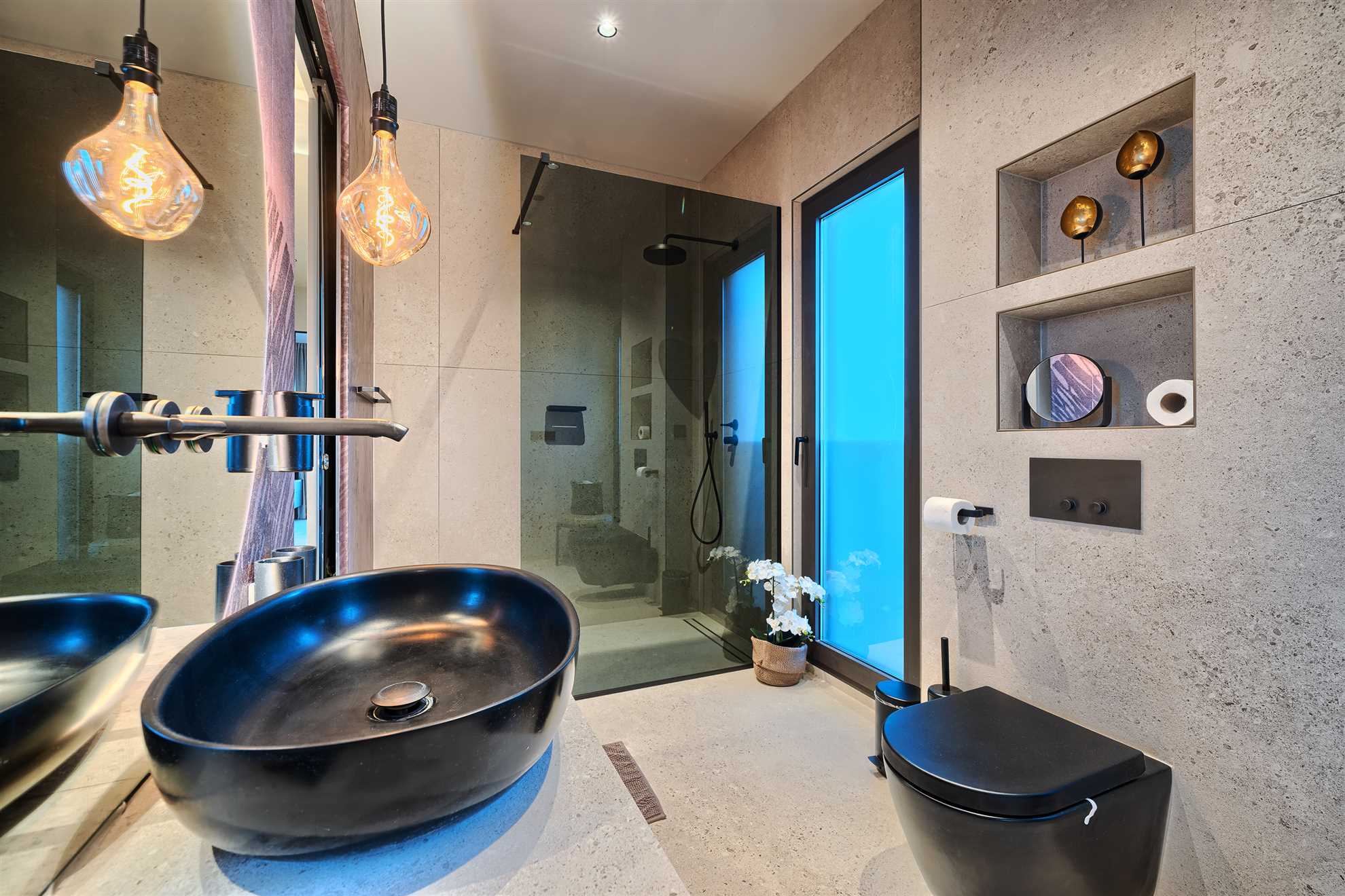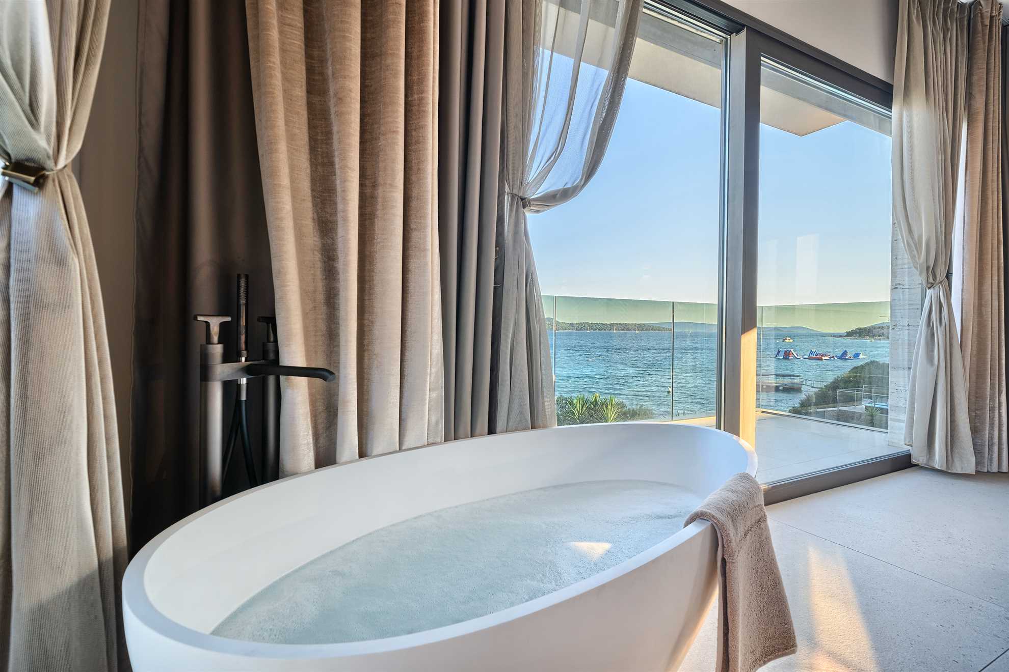 Equally impressive interior unveils into open plan expansive living room featuring comfortable seating area and a dining room with a table for 10 guests. Natural light floods the ample rooms through floor-to-ceiling windows, framing stunning views of the sea from every corner. Stylish kitchen with a central island is perfectly equipped for all your culinary needs. Four ensuite bedrooms offer sea views, balcony, and flat screen TVs. Each bedroom offers something special… a claw foot tub, a walk in shower, or an easy pool access. Whether you are here with friends, family, or both, Villa Marvel on the Sea provides optimum relaxation, indulgent luxury and close proximity to conveniences and cultural opportunities. Welcome!